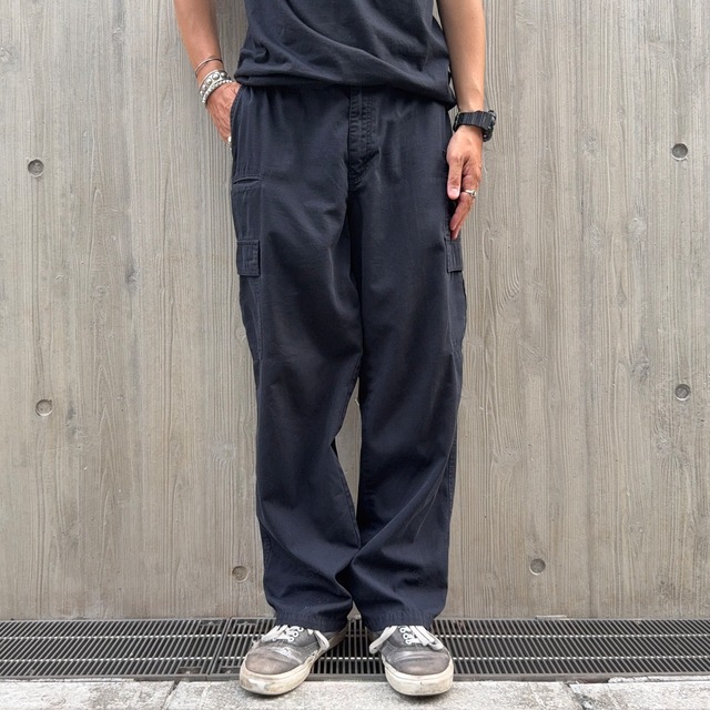 ■商品の紹介 こんなのを探していたと言うようなストレッチのブラックデニムのワークパンツ。ウエストも78cm〜90cmくらいまで伸びます。色落ちも汚れも楽しめるワークパンツ、年代も古くない、ガシガシ穿けるこう言うパンツが大好きです。 ※写真3枚目はスタイリングサンプル写真です。 ■Color…ブラック(写真をご参考ください) ■size…表記「34/30」実寸31〜36インチくらいまで ウエスト78〜90㎝(ストレッチの為伸びます) 股上30㎝ 股下70cm 裾幅22㎝ 総丈98cm ※着用写真176cm62キロ ■condition…Used(着用に支障のある目立つダメージ汚れはございません。) ■material… Cotton98% Lycra2%