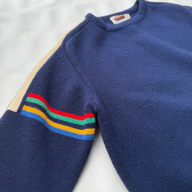 ■商品の紹介 肩から入ったホワイトラインにフリーダムスリーブ。レッド、グリーン、ネイビー、イエロー、ブルーのキレイな虹色ライン、フロント、バックは無地な所も使いやすいかと。ストレンジャーシングス感もありますね。 コレは、自分は無理矢理着ました(笑)が女性や小柄な男性向けです。150〜160cm前後くらいの方ならキレイに着れると思います。 ■Color…ネイビー(写真をご参考ください) ■size…表記「M」実寸Sくらい 肩幅フリーダムスリーブの為計測不能 身幅51cm 着丈56cm 脇下〜袖丈41cm ※着用写真モデル176cm62キロ ■condition…Used(細かなスレダメージはあります(写真8枚目)が、着用に支障のある目立つダメージ汚れはございません(写真ご参考ください)) ■material…100%Wool