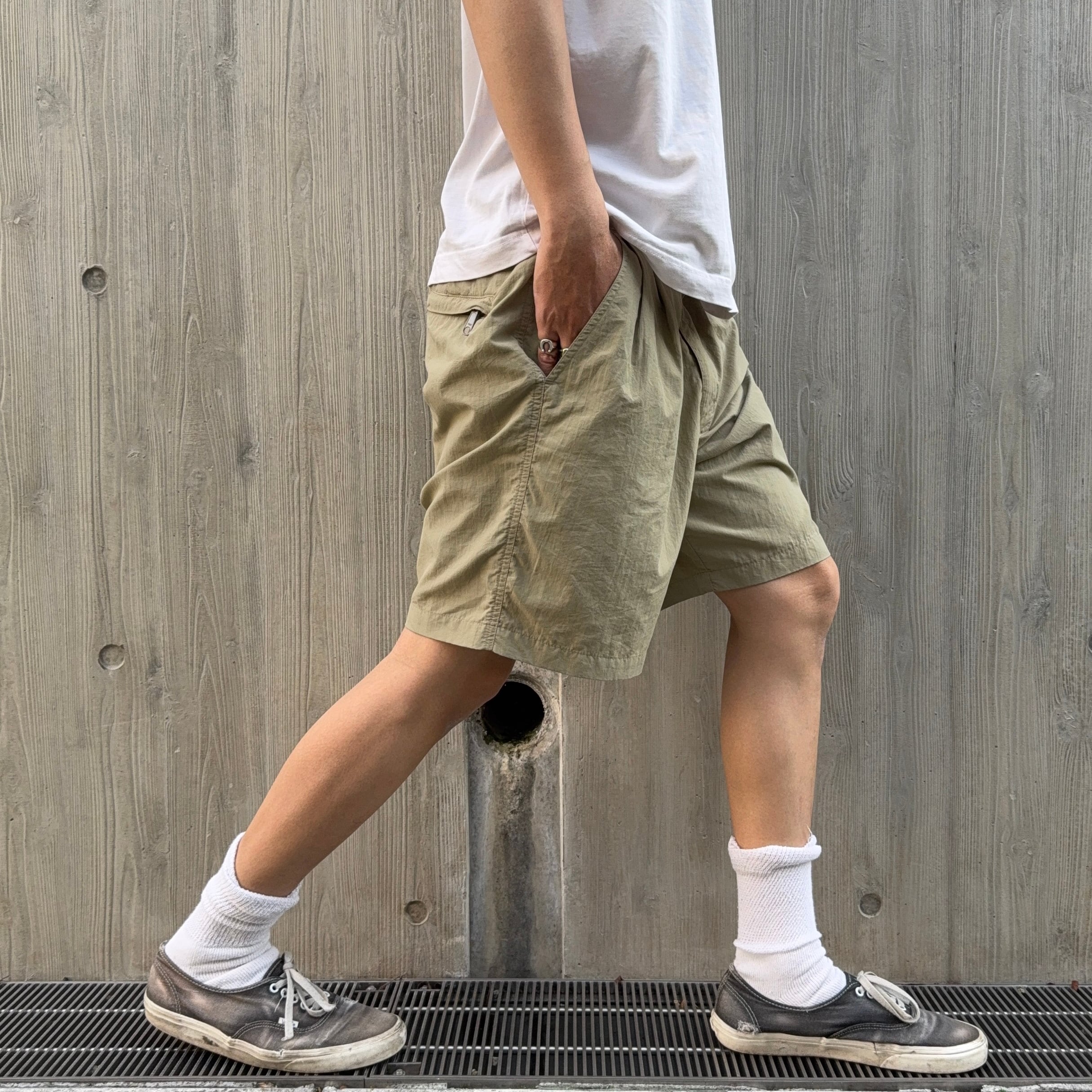 アメリカの”TRAVEL SMITH”と言うブランドナイロンショーツになります。ポケットのディテールやウエストのゴム仕様、2タックでフワッとしたシルエットなど、色々と気が利いた1本です。スポーツやアウトドアなテンションなのにこの2タックのフワッとしたバルーンシルエットが癖になります。