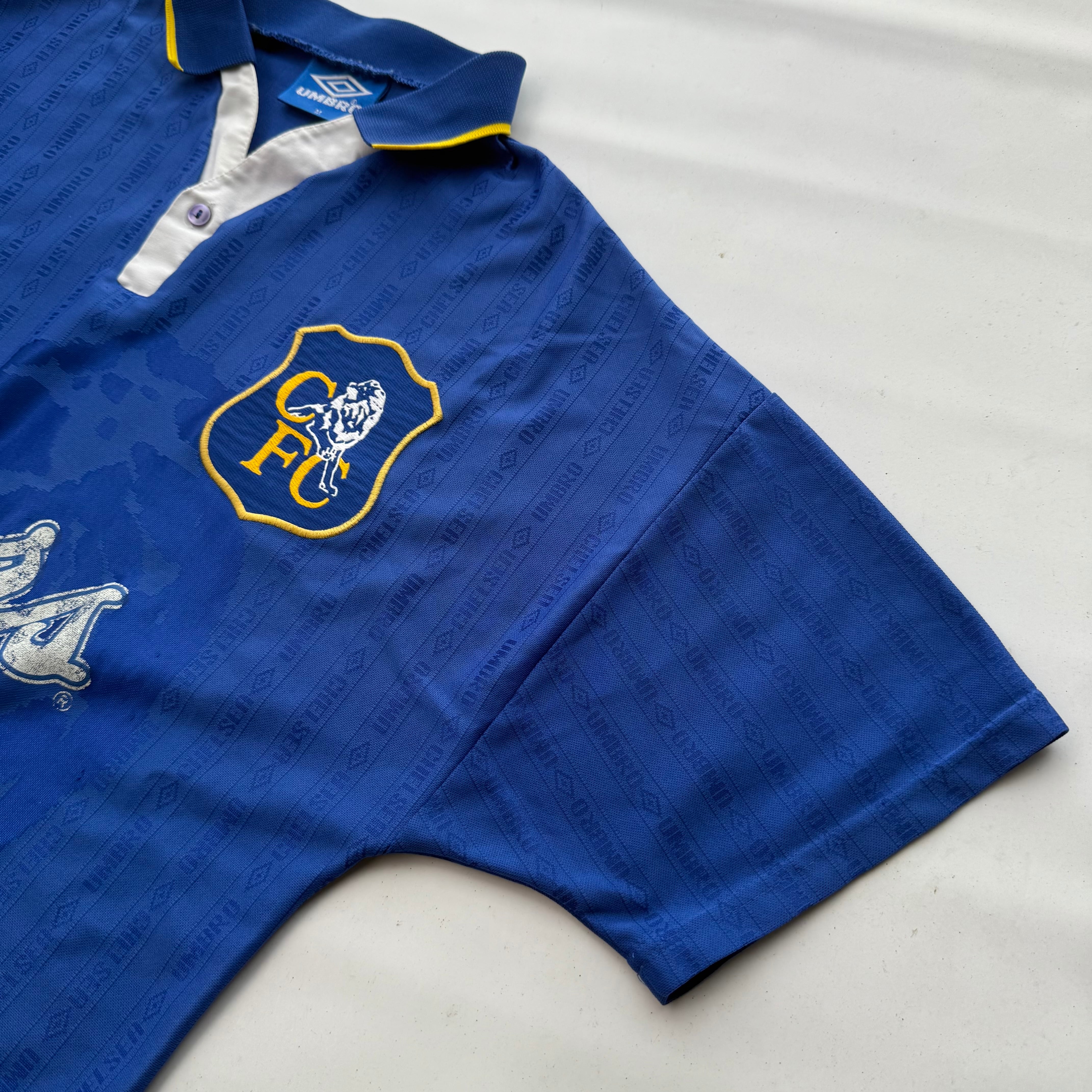 全盛期のBLURのフロントマン”デーモンアルバーン”が、本当に良く着ていた95’s頃のチェルシーのユニフォーム(復刻でなくオリジナル)です。近年は、コピー品なども出回ったり、流行りすぎた為、買いづらくなりましたが、コチラは当時物の正規品、中々出ないので抑えておいて間違いなしだと思います。
