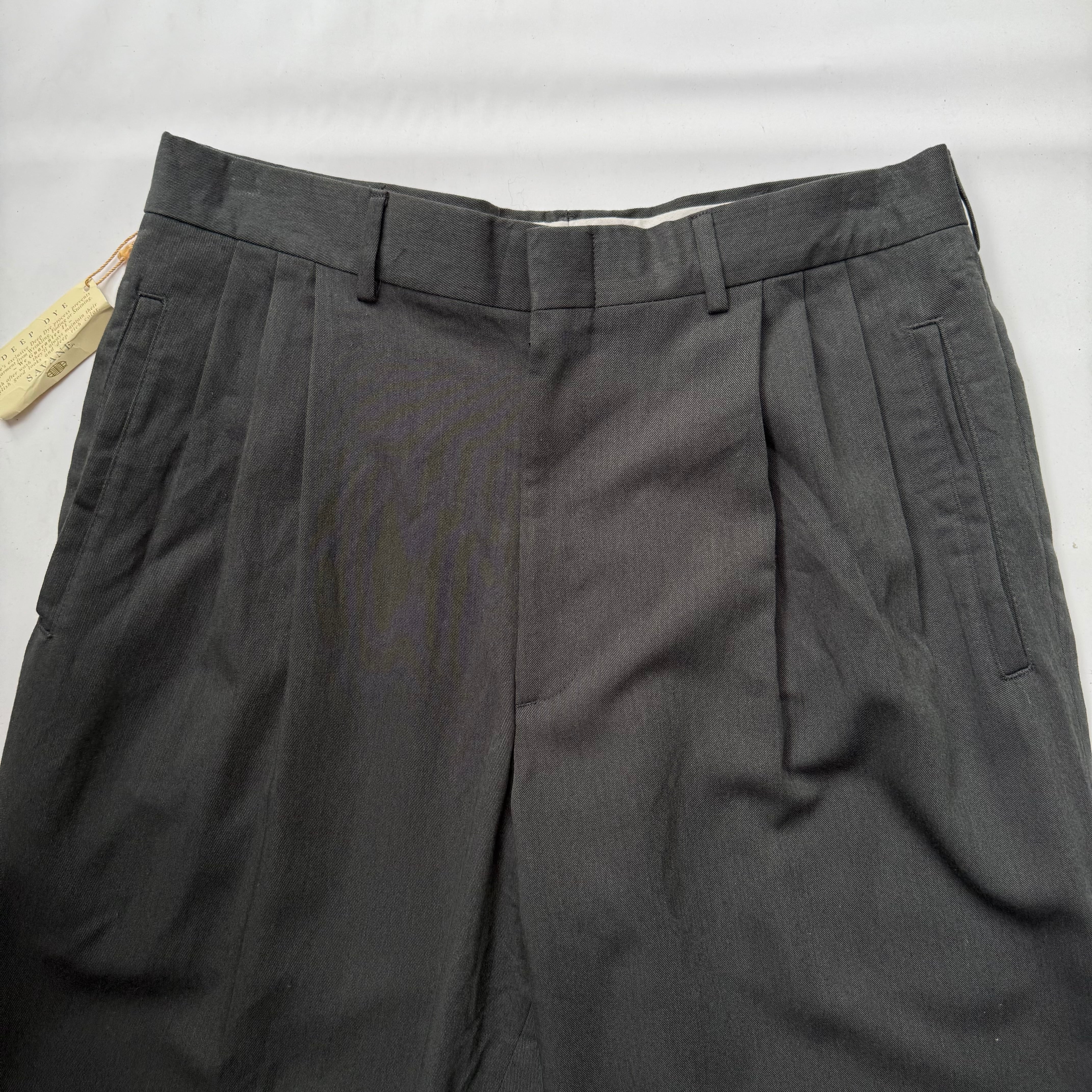独自の染めによる深いグレイッシュグリーンの色味に、レーヨン×ポリエステルの絶妙な落ち感の3タックと言う事なしです。Dead Stock(当時の未使用品)でしたが、少し埃っぽかったので水に通して一度洗ってあります。