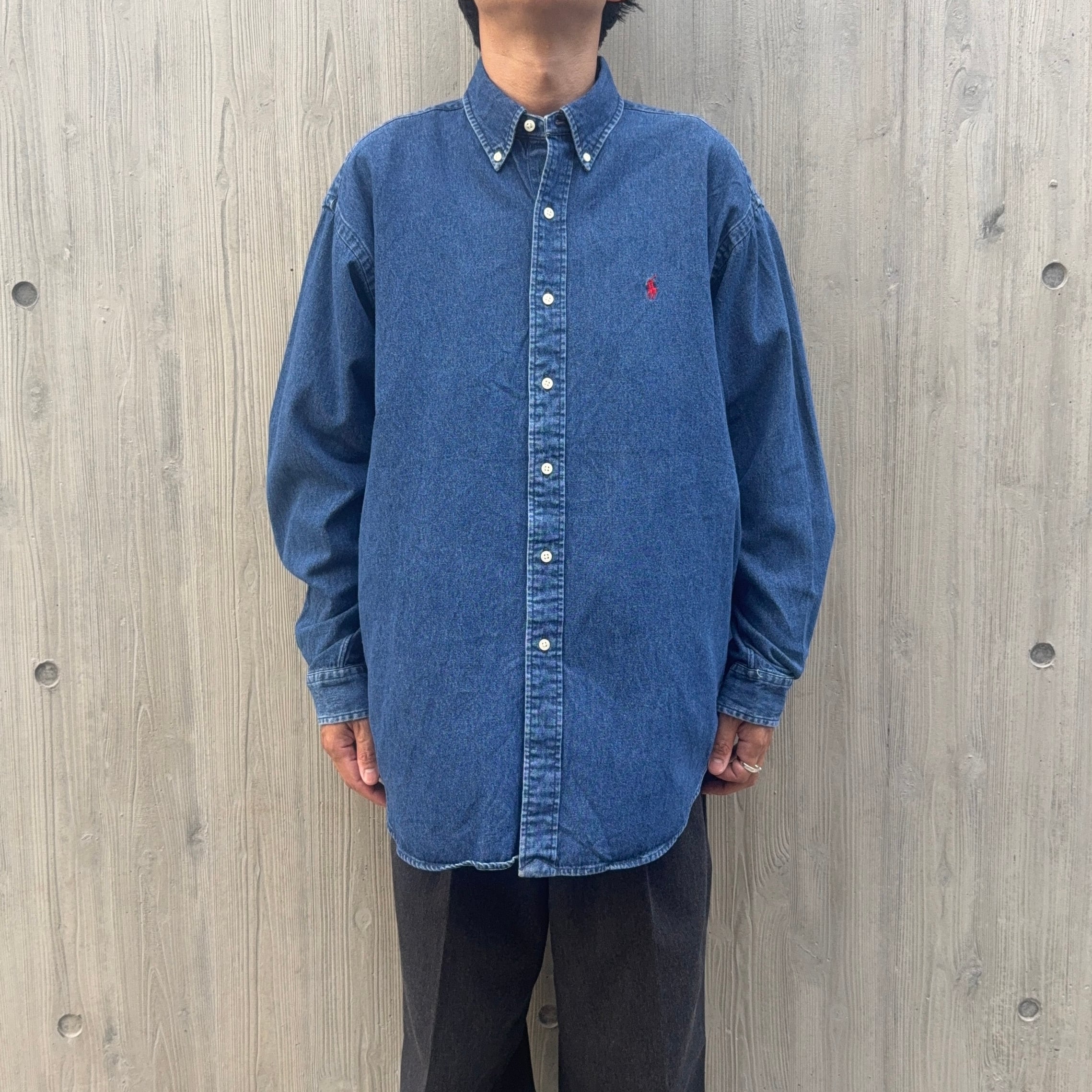 Ralph Laurenの80年代後半から90年代前半という限られた時代のみに作られた、”Blake”と言うモデルのデニムシャツになります。ゆったりとしたサイズ感とシルエットが特徴で、ルーズに着ても決まるのがポイントです。色味も濃いめなので、ガシガシ着用してアジを出していくのにもオススメです。