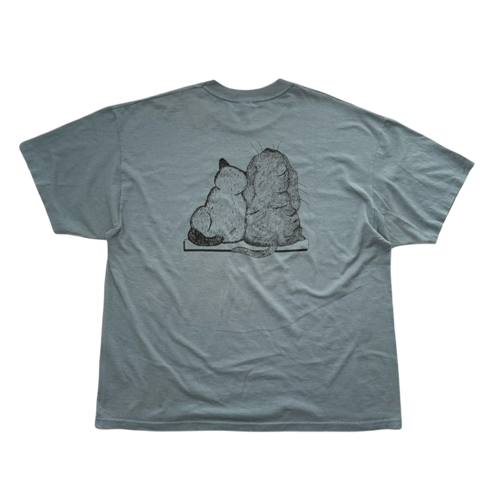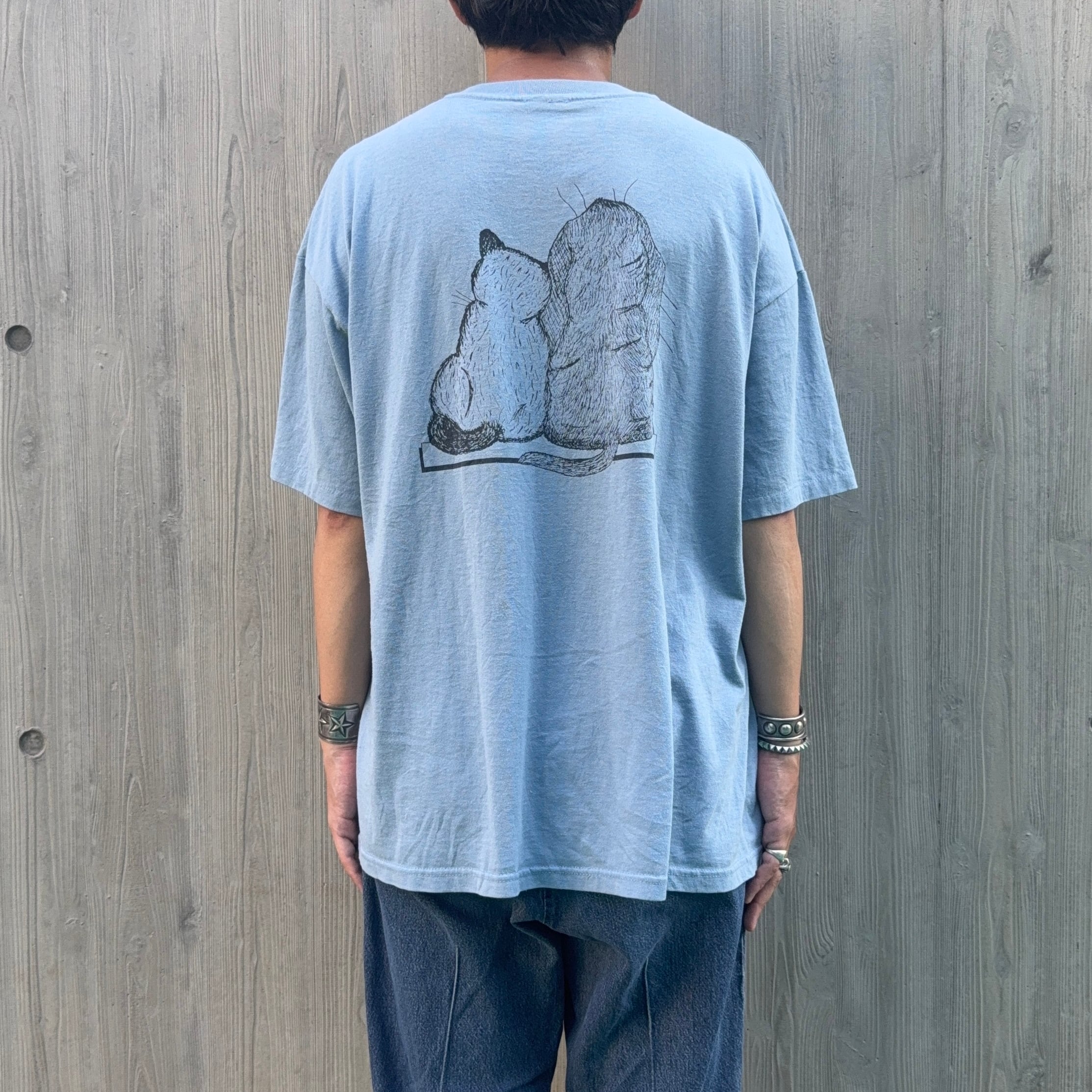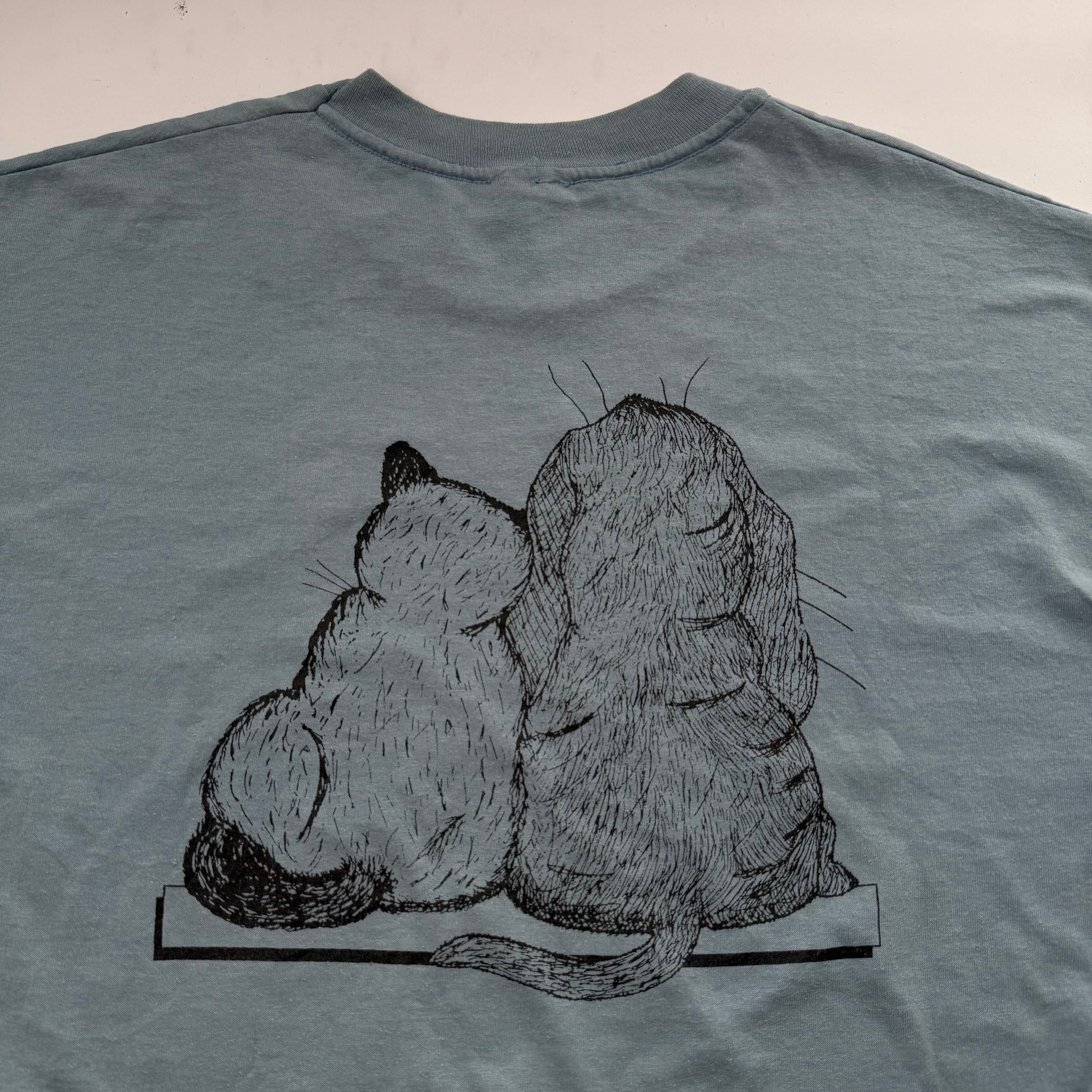動物物の両面プリント物のTシャツは好きでついつい買ってしまいますが、コレは犬Tでも猫Tでもなく2匹が共存している所と、ボディーの色に惚れました。圧倒的に白や黒やグレーボディーが多い中、このボディーの色は古着好きならグッとくるはずです。