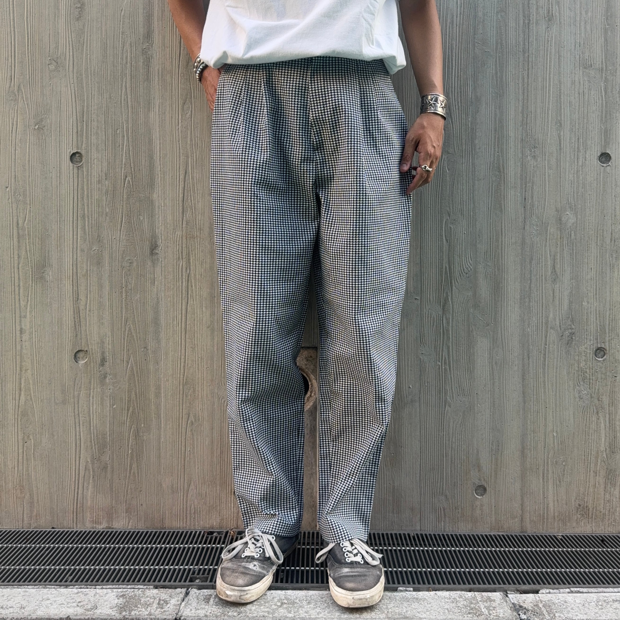 80’s頃のアメリカ製2タックのコットン×ポリのワークパンツのような1着。Dead Stock(当時の未使用品)でしたが、少し埃っぽかったので1度洗濯しましたが、まだパリッとした質感です。太腿周りがゆったりしていて、テーパードシルエットなThe 80’s感も新鮮です。ロールアップなどして穿くのもあり、ガシガシ穿いて柔らかくなった頃に完成です。