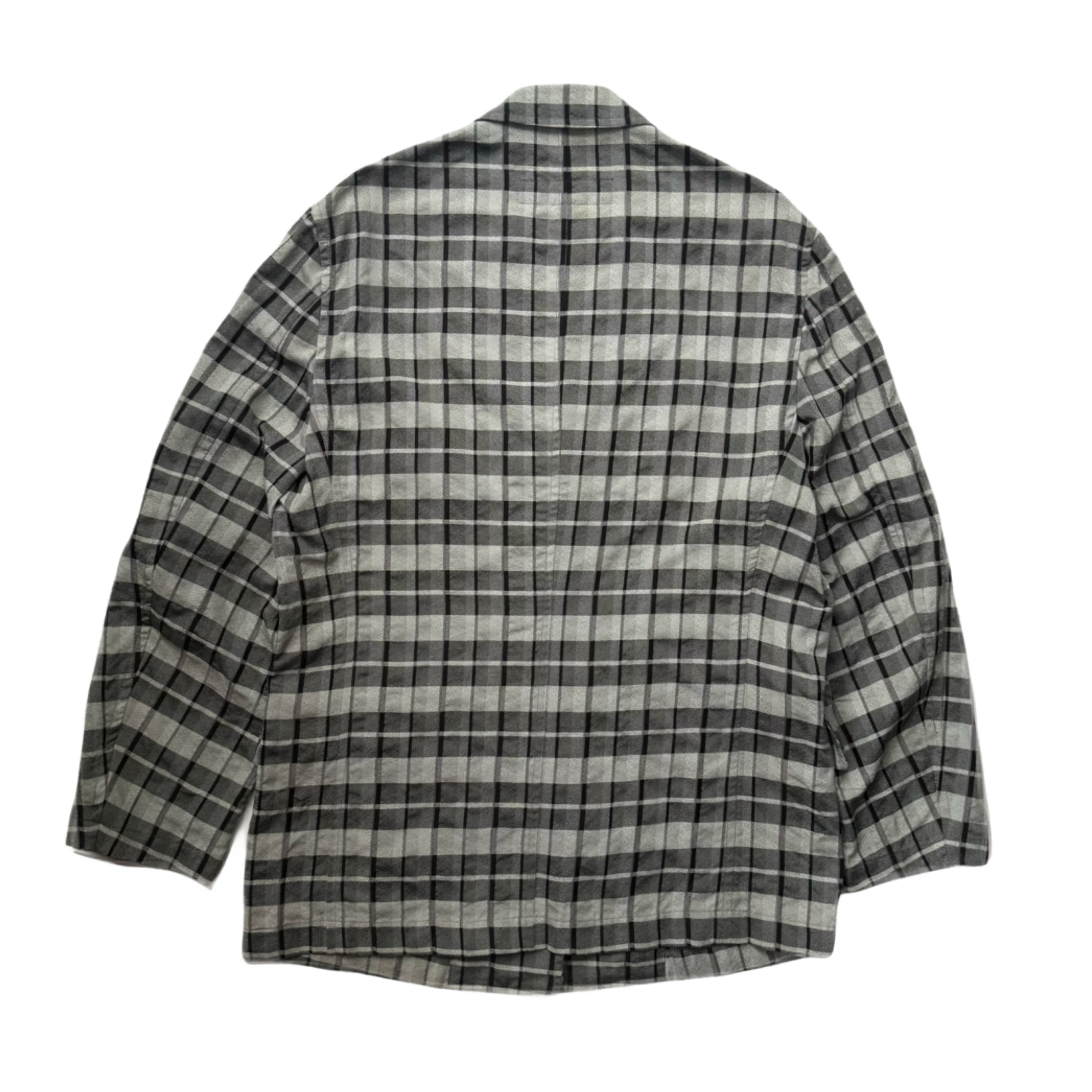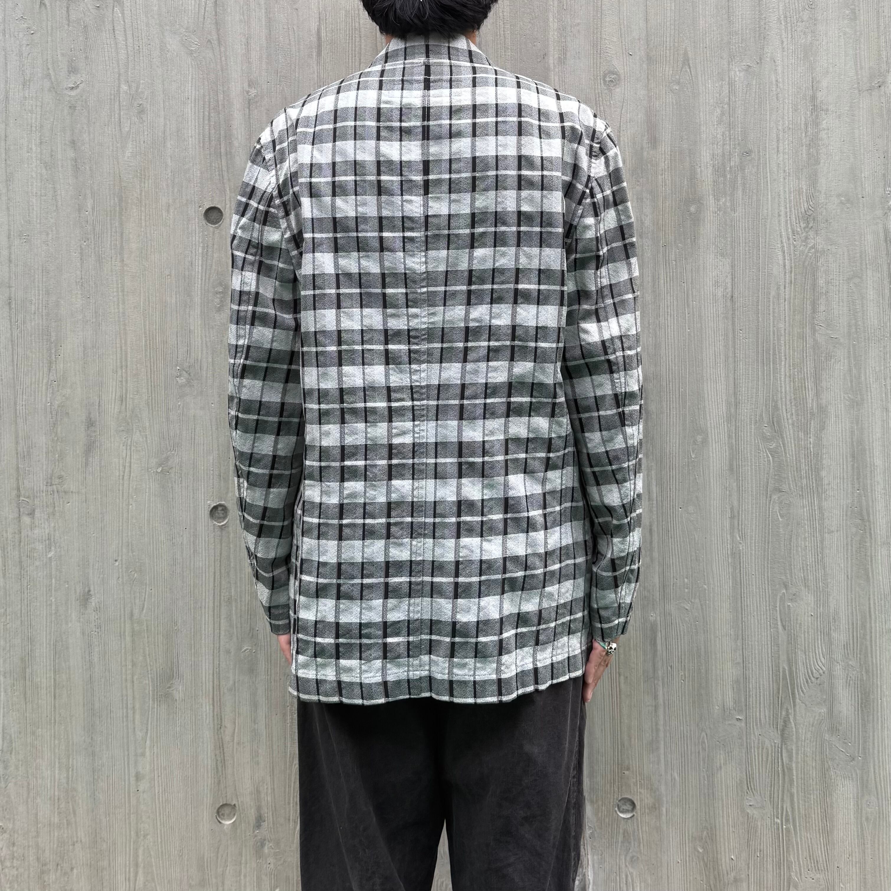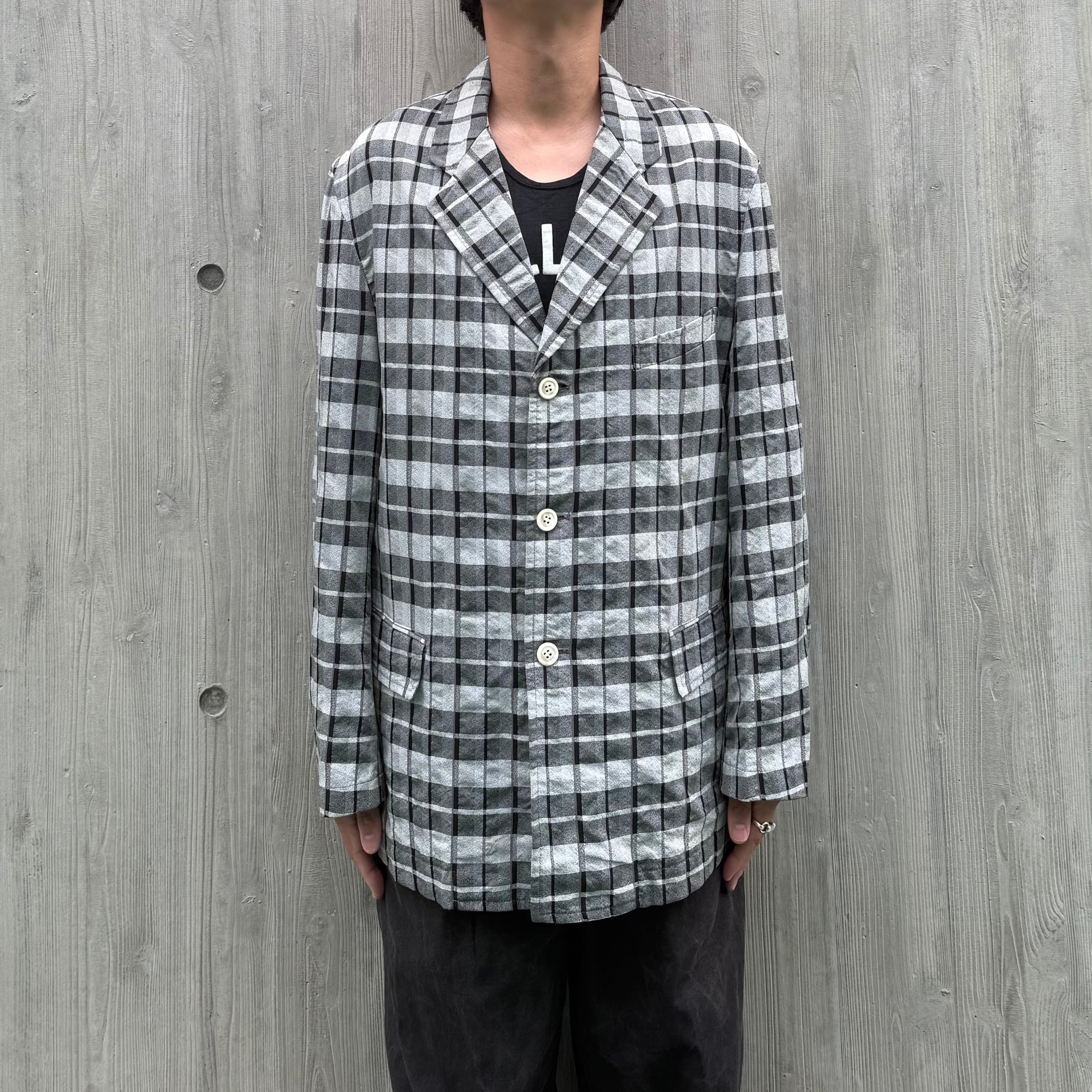 95年の”COMME des GARCONS HOMME PLUS(コレクションライン)”より、最高な1着をご紹介。ラインやグラデーションが効いた、ただの定番のモノトーンチェックでない所に、トリアセテート40%、キュプラ36%、ポリエステル15%、レーヨン9%と言う、あまり触った事がない独自のテキスタイル。ひんやりとした清涼感、緩っとした落ち感、洗ってもシワになりづらくすぐに乾く所。肩パッドもなく、アーカイブピースの中でも、今着てクールな1着かと思います。