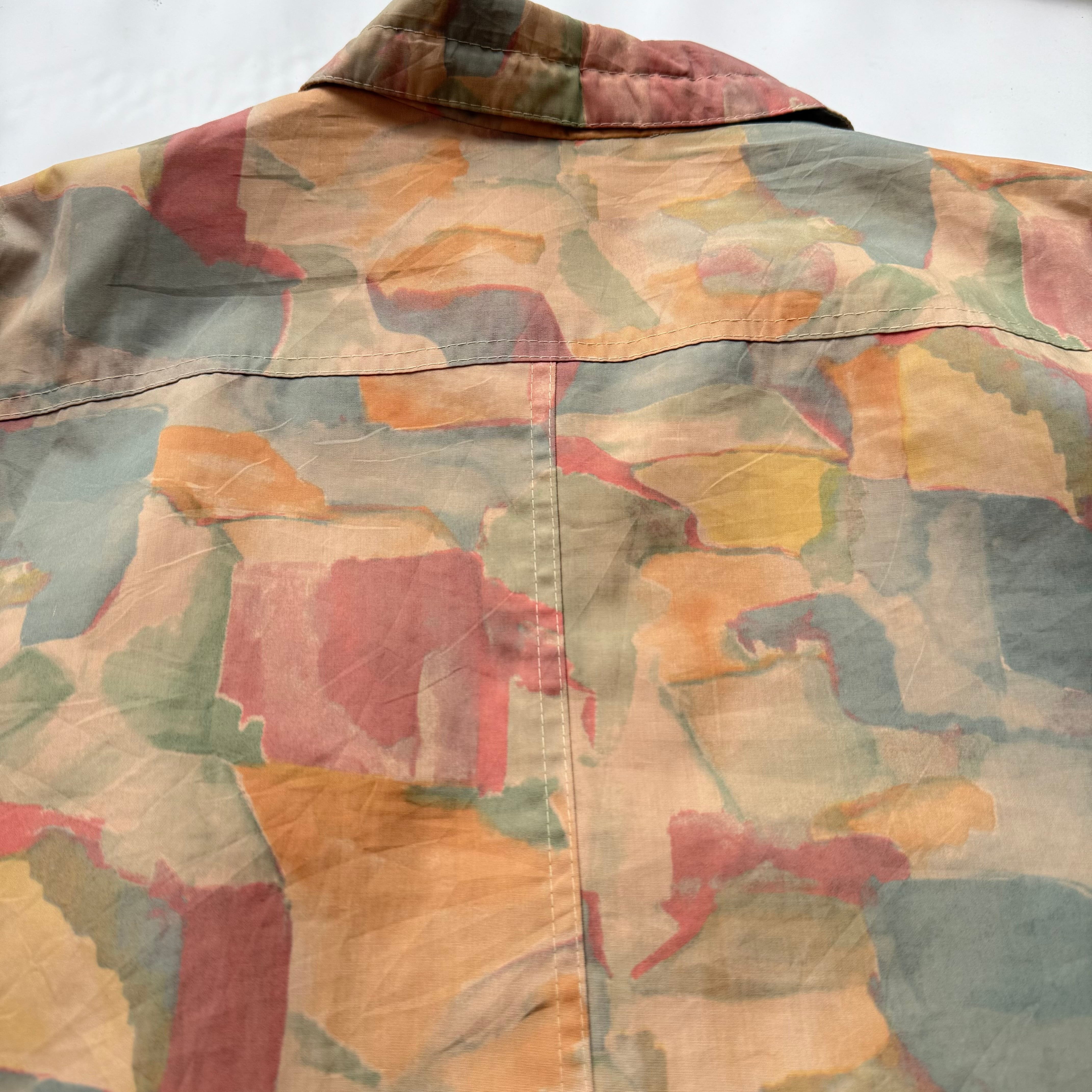 抽象的かつ幻想的なパターンのモッズコート風なフランス物のハーフコート。非常に軽い素材、肩周りのギャザーの入り方、短めかつ太めなアームホール、モードな雰囲気も持ちつつ日常着的ブリットポップな雰囲気も合わせもつバランスの取れた1着。甘すぎず、派手過ぎず、子供っぽくもない、パンチも効きすぎない何とも表現が難しいノーブランドな1点物、グッときた方に届いて欲しいです。