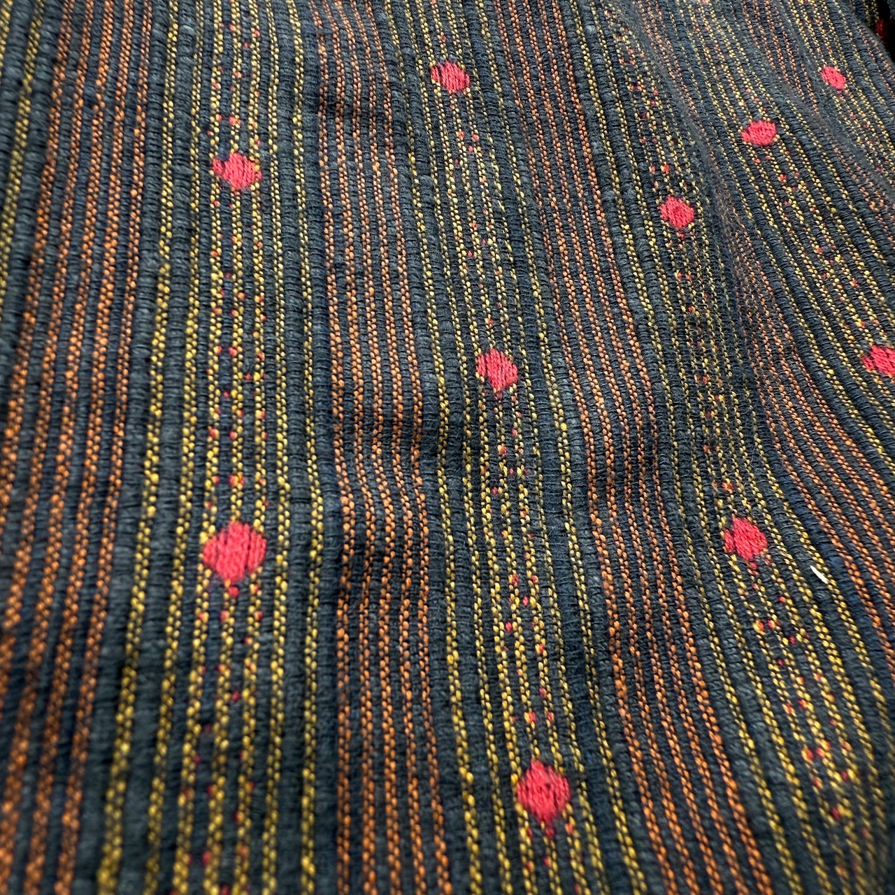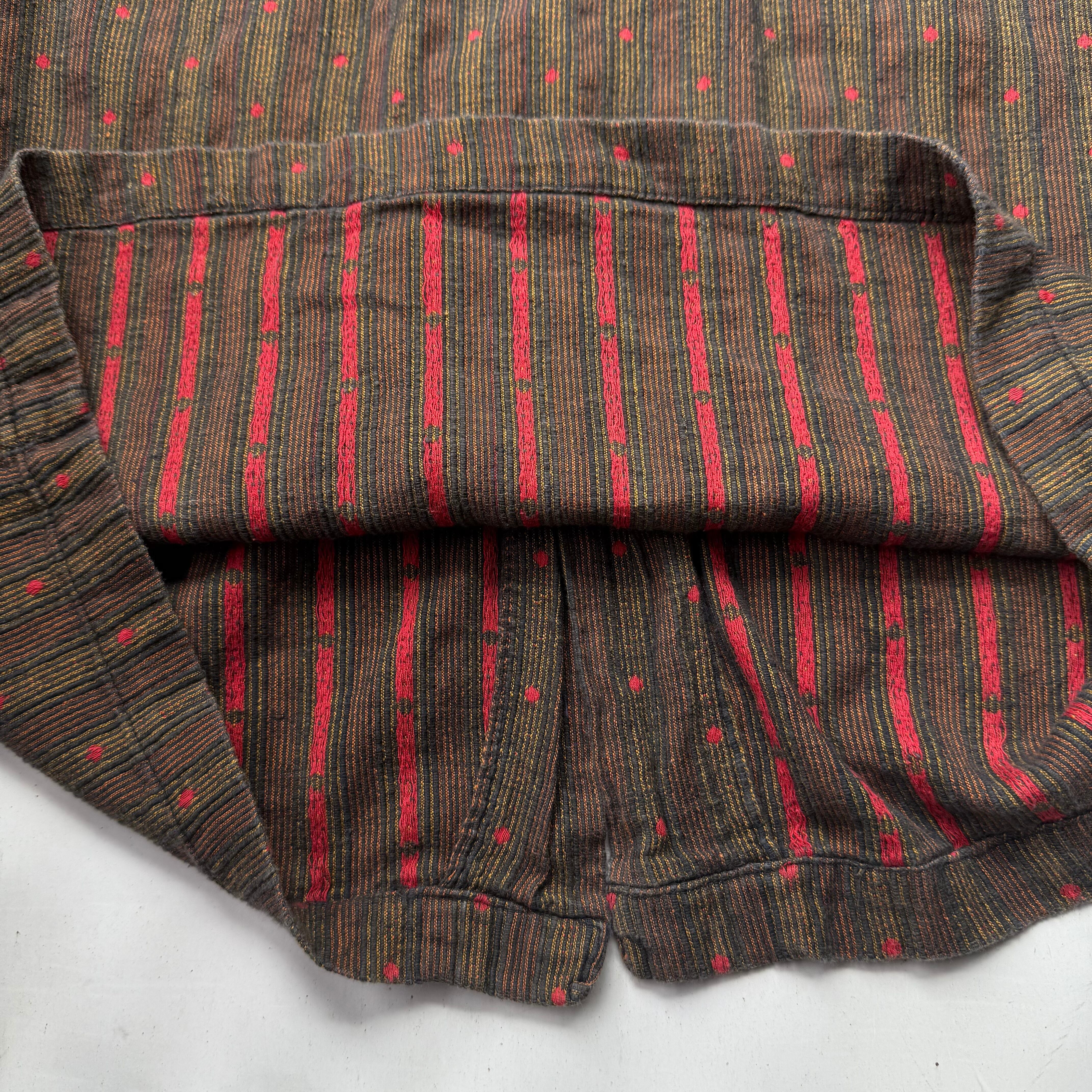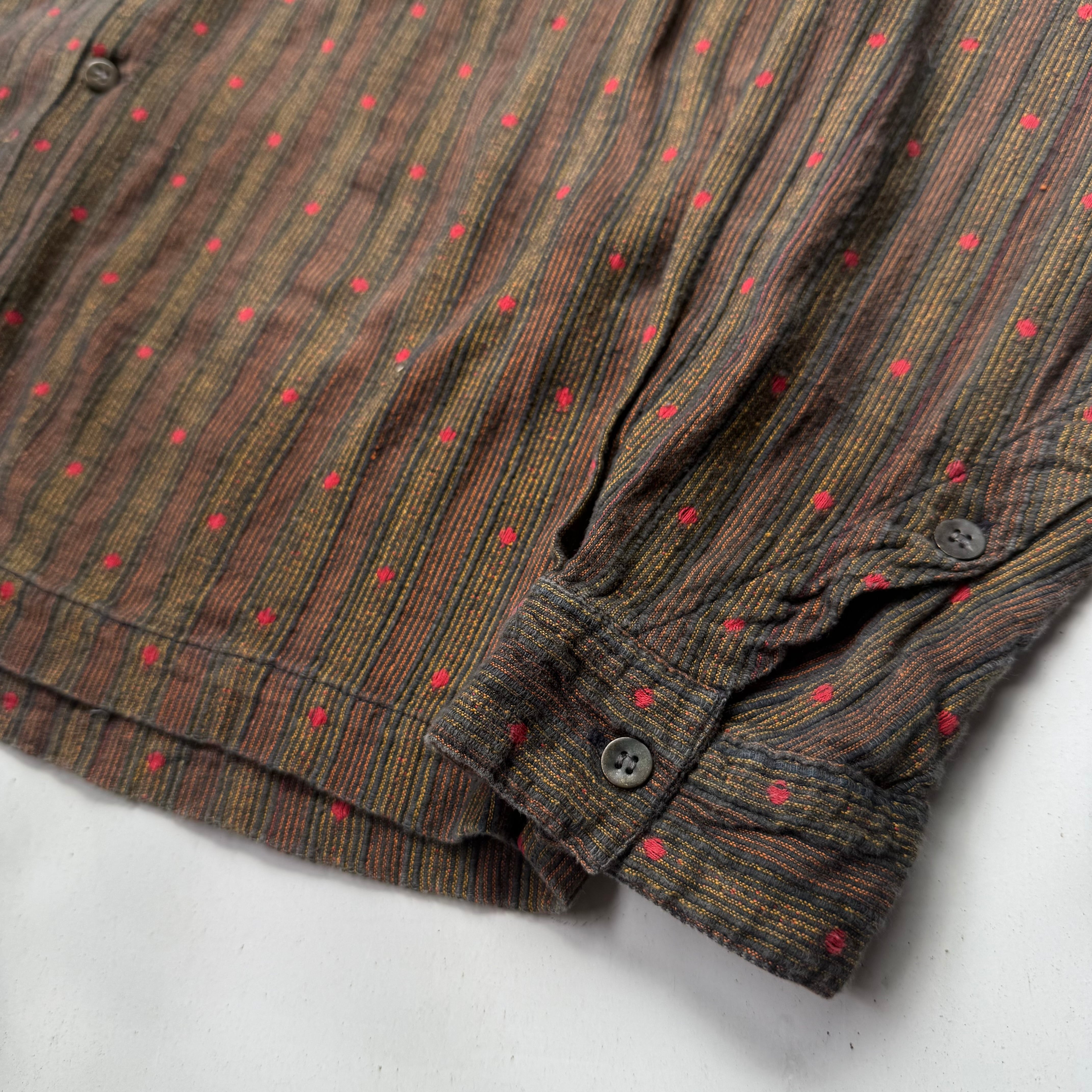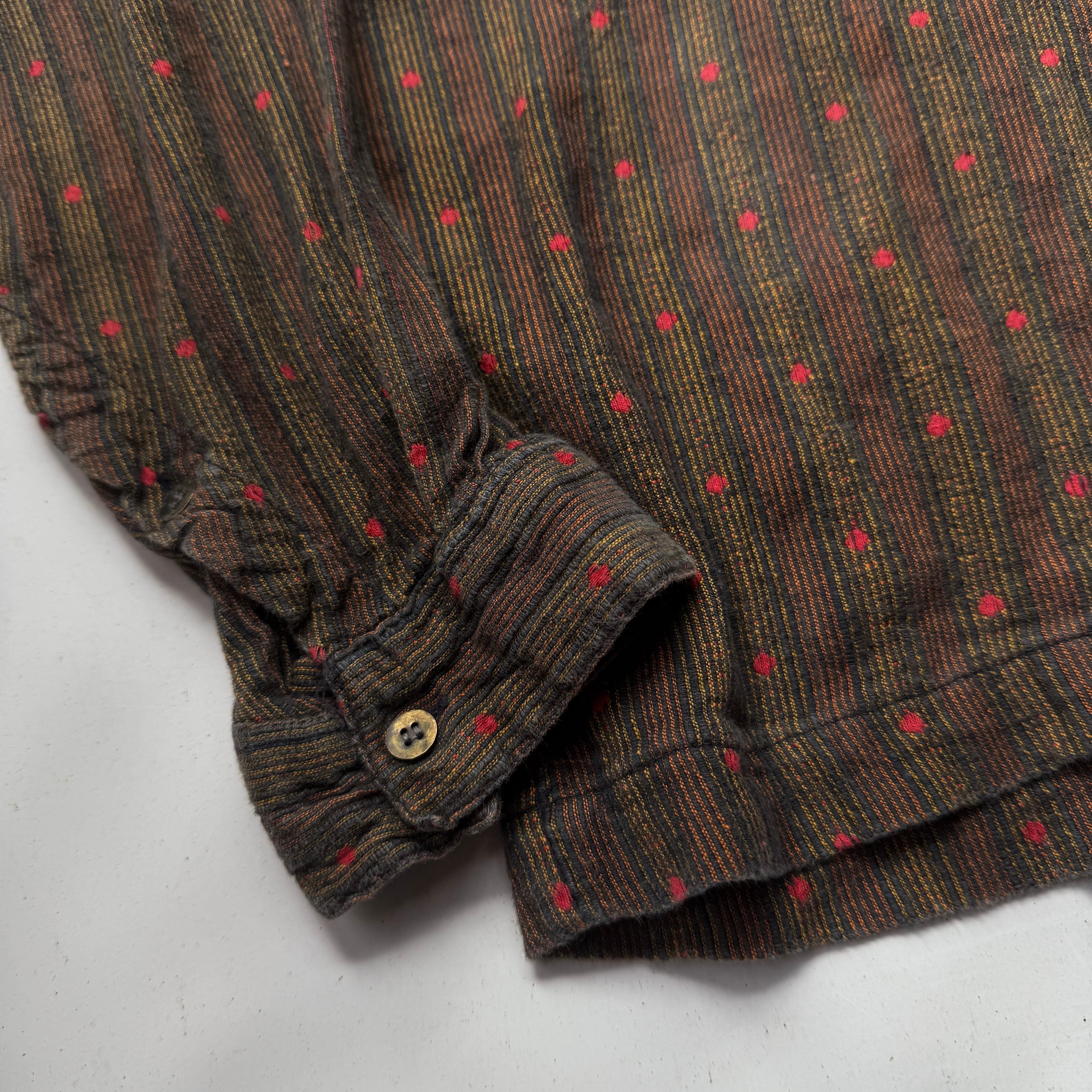 インド綿らしい乾いた質感とミックスした糸の美しさ。赤玉刺繍が効いてます。