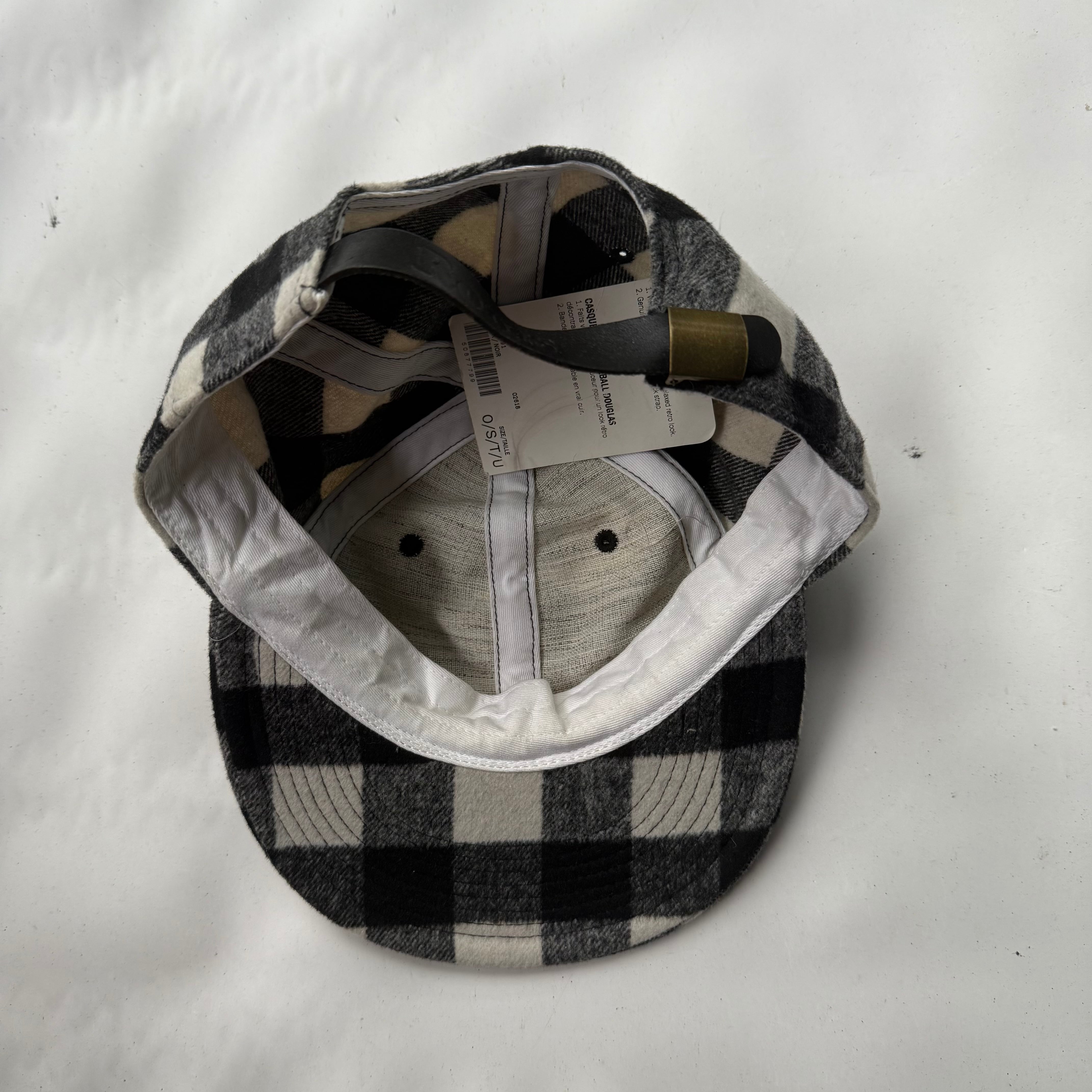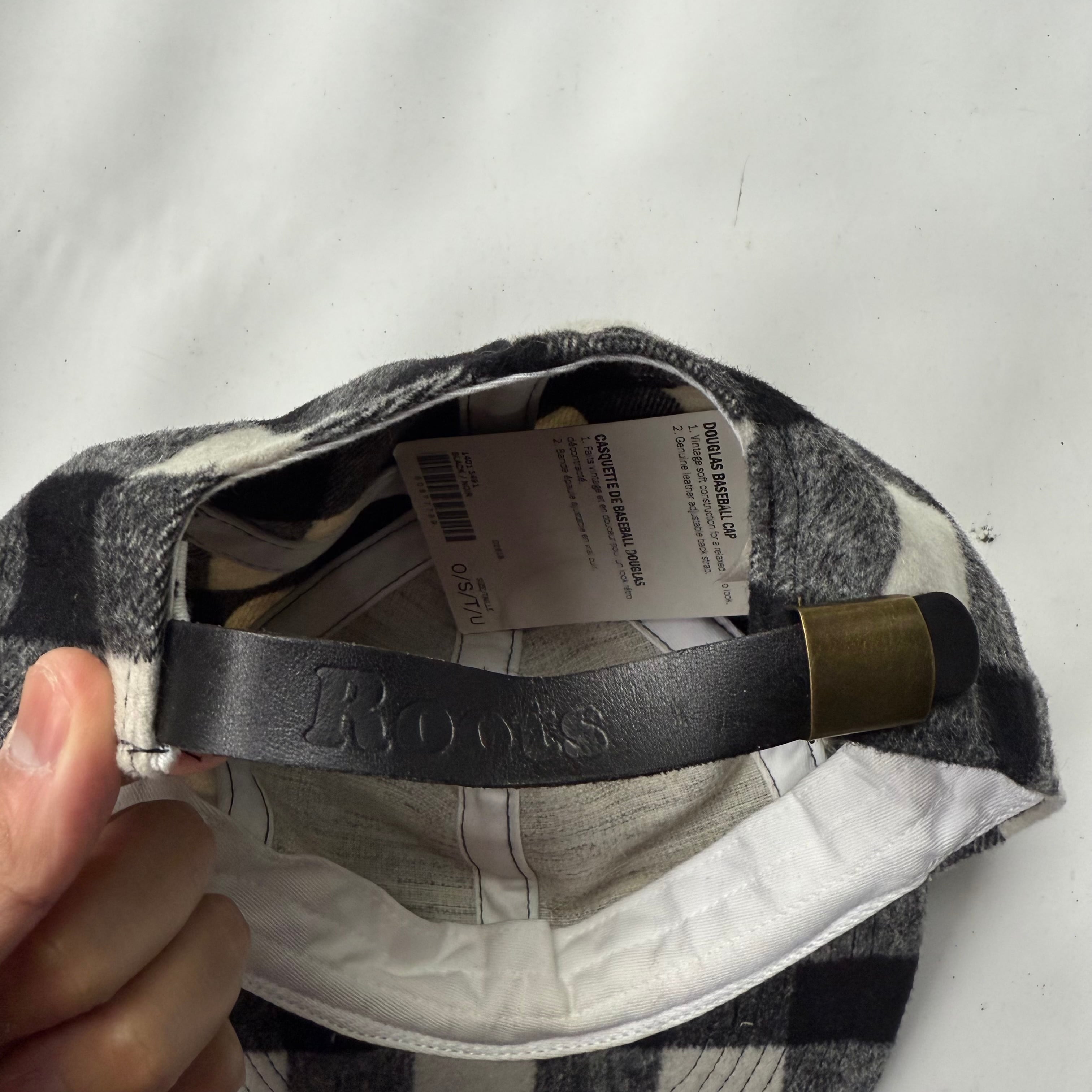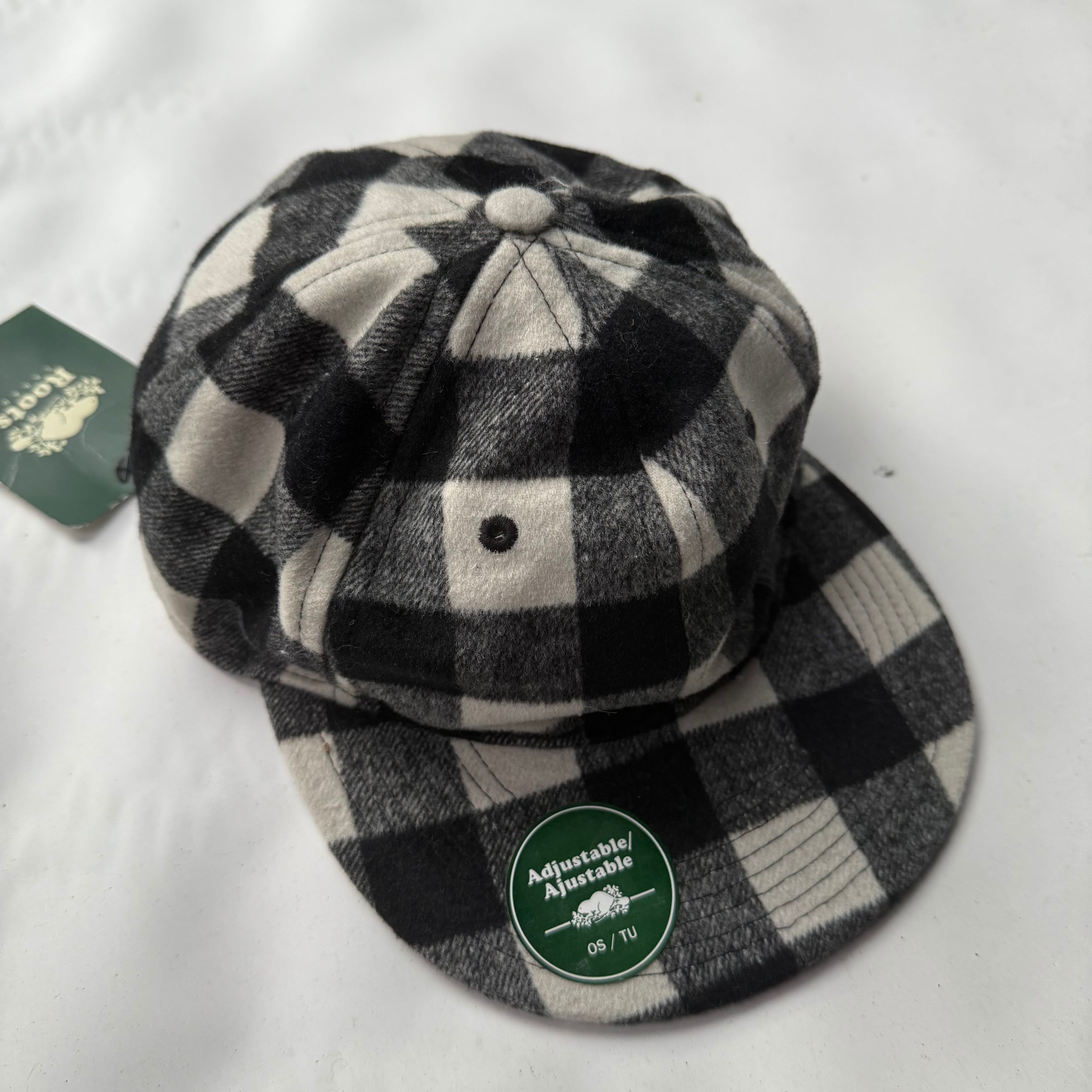 カナダのメーカー”ROOTS”の白黒ブロックチェックのベースボールキャップ。レザーストラップで調整可能、Dead Stock(タグ付き)。