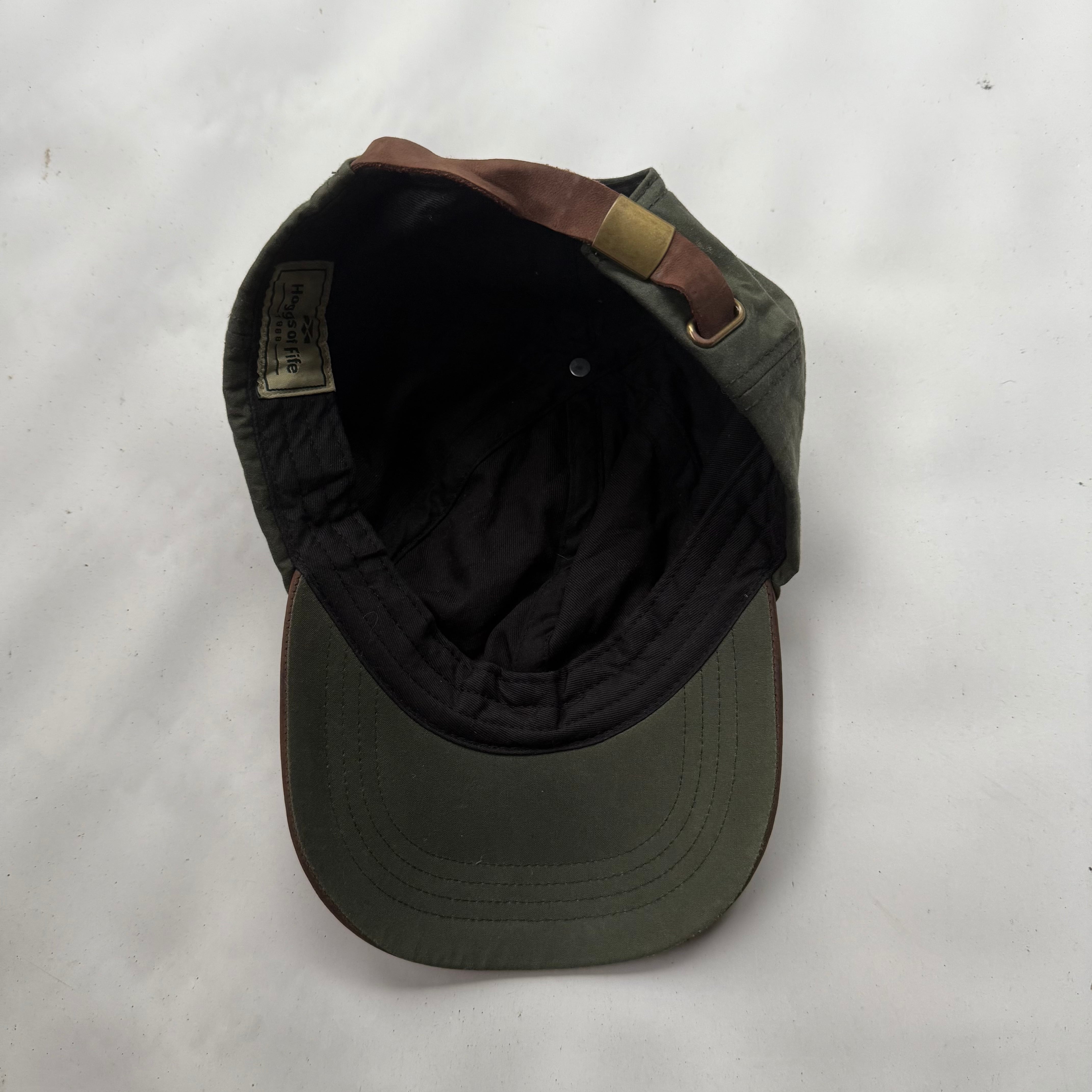 レザーっぽく見えますが、Barbourのようなオイルド加工のような質感のキャップ。レザーストラップで調整可能、シルエットが良く渋さあるカラーリング、汚れたり褪せたりしていく過程が楽しめる個体です。