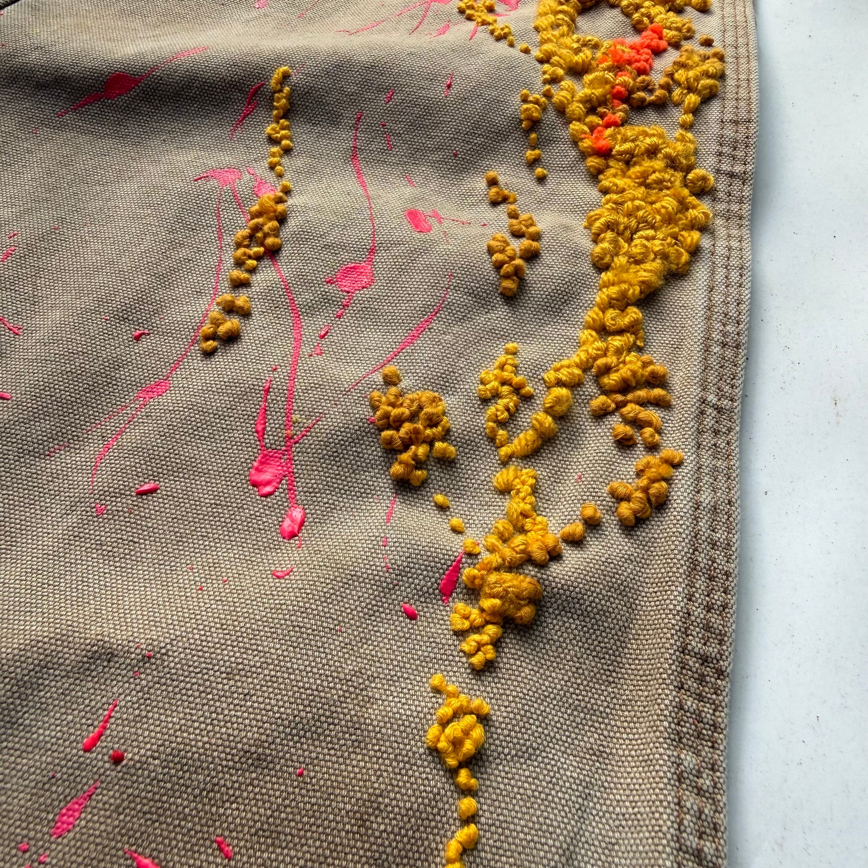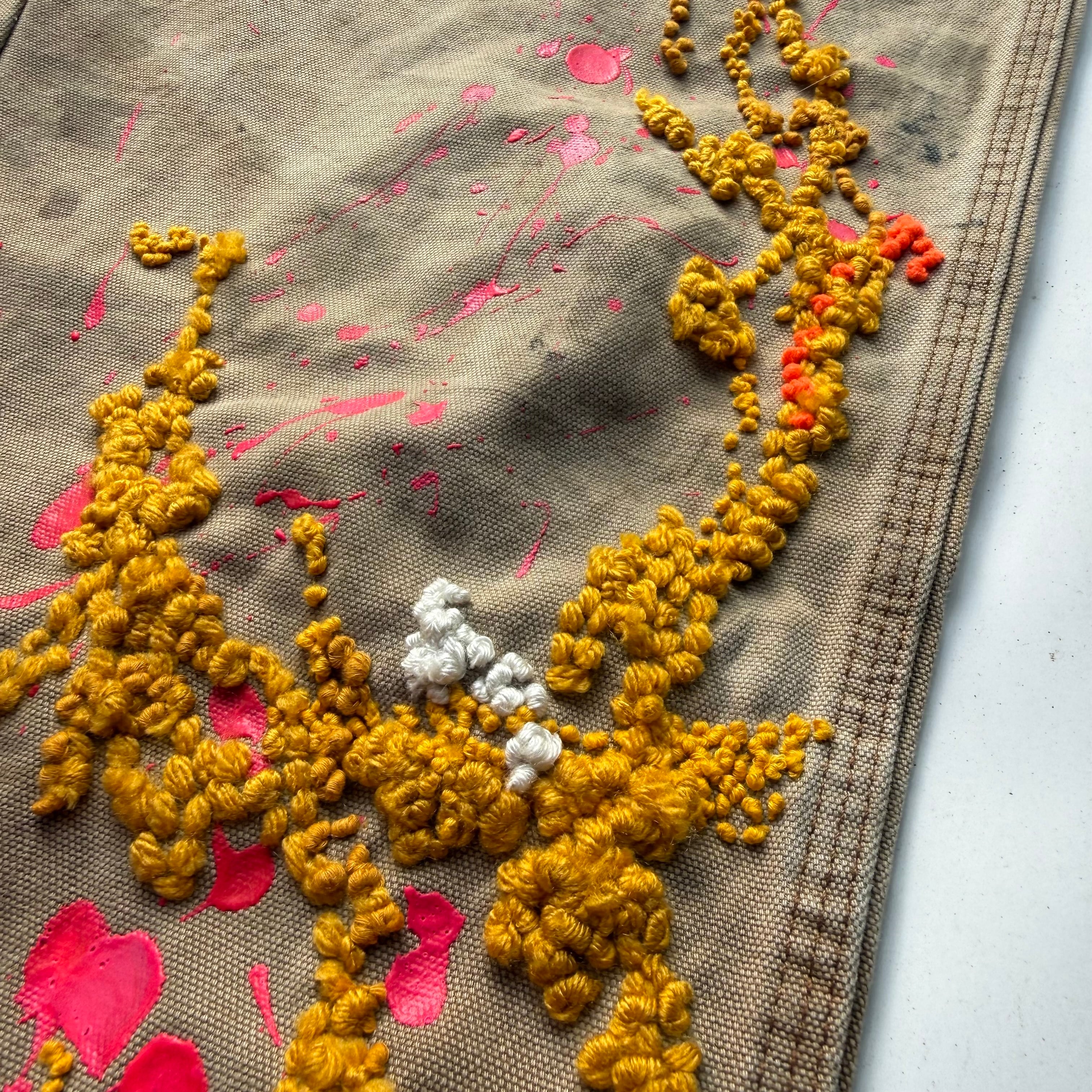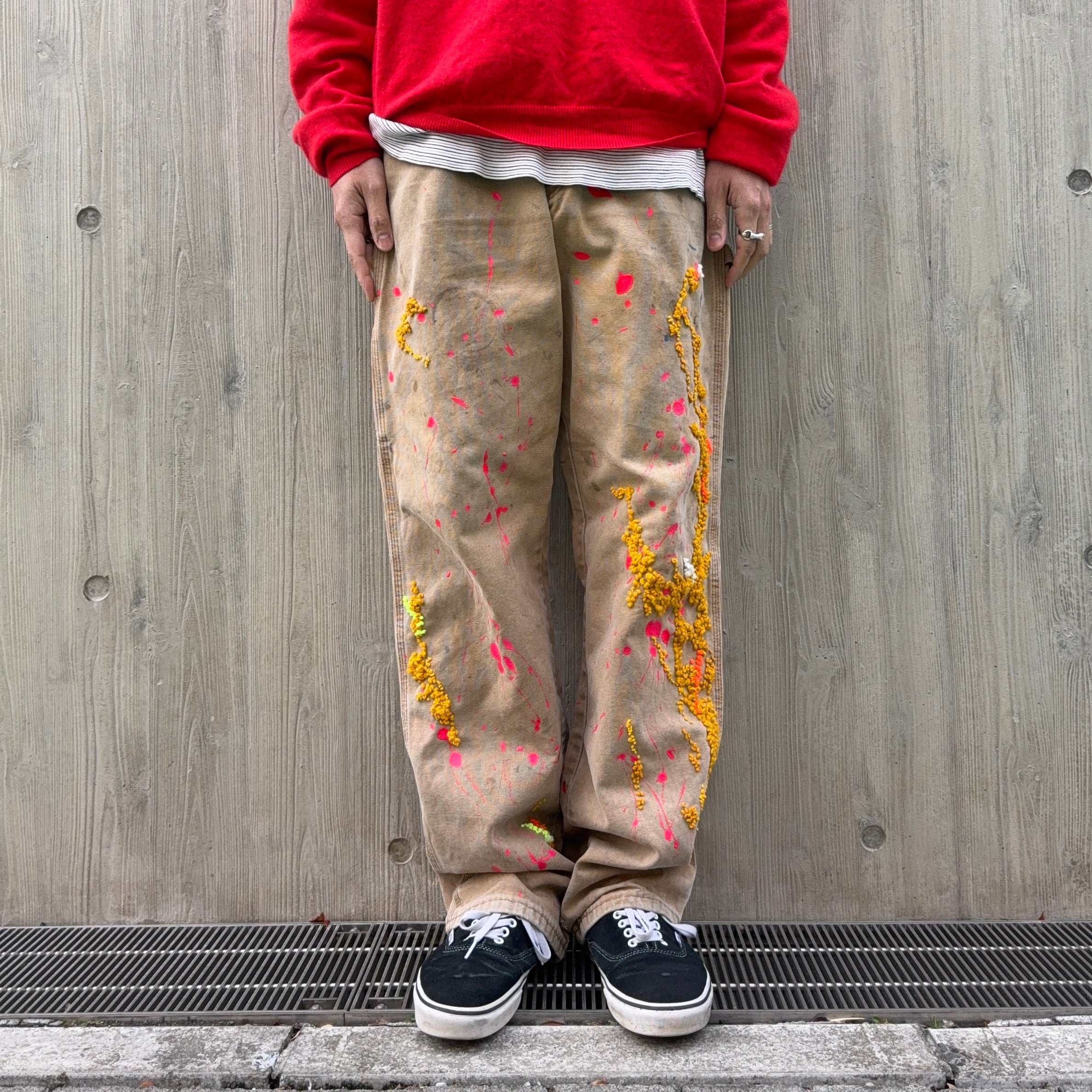 ペイントパンツに重要なリアルなペイントに、立体感と温かみを持たせたダーニング刺繍を混ぜたらと言う実験的な試み。