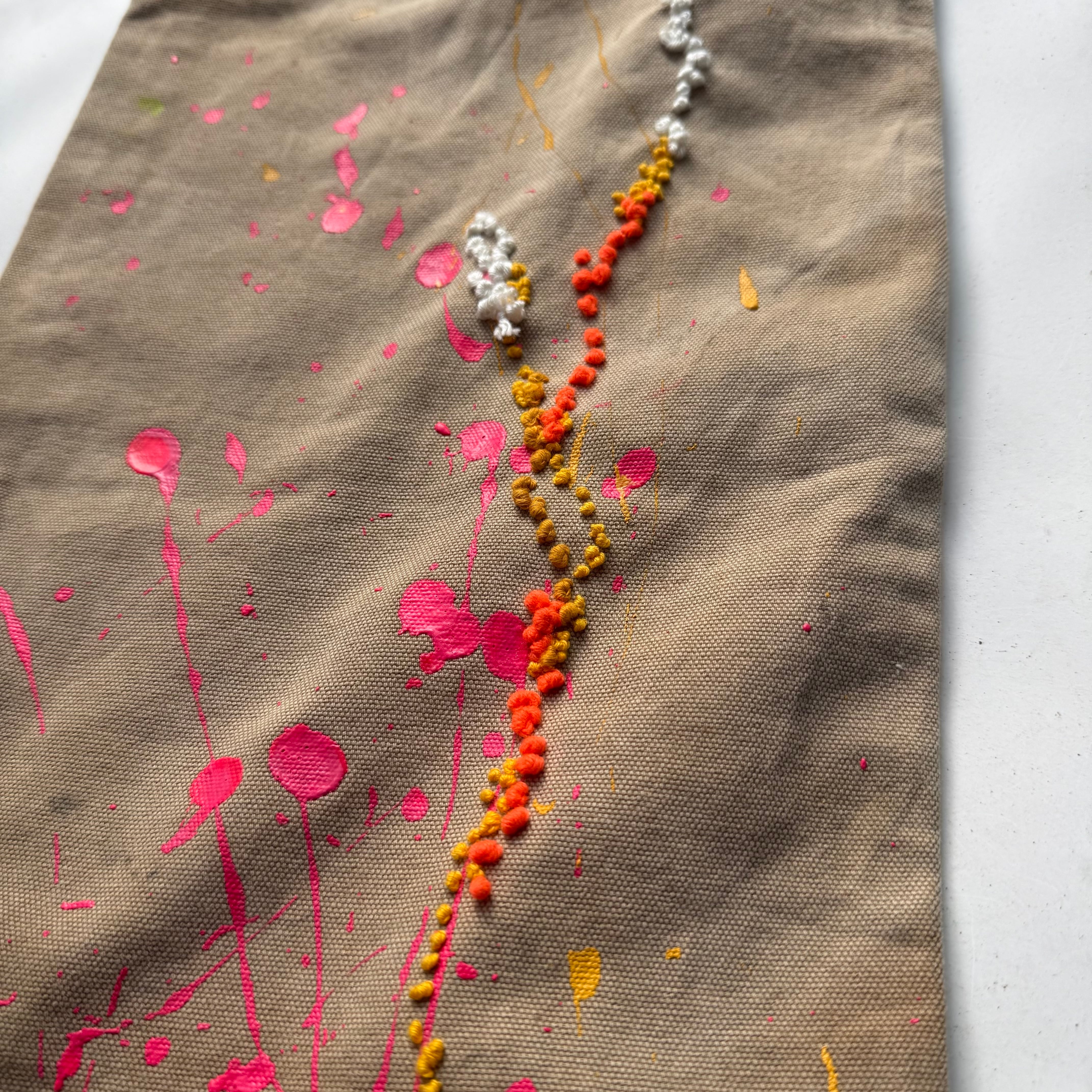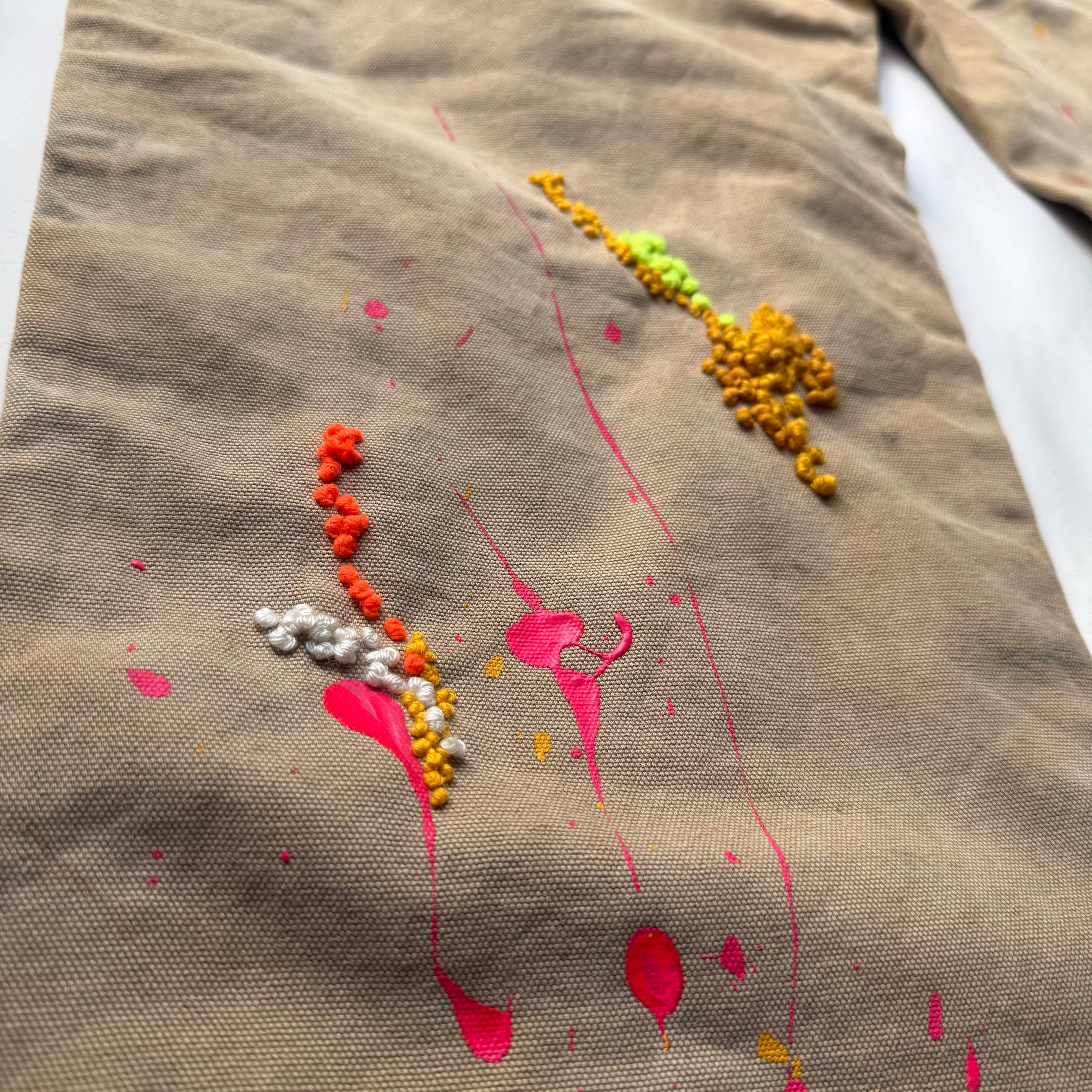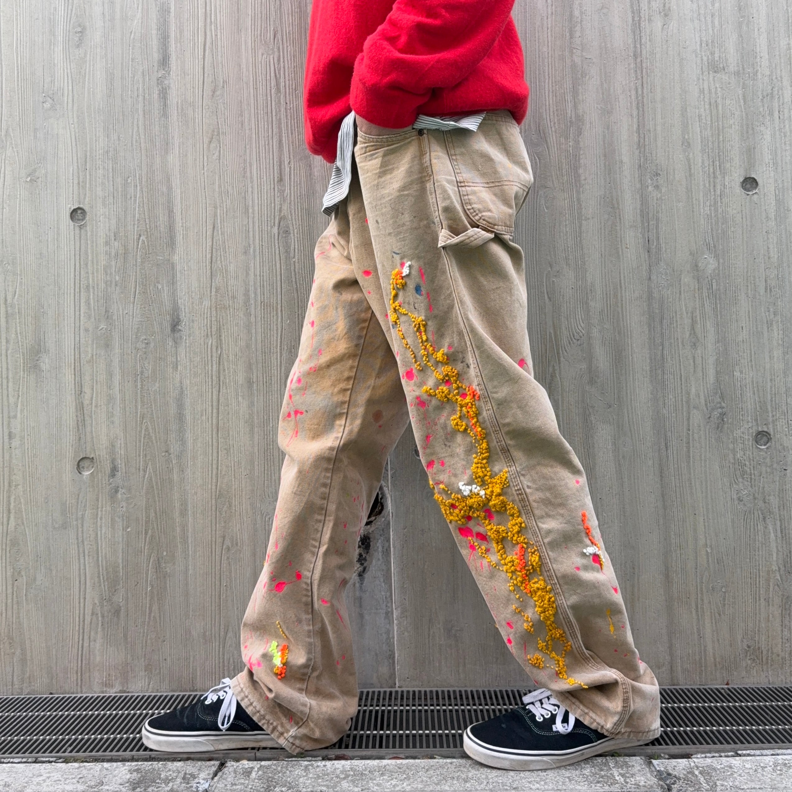 ペイントパンツに重要なリアルなペイントに、立体感と温かみを持たせたダーニング刺繍を混ぜたらと言う実験的な試み。