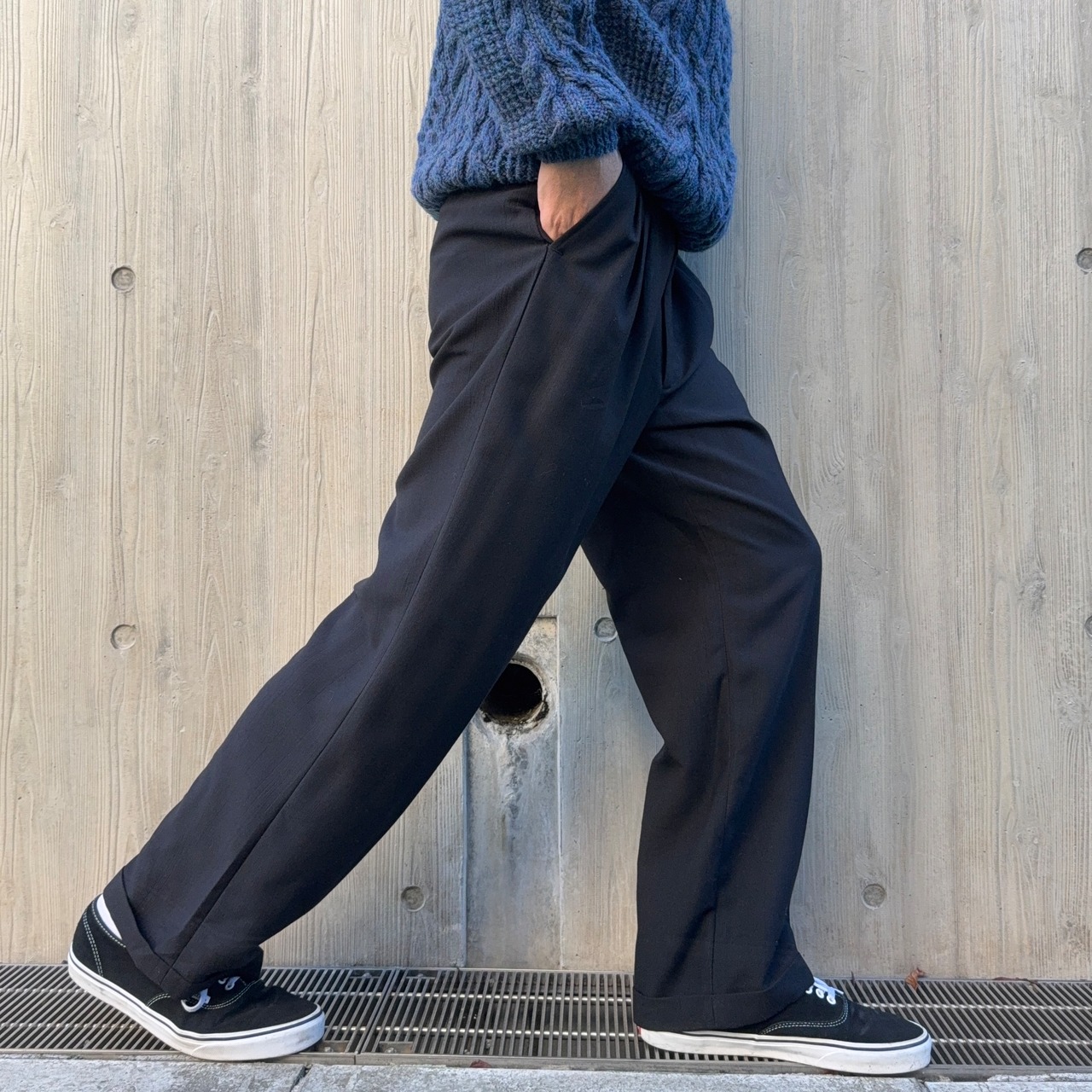 3タック、ブラック、サイジングバランス良しの落ち感と動きのあるスラックス、この辺りは何着持っていても良い安定感ある1着かと思います。