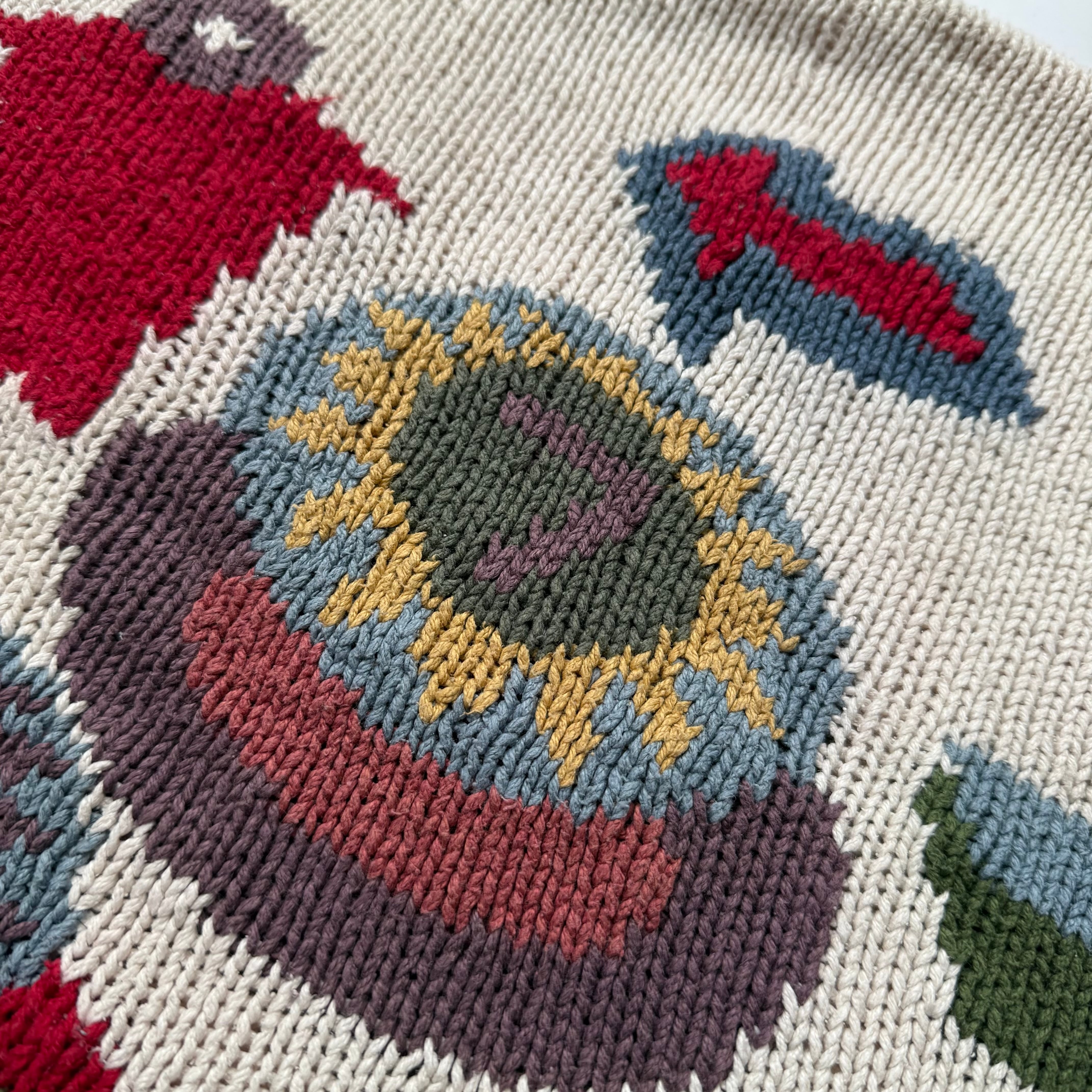 全体で見ると”顔”にも見えたり、細かく見ると”人”や”数字(5、7など)”が見えたりとユニークかつデザイン性が高いニット。思想強めで、個人的にかなりグッときたヤツ。