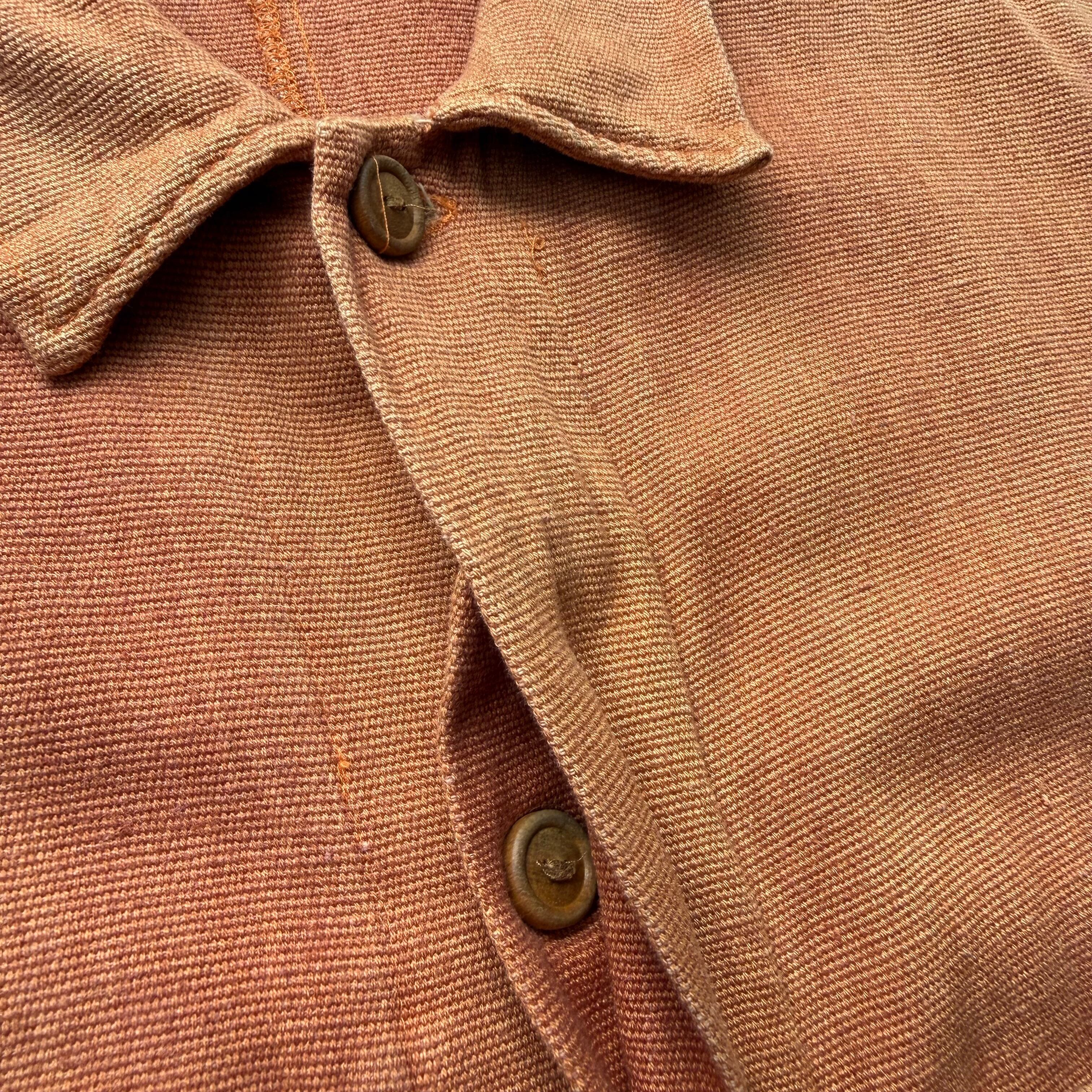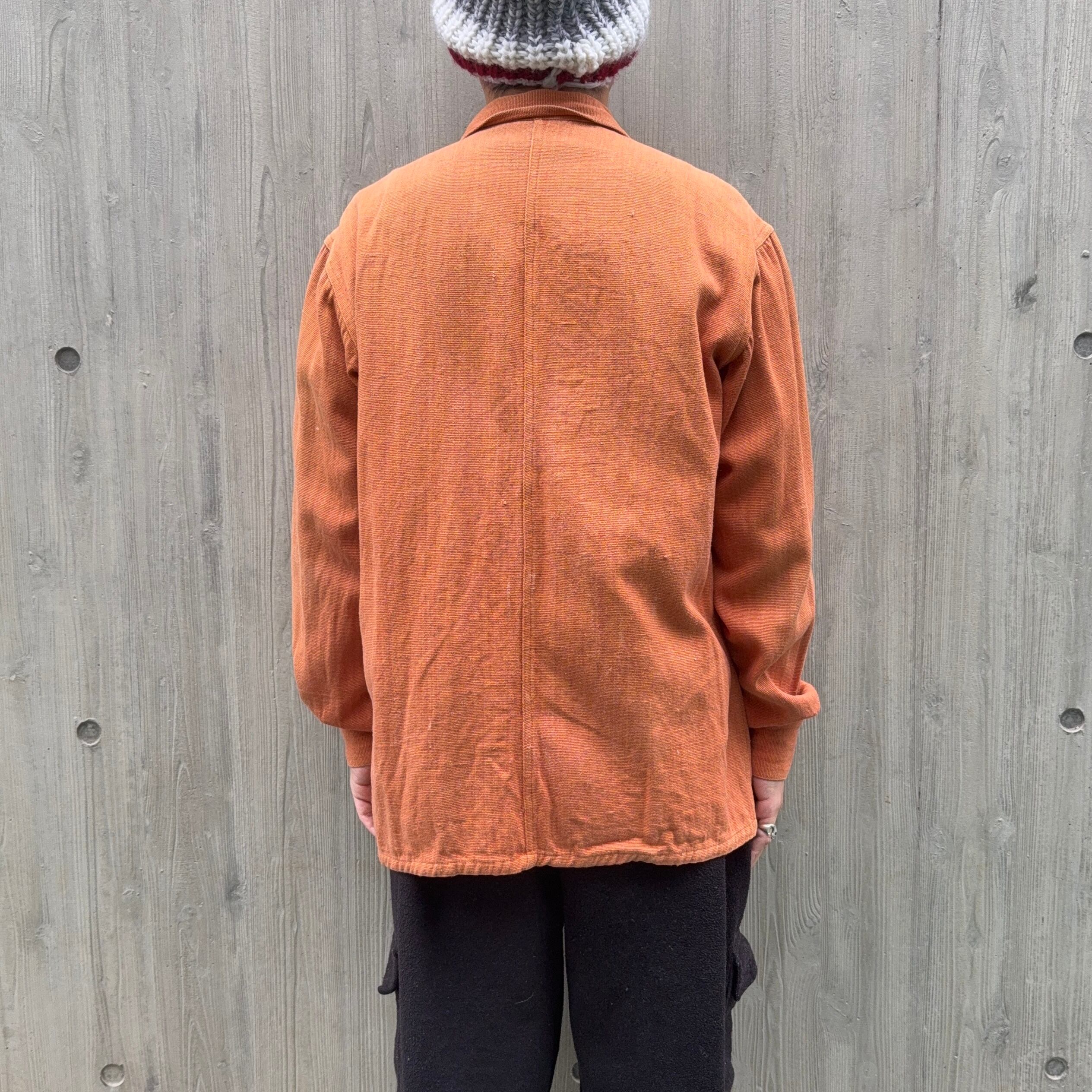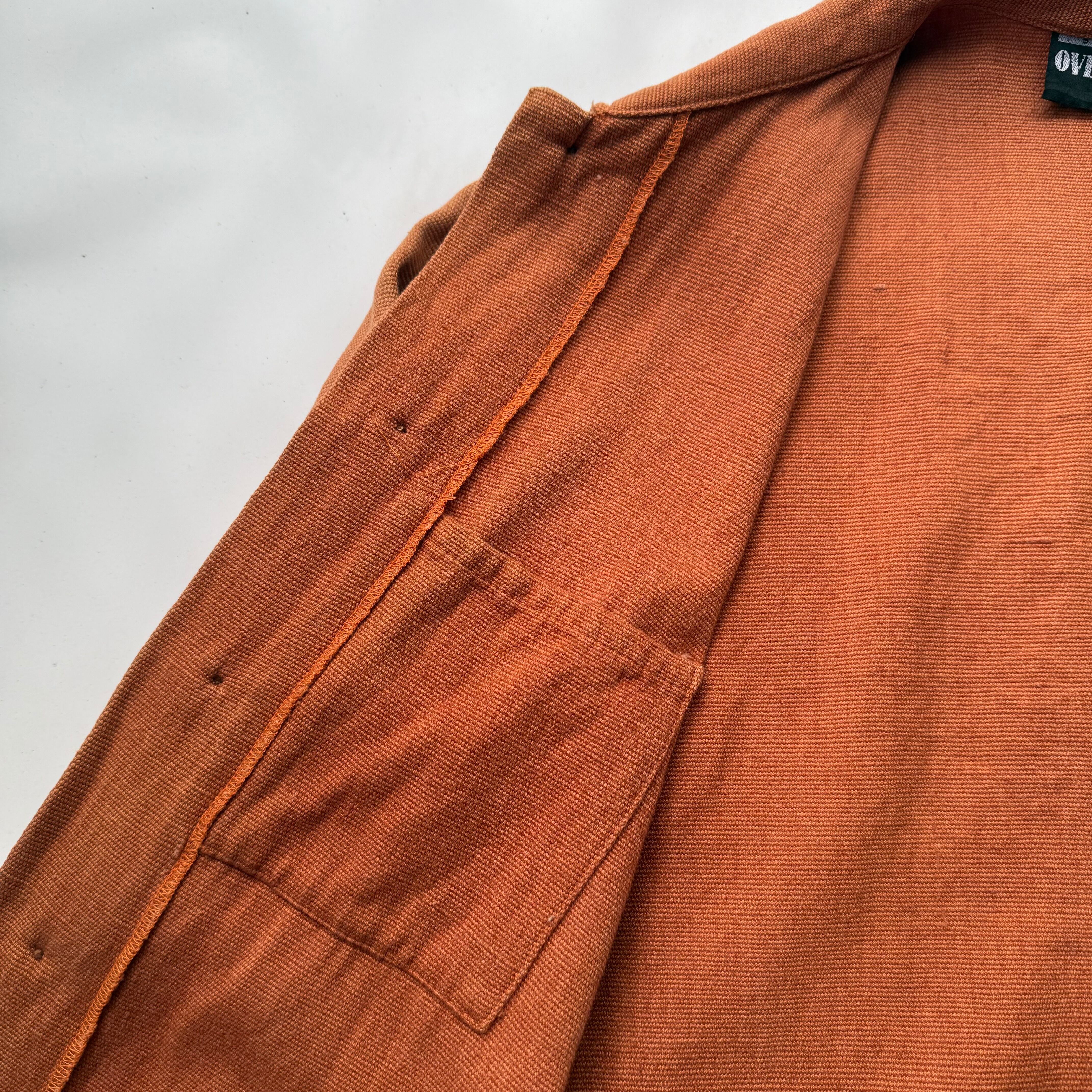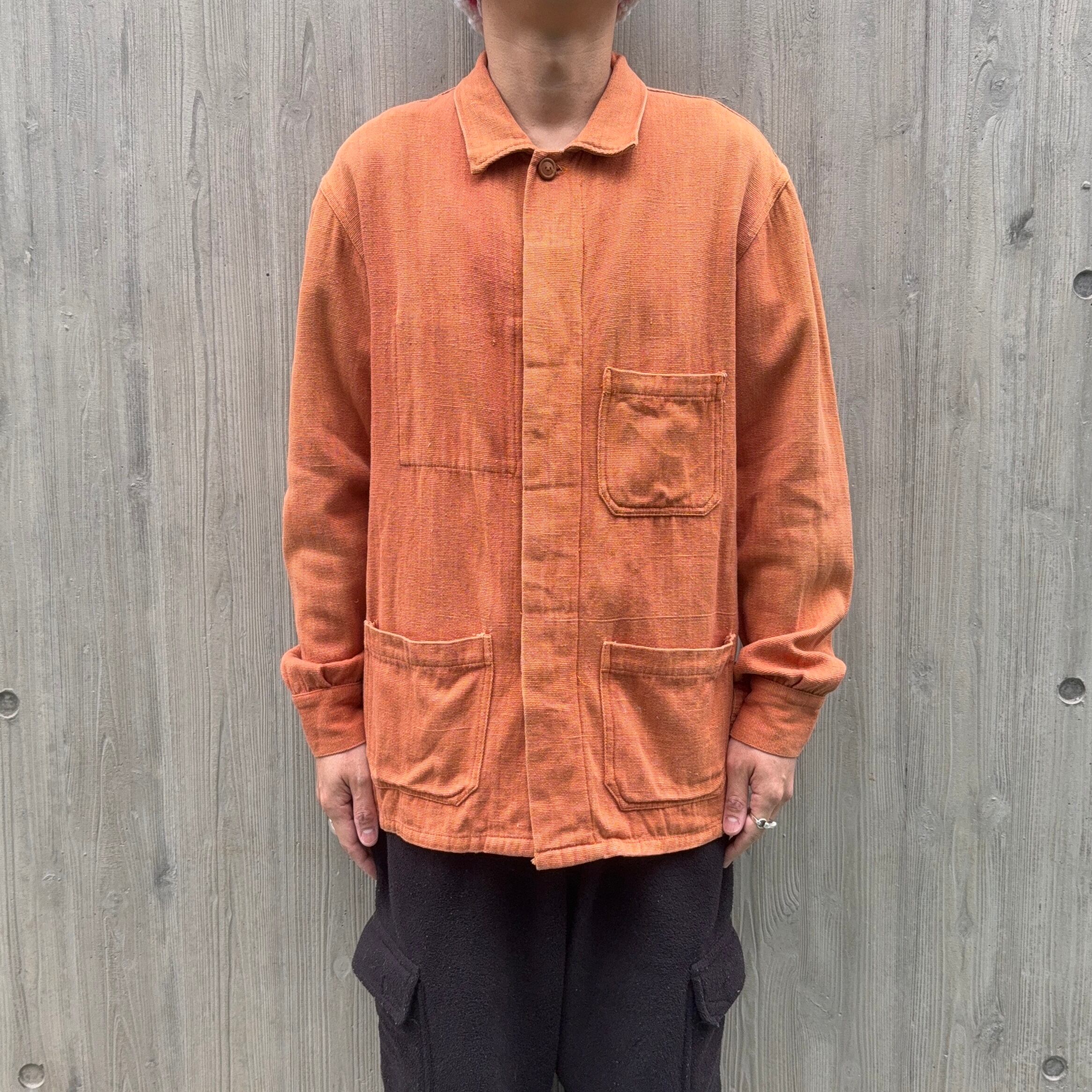 特徴的な柔道着をインド綿で作った(メキシカン味もある)ような乾いた質感のテキスタイルを製品染めしたようなオレンジ色のカバーオール。ボタンはウッドボタン、第一ボタン以外は比翼と言うあくまでデザインは少なくミニマルな印象、ワーク感が薄れてファッション味が生まれたフランスブランドらしい1着です。