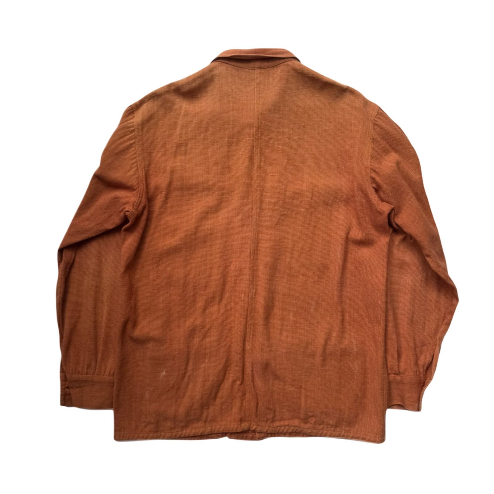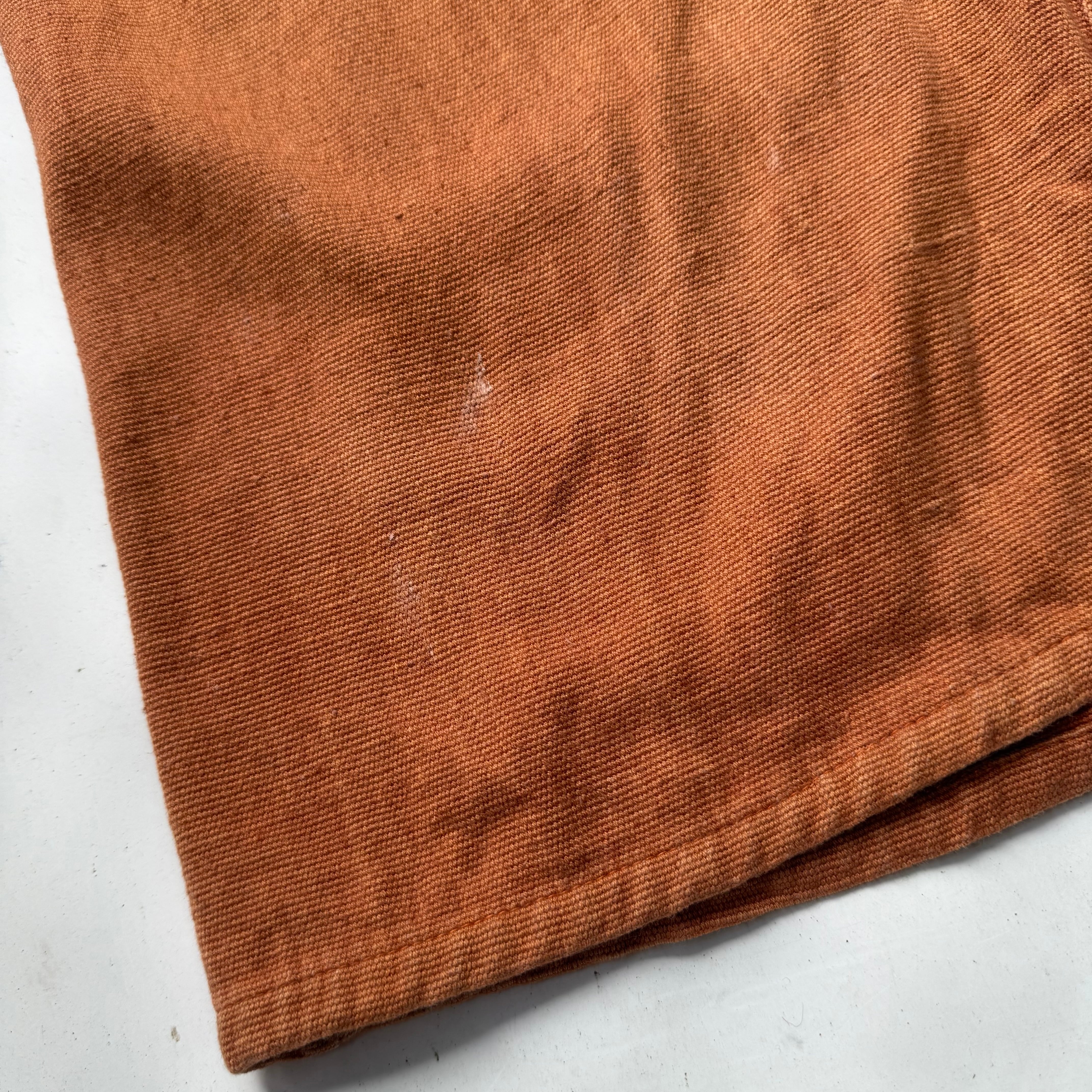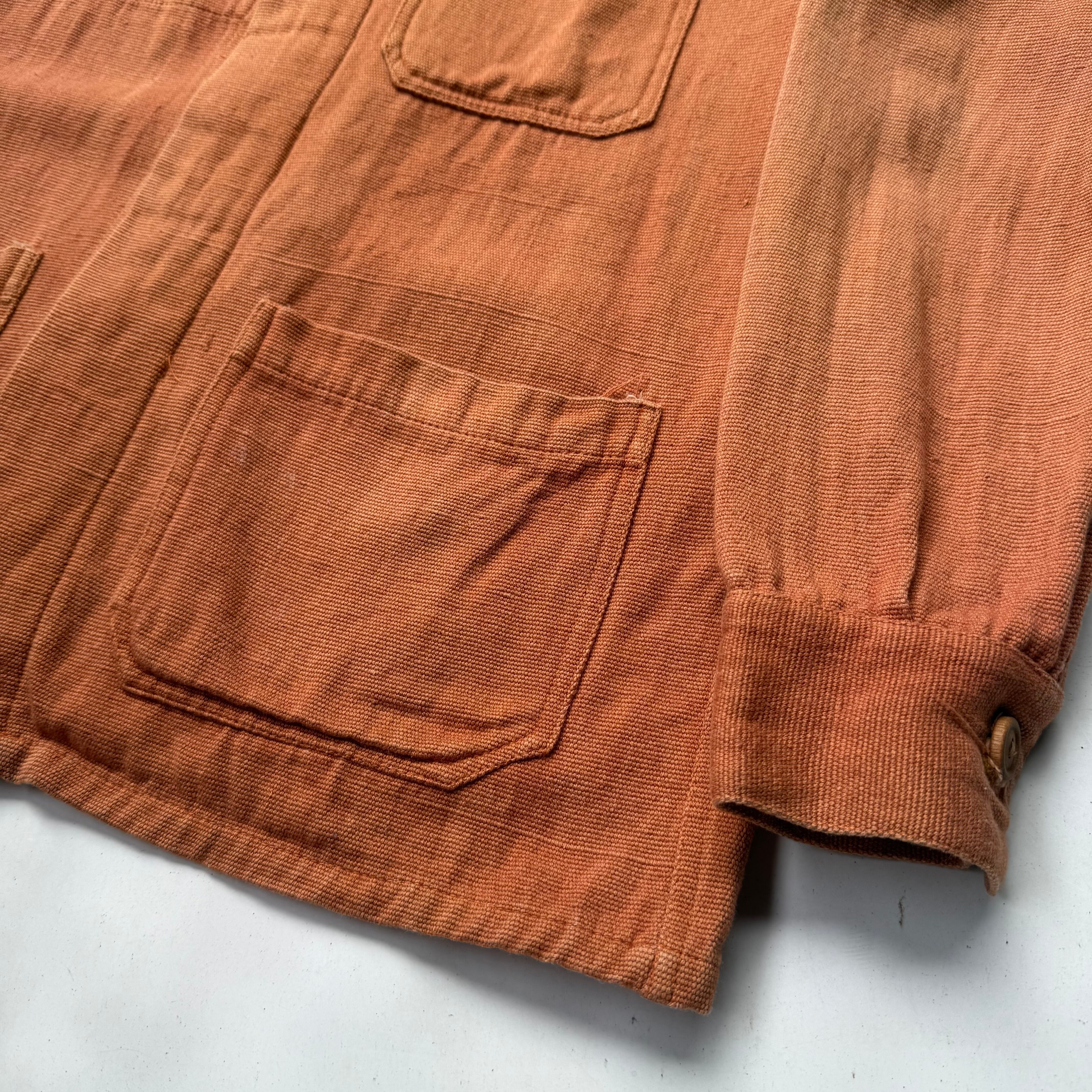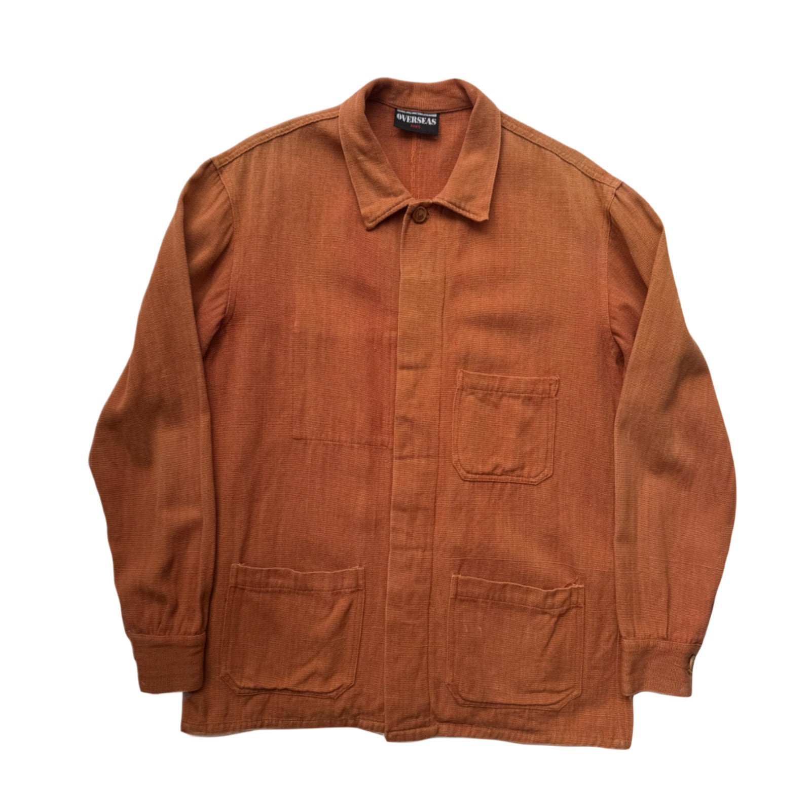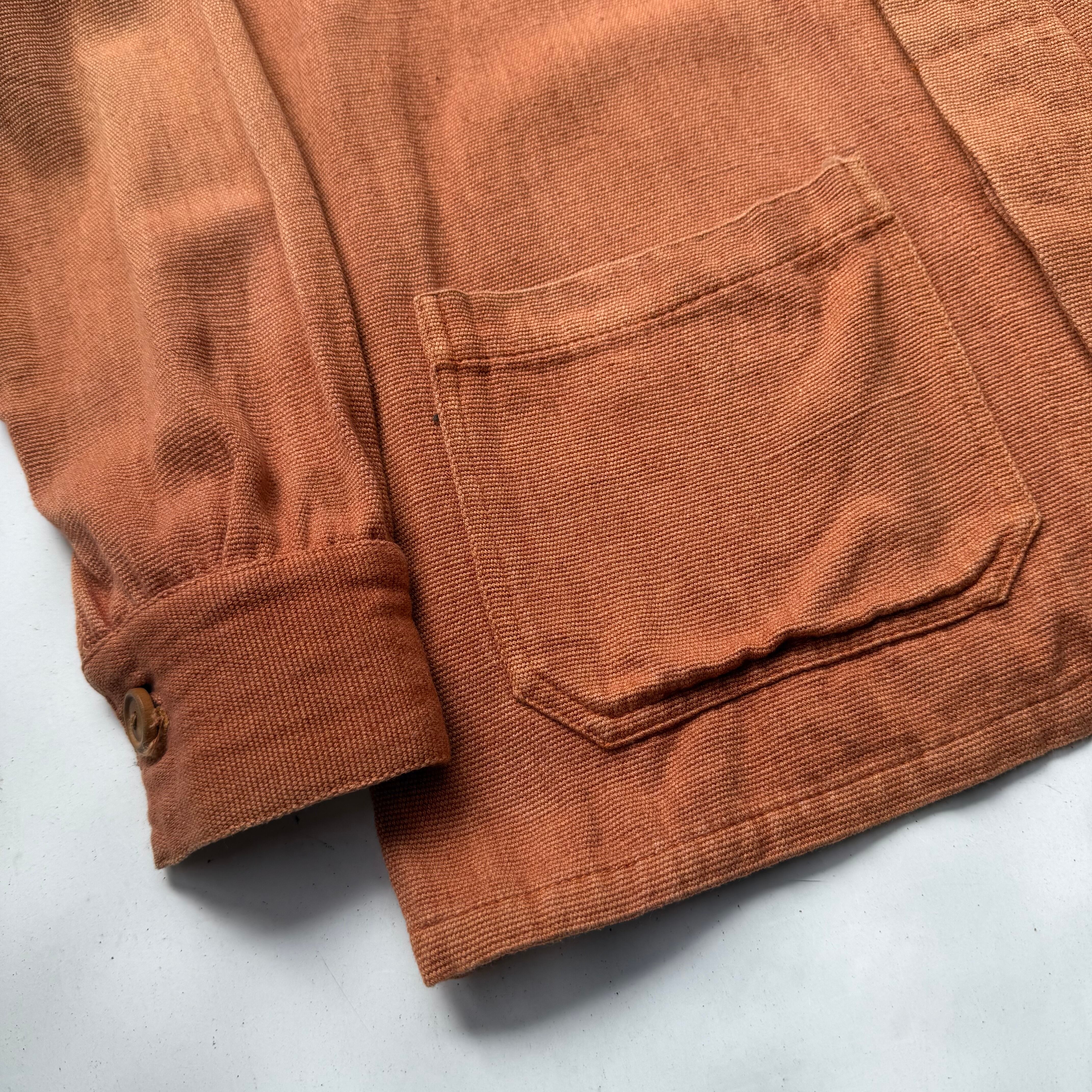 特徴的な柔道着をインド綿で作った(メキシカン味もある)ような乾いた質感のテキスタイルを製品染めしたようなオレンジ色のカバーオール。ボタンはウッドボタン、第一ボタン以外は比翼と言うあくまでデザインは少なくミニマルな印象、ワーク感が薄れてファッション味が生まれたフランスブランドらしい1着です。