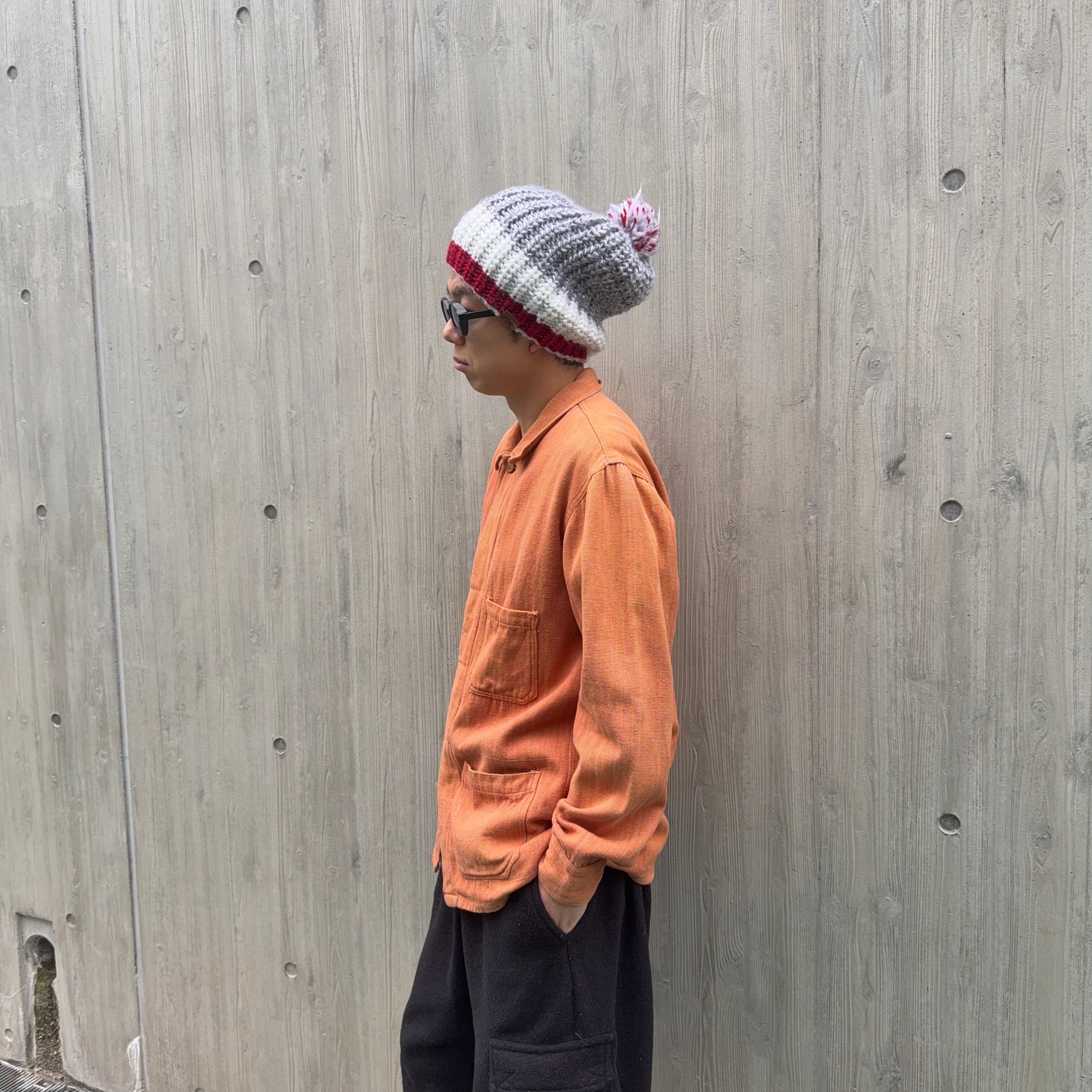 ハンドメイドのニット帽にオレンジ色のカバーオール。