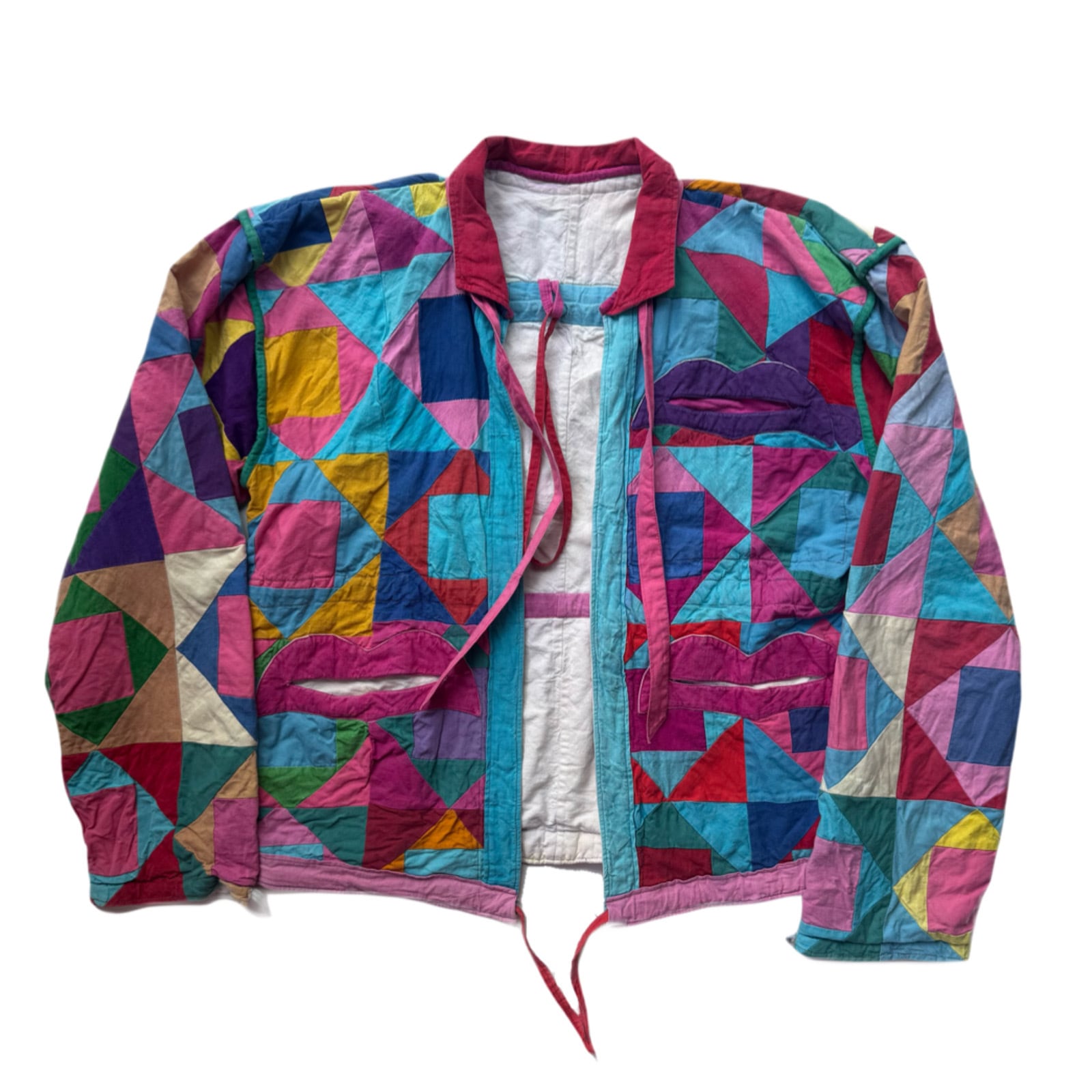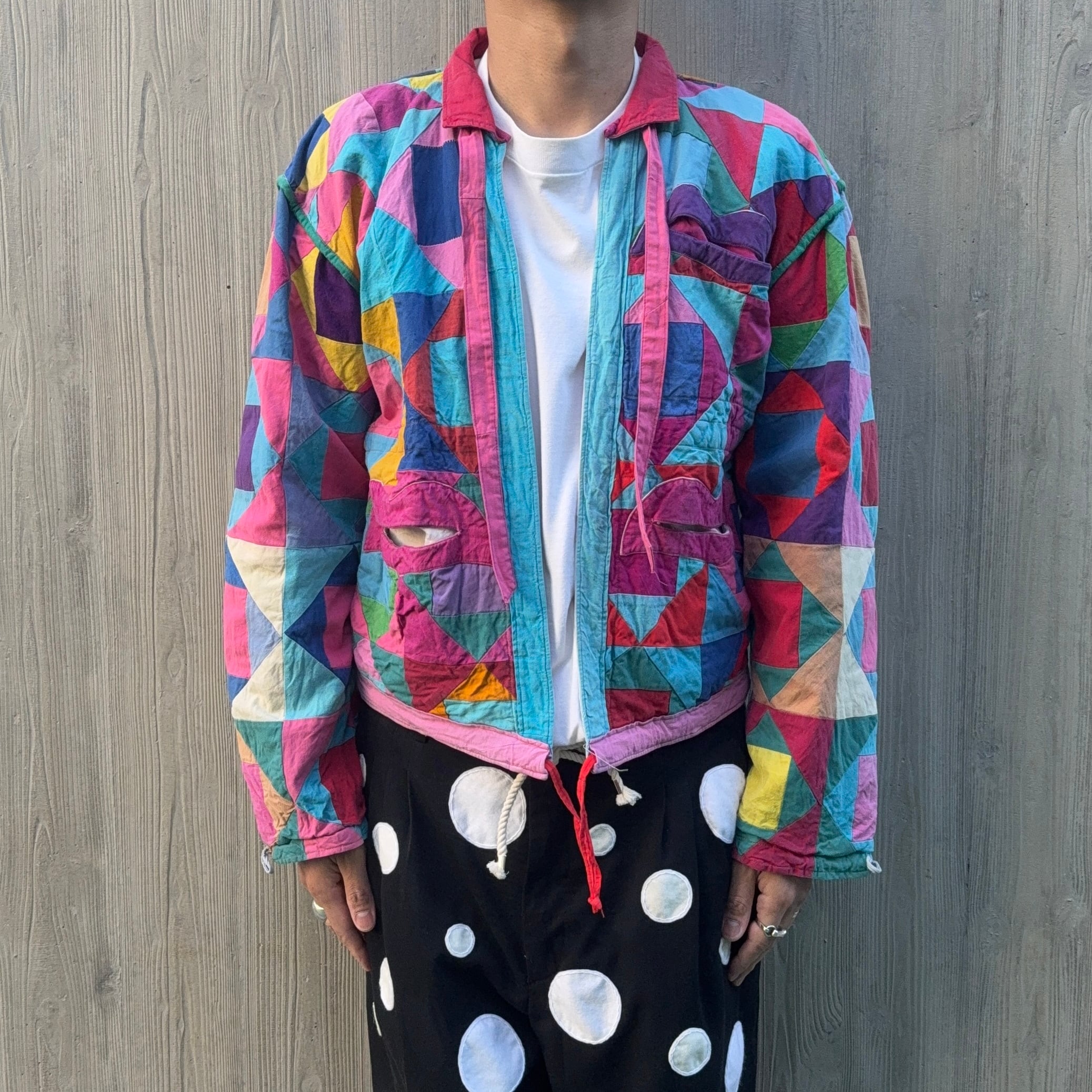 オールハンドメイドで仕上げられた、レトロポップな1点物のキルトジャケット。凄く丁寧なキルト使いと縫製、ハート(唇?)がポケットになっていたり、裏地にもポケットが沢山付いていて、”作り手の愛”を感じるアートピース。正直こう言うのって、本当に全く売れません(笑)が、こう言う”作り手の愛”を感じる物は、ついつい買ってしまうんです。衣装としてだけでなく、こう言うのをストリートで着ている人がいたらかわいいなぁって思うから、半ば意地だけ(笑)ですが、”kapital”や”Bode”などがお好きな方にもオススメしたいヤツです。女性の方、小柄な男性の方に是非(ボクが着ると少し小さめでした)。