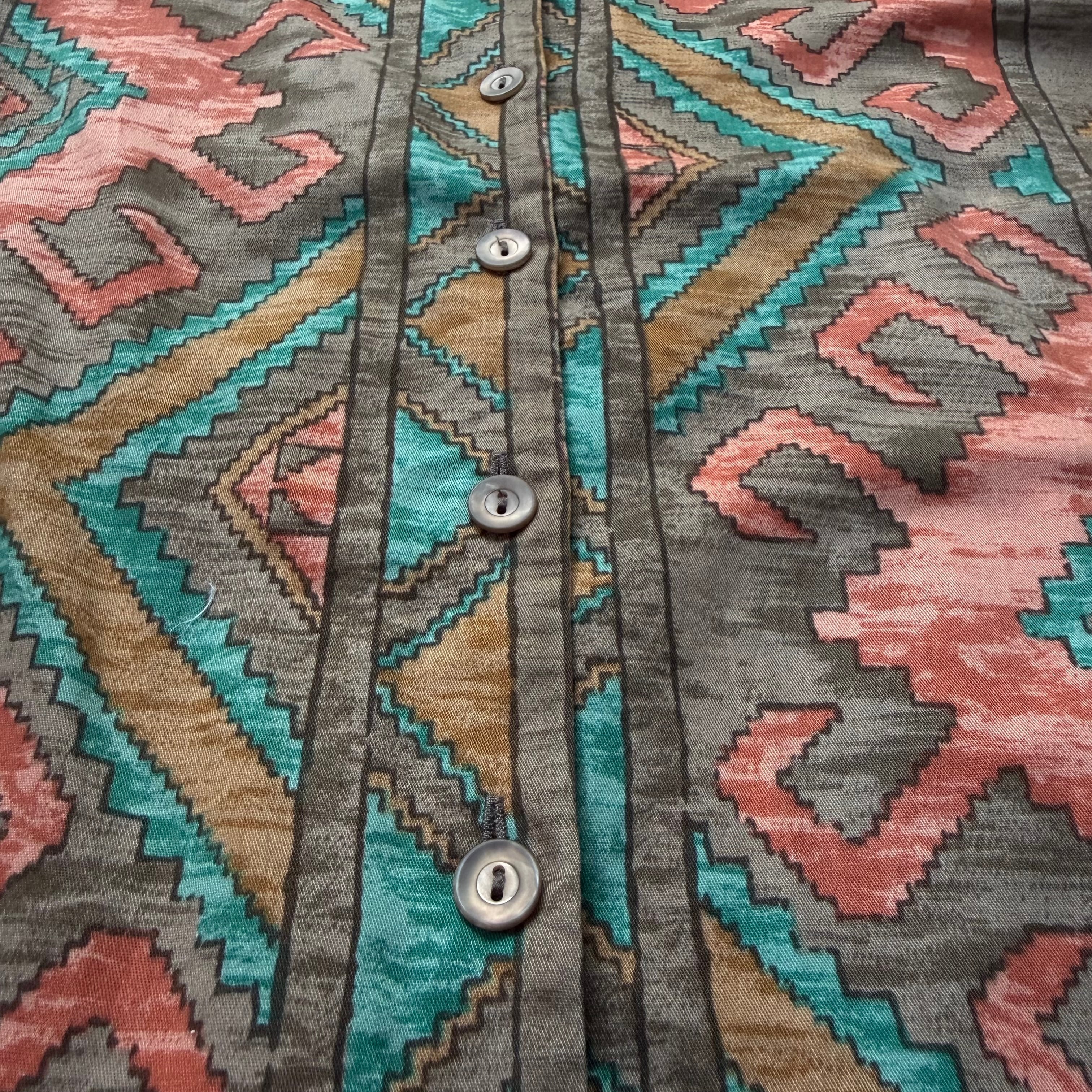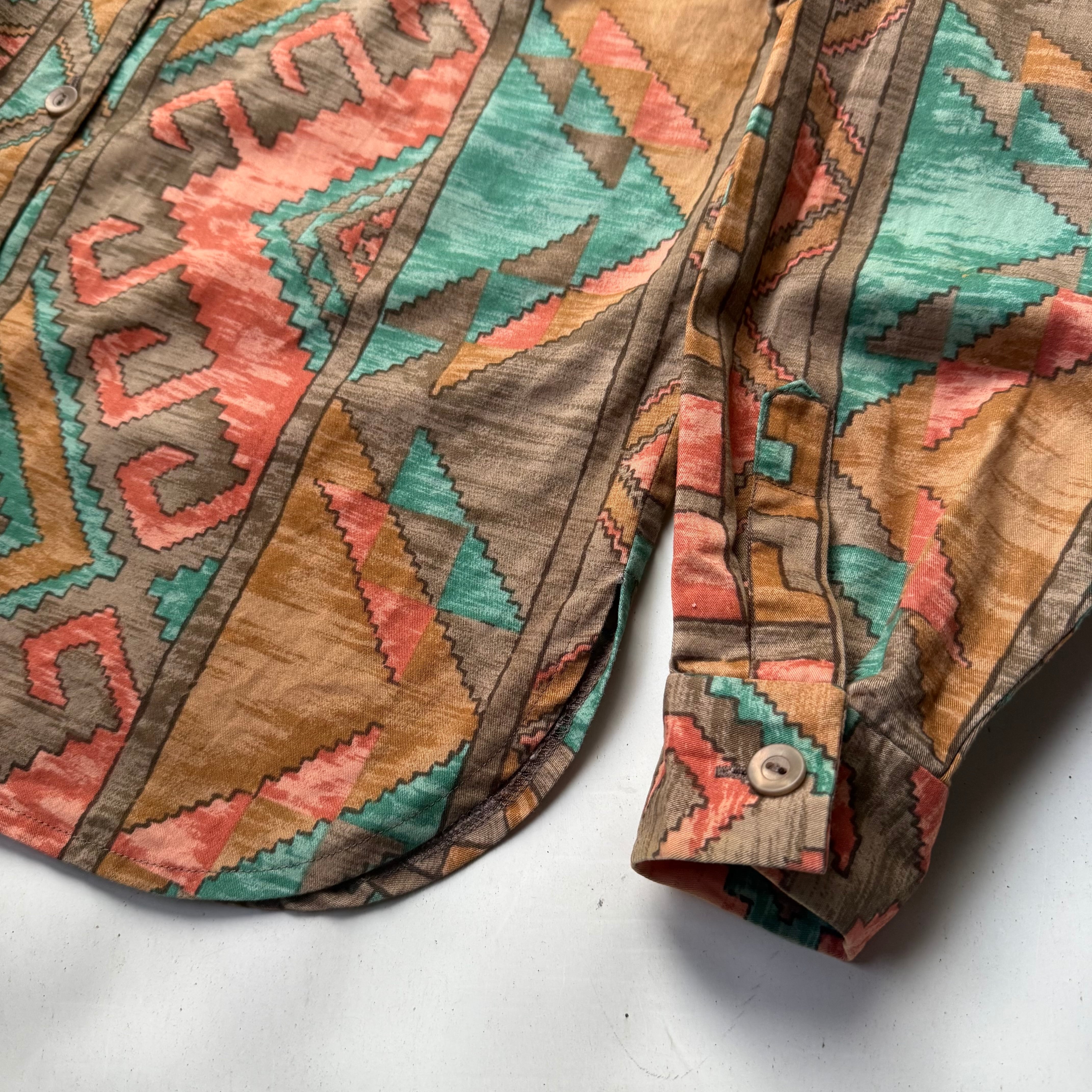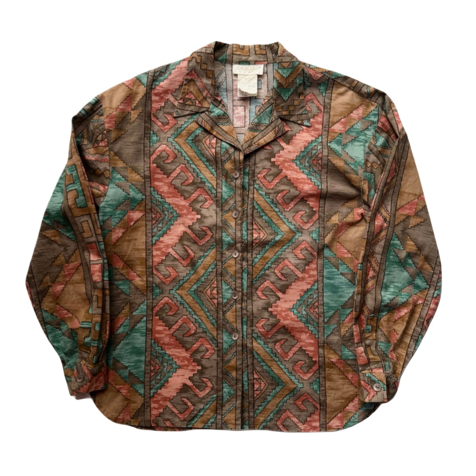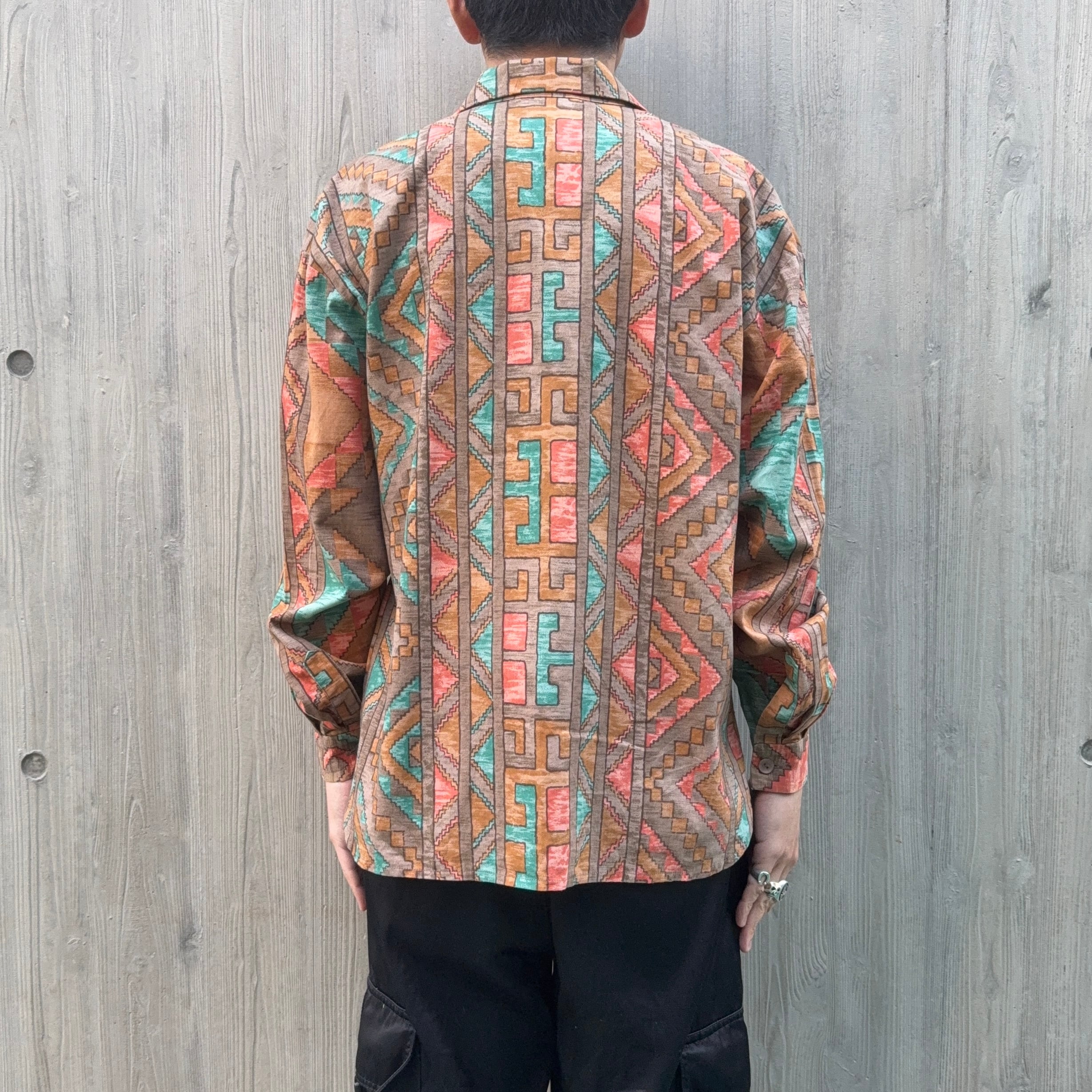 カナダのデザイナー “Linda Lundström(リンダ・ランドストローム) による先住民族の文化にインスパイアされたデザインシャツ。古着だと、どぎついイメージや思想強めな印象のある”幾何学模様”ですが、コレは何処か柔らかさがあるなぁと思い選びました。芸術的な「Art to Wear(着るアート)」のスタイルでカナダでは人気なヴィンテージブランドのようです。ボックスシルエットなのに、ラウンドしたシルエットも洒落てます。