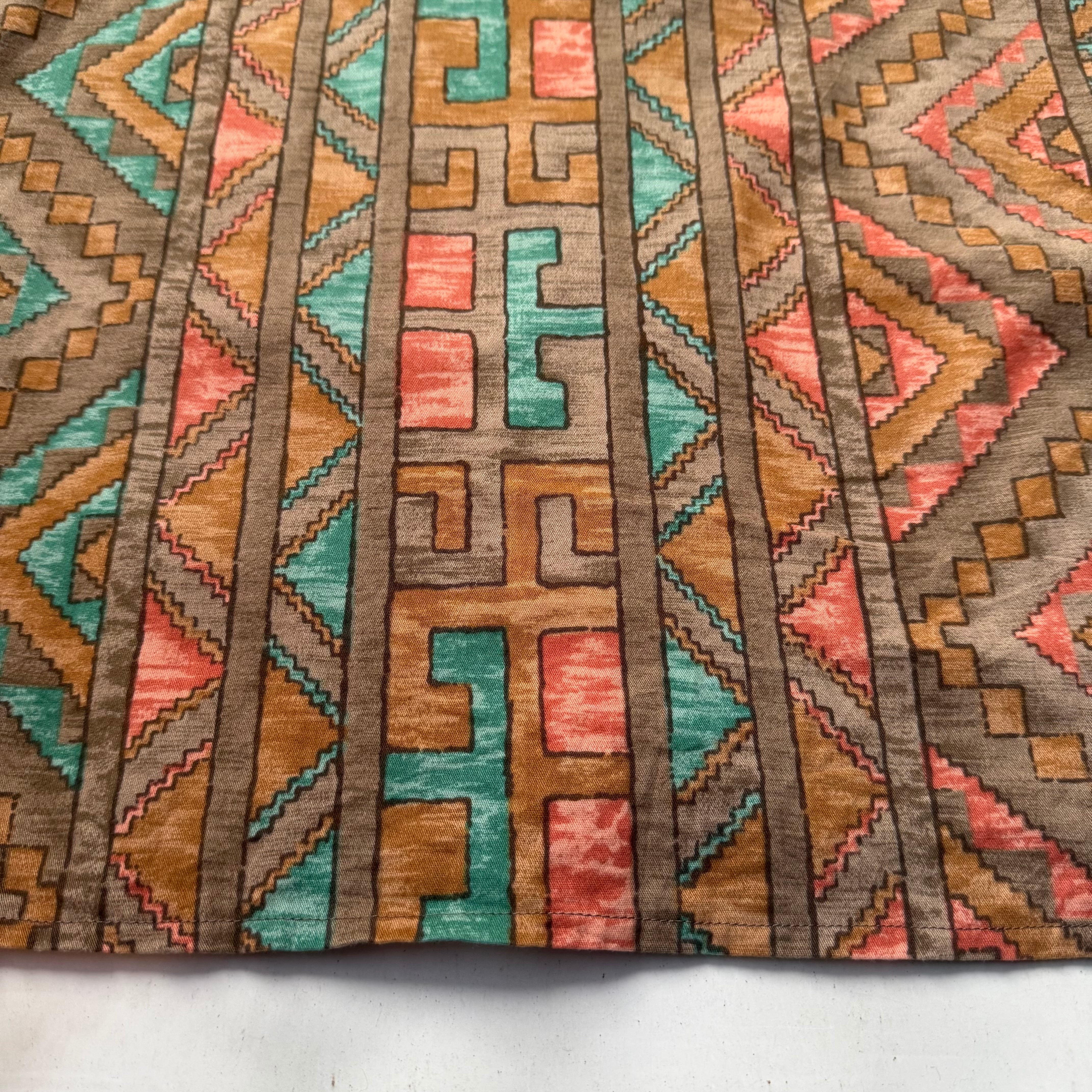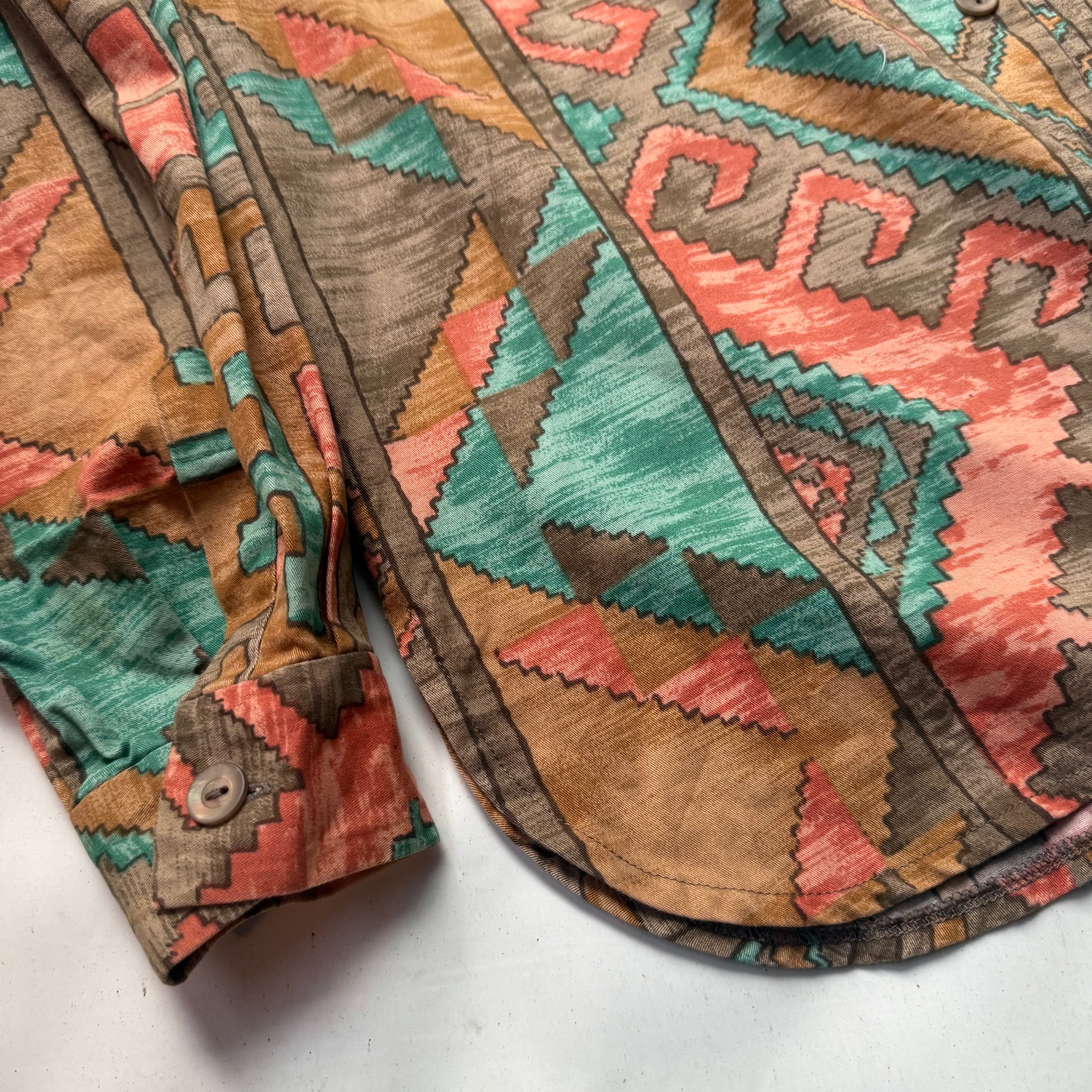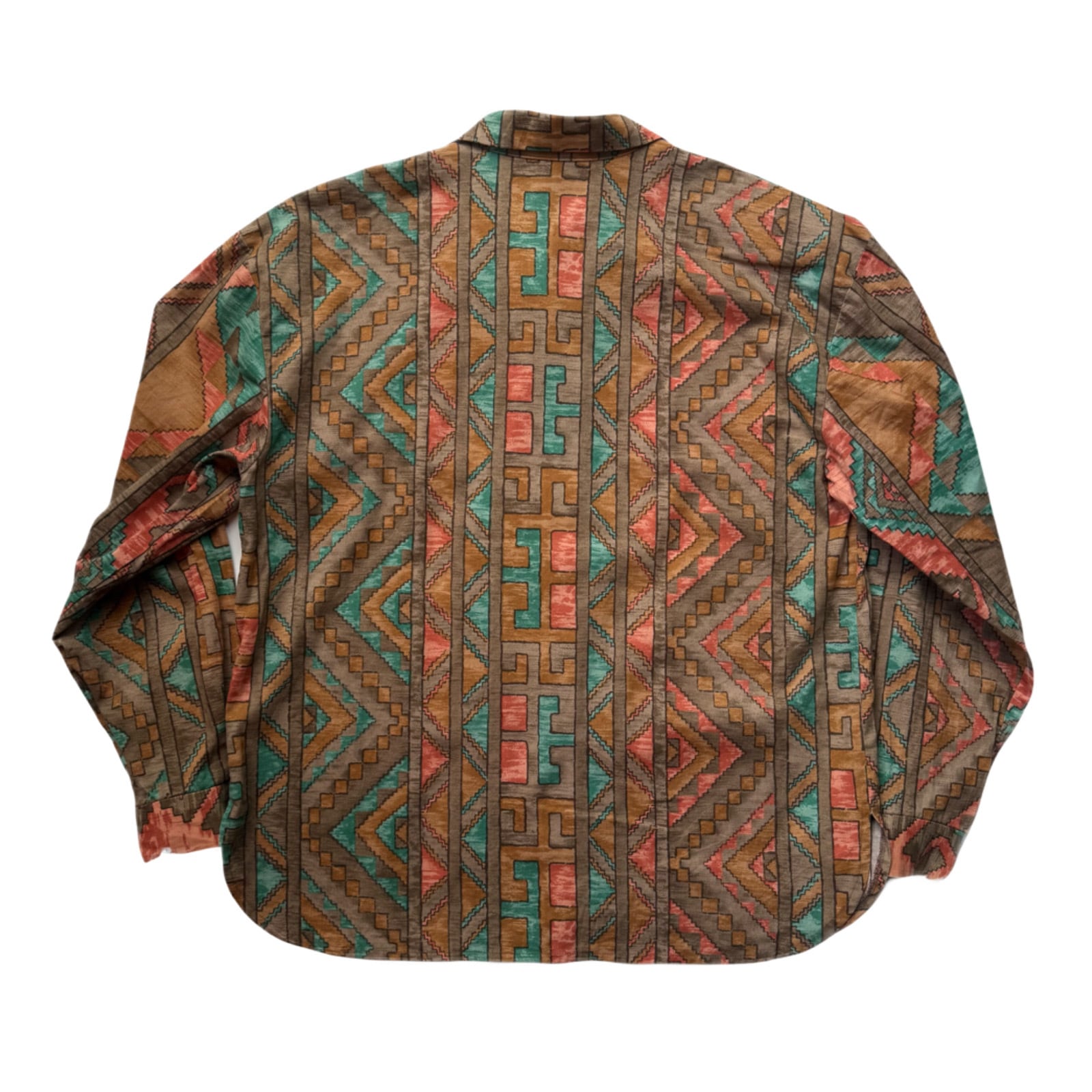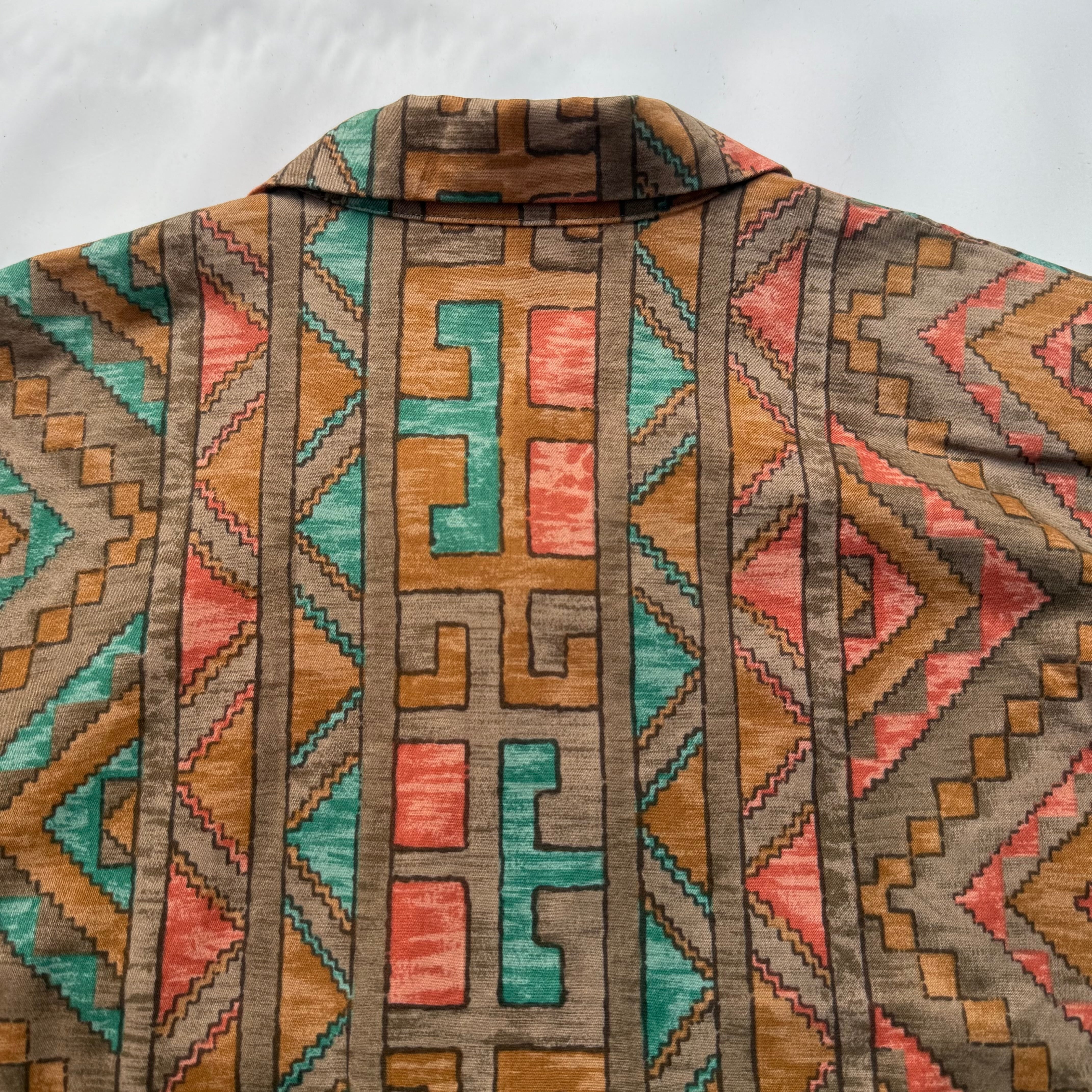 カナダのデザイナー “Linda Lundström(リンダ・ランドストローム) による先住民族の文化にインスパイアされたデザインシャツ。古着だと、どぎついイメージや思想強めな印象のある”幾何学模様”ですが、コレは何処か柔らかさがあるなぁと思い選びました。芸術的な「Art to Wear(着るアート)」のスタイルでカナダでは人気なヴィンテージブランドのようです。ボックスシルエットなのに、ラウンドしたシルエットも洒落てます。