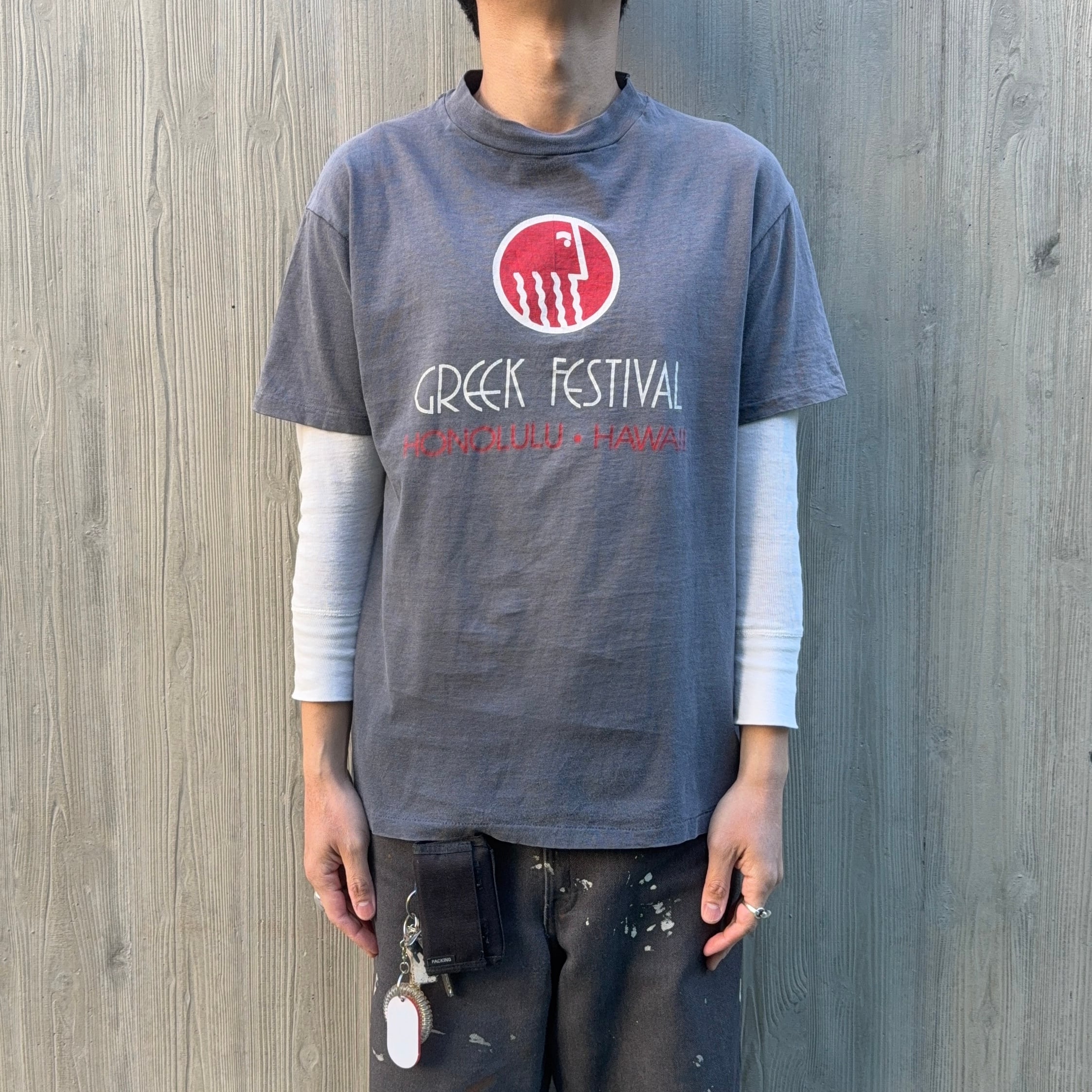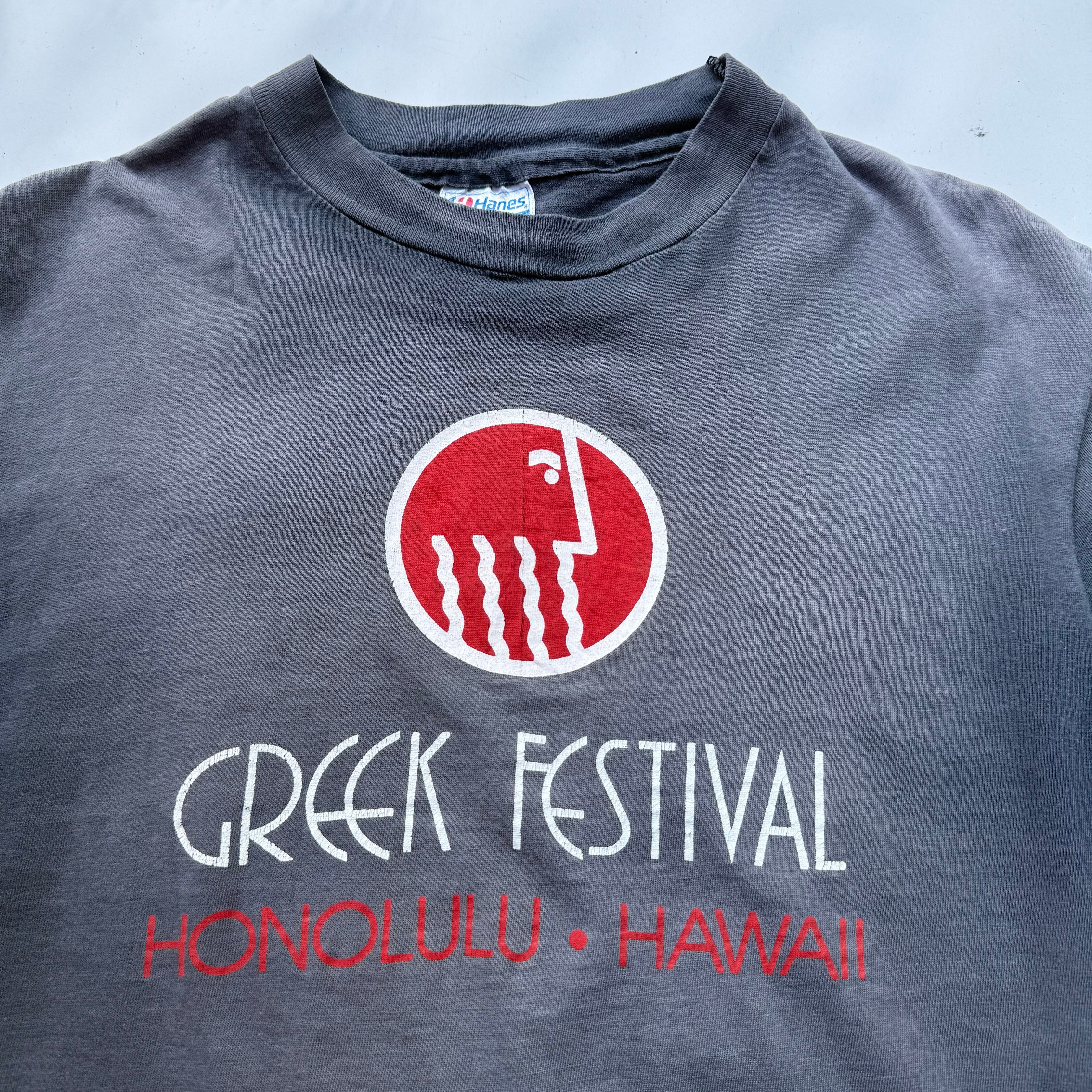 ハワイに住むギリシャ系コミュニティが自分たちの文化、食、ダンス、伝統を祝うために毎年開催しているイベントのようです。Tシャツに描かれている赤い円形のロゴは、ギリシャ神話や伝統的な装飾をモチーフでデザインとしても着やすい1着で、こんなにテロテロでフェードしているのにダメージはほぼなしと大切に着られていたんだなぁと思いました。最後のオーナーになってくれる方に是非。