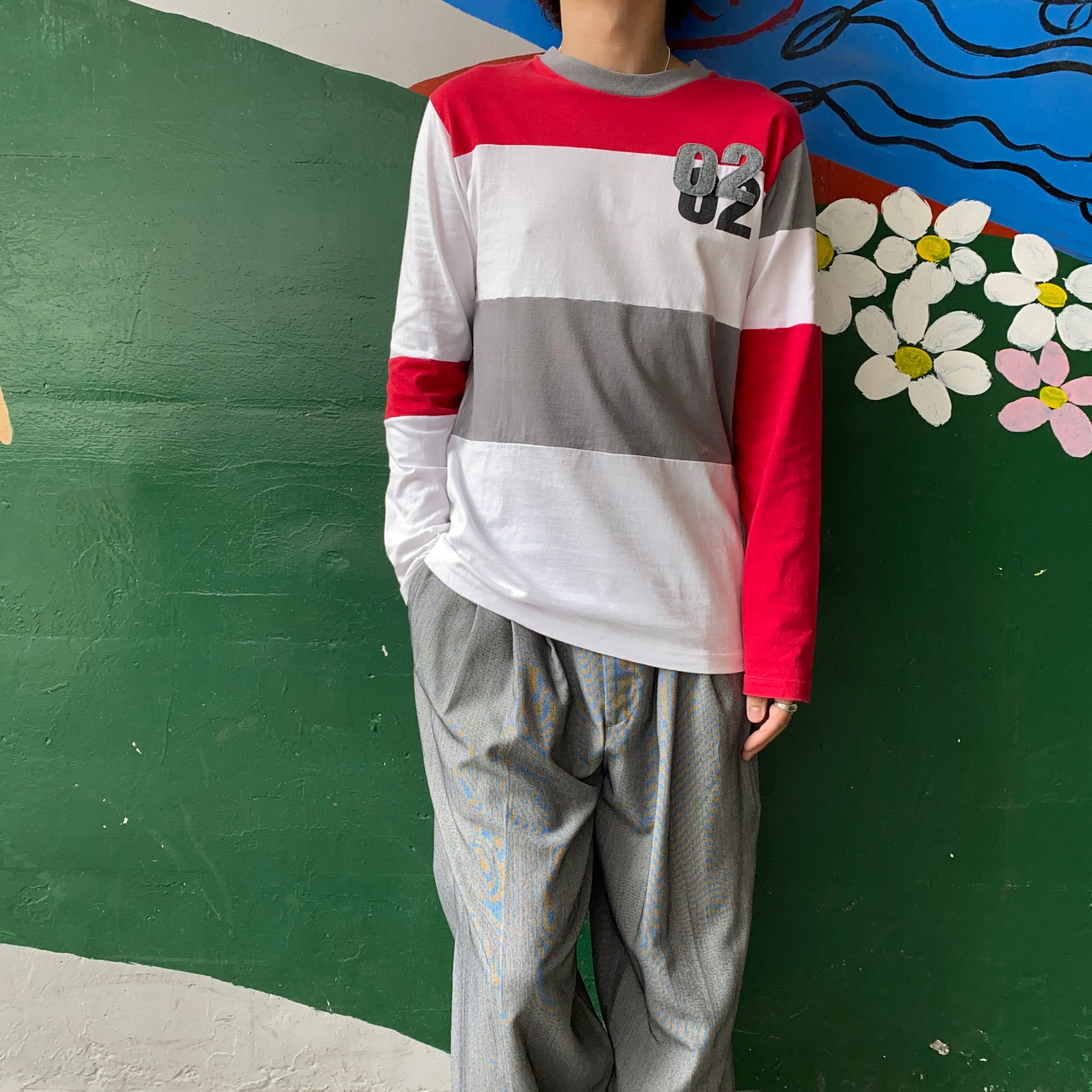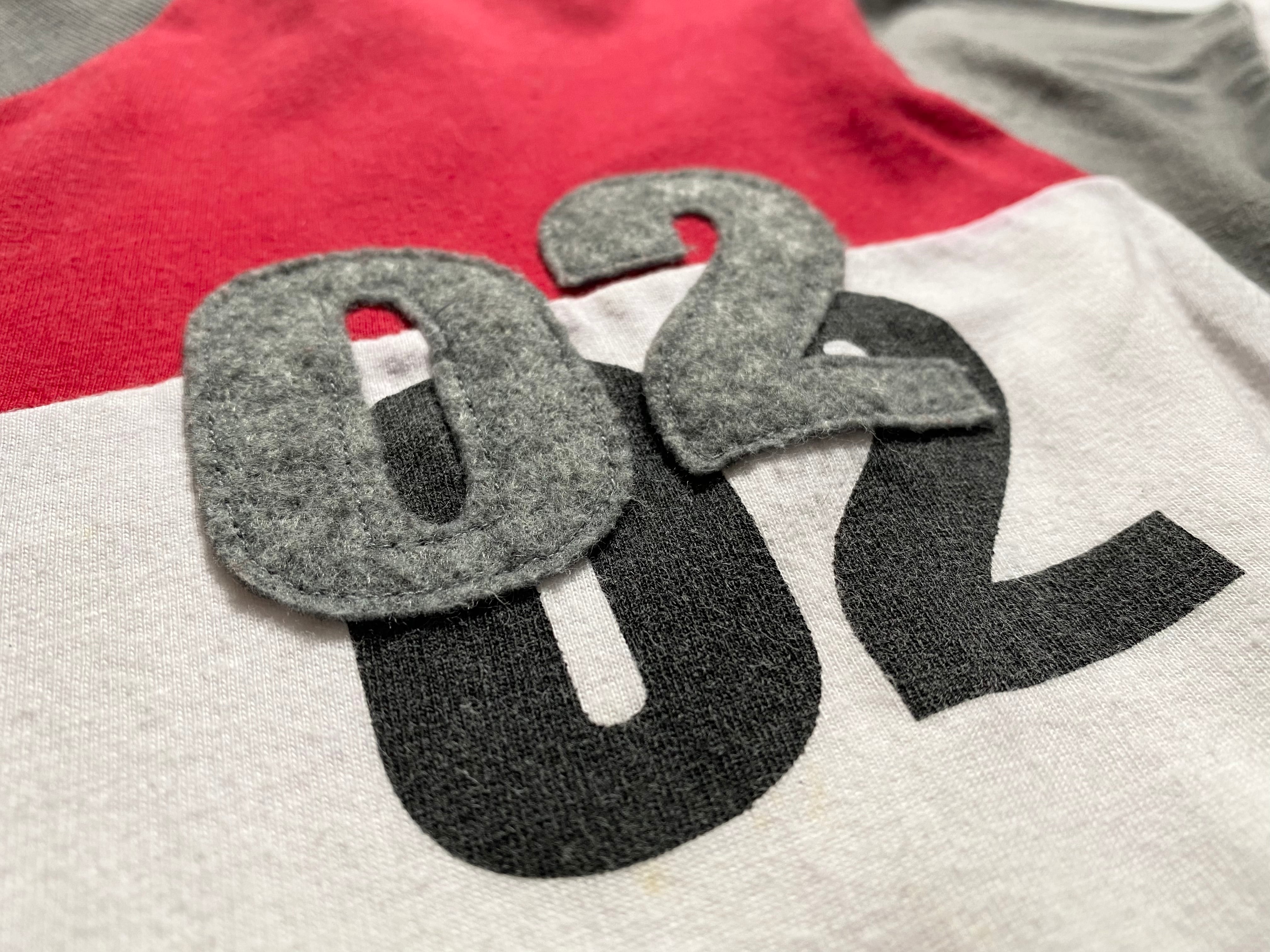 それから時が立ち10代の後半に、原宿のミルクボーイでこの洋服を買った思い出がある。ジップは付いていなかったが、ボクはその中学生の頃にカッコ良いなと感じたアシンメトリーのカットソーを何処かイメージして買ってしまっていたのかもしれない。今見ると、プリントじゃなく生地を切り替えていたり、わざわざ日本製で作っていたりと90年代の残り香を感じますね。”02”の胸もプリントとフェルトを使って立体感を出していたり、色々無駄があって最高ですね。