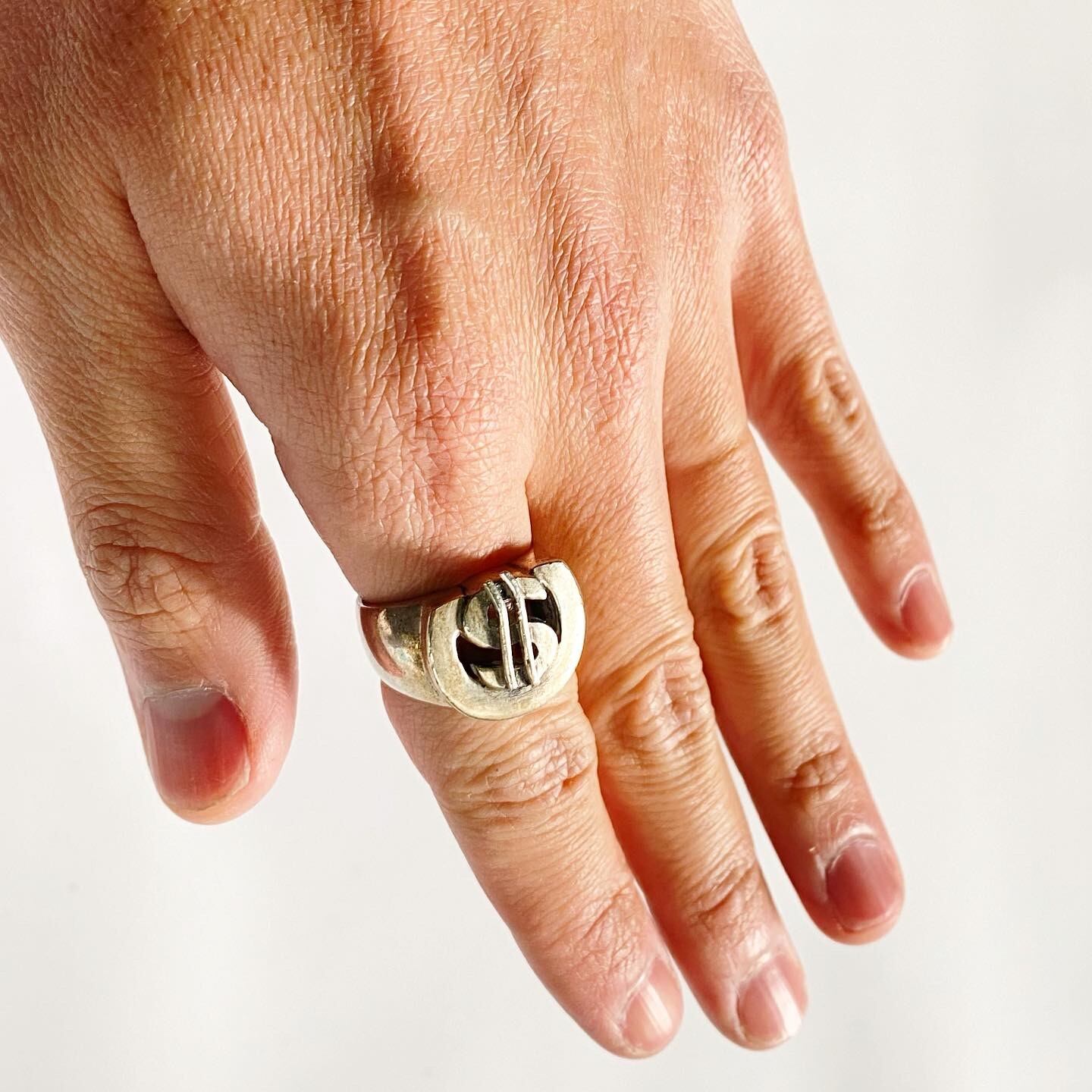 チャンキーなドルマークのシルバーリング。ストリートは勿論、上品なルックのハズシにも使えるアイテムかと思います。なんだか、1つ付けるだけで悪そうです(笑)。