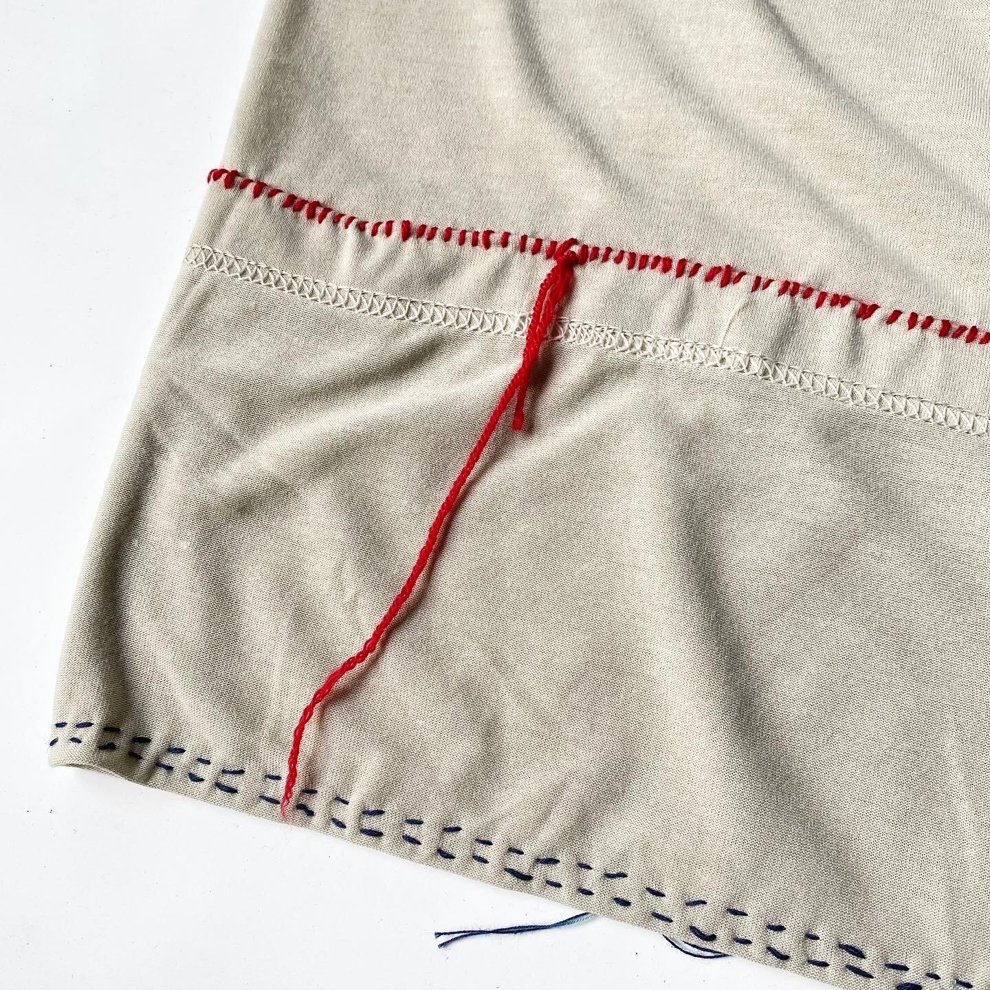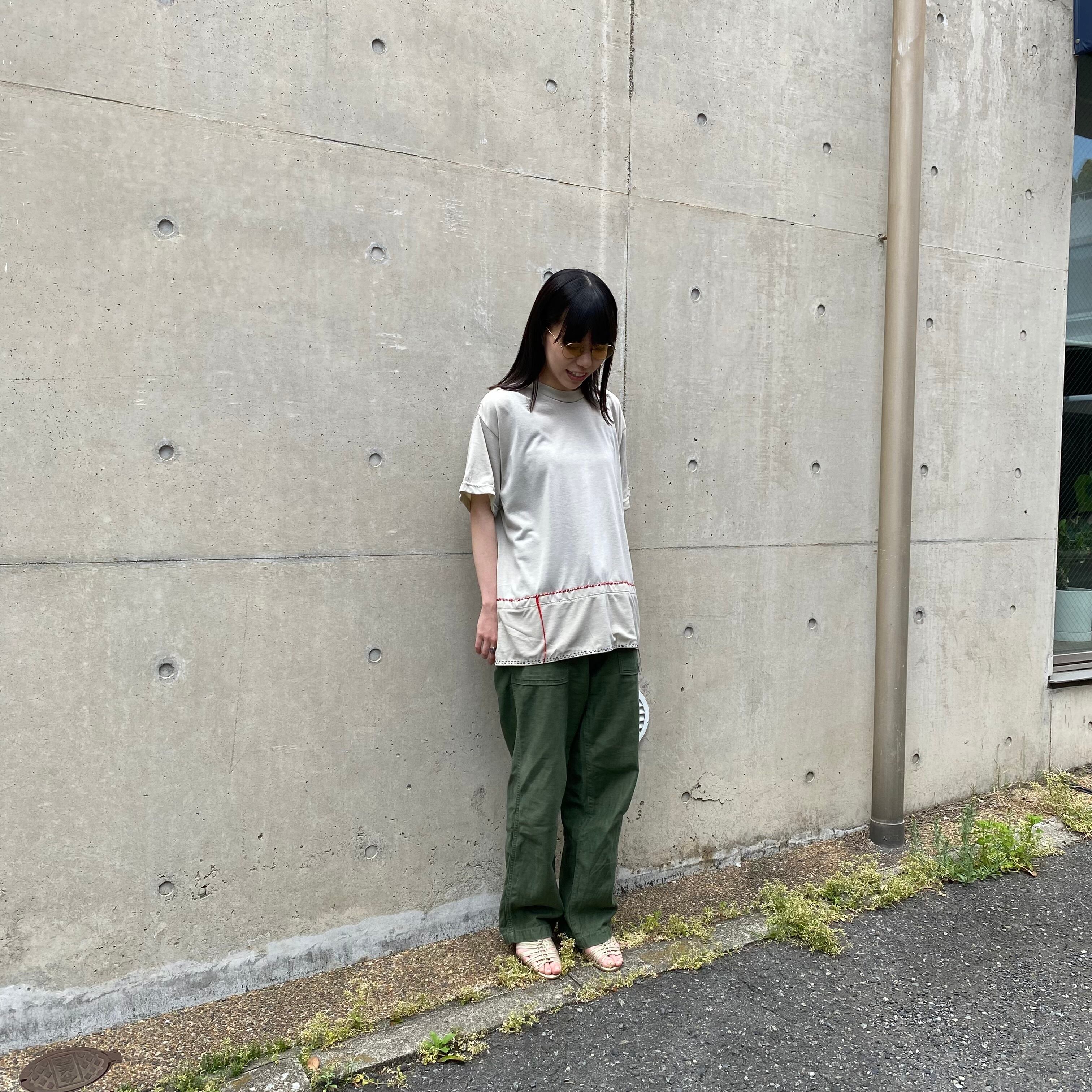 米軍に納品を行っているDSCP(Defence Supply Center Philadelphia)のUS ARMYのトレーニングTシャツ(Dead Stock)のボディーの胸、首後ろに全てシルクスクリーンプリントを入れて、独自の1点1点染めの入った毛糸のハンドステッチ(わざとホツレたような技法)で裾上げをしています。ハンドステッチの為、1点1点微妙に異なりますので、ご了承ください(オンラインショップの場合ですと、アソートとなります。)