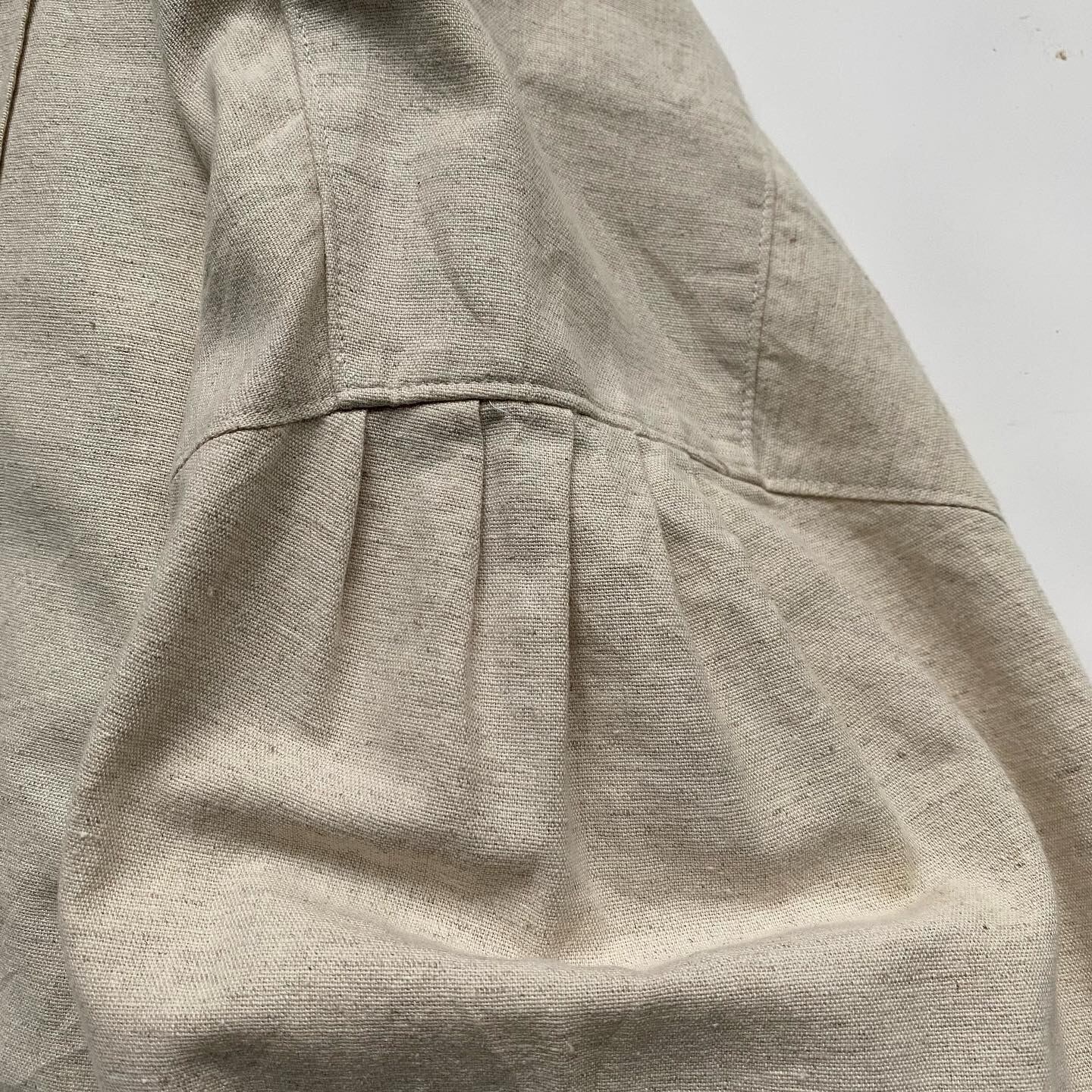 チロリアンシャツだけに、ディテールが丁寧な作りですが、装飾や刺繍にやり過ぎ感がなくサラッと羽織れるタイプです。素材もコットンリネンで着心地も良く、肩やバックに入る細かく寄せてあるギャザーによりキレイなドレープが出てフワっとしたシルエットです。男女問わずルーズに着るとかわいいかなと思います。