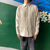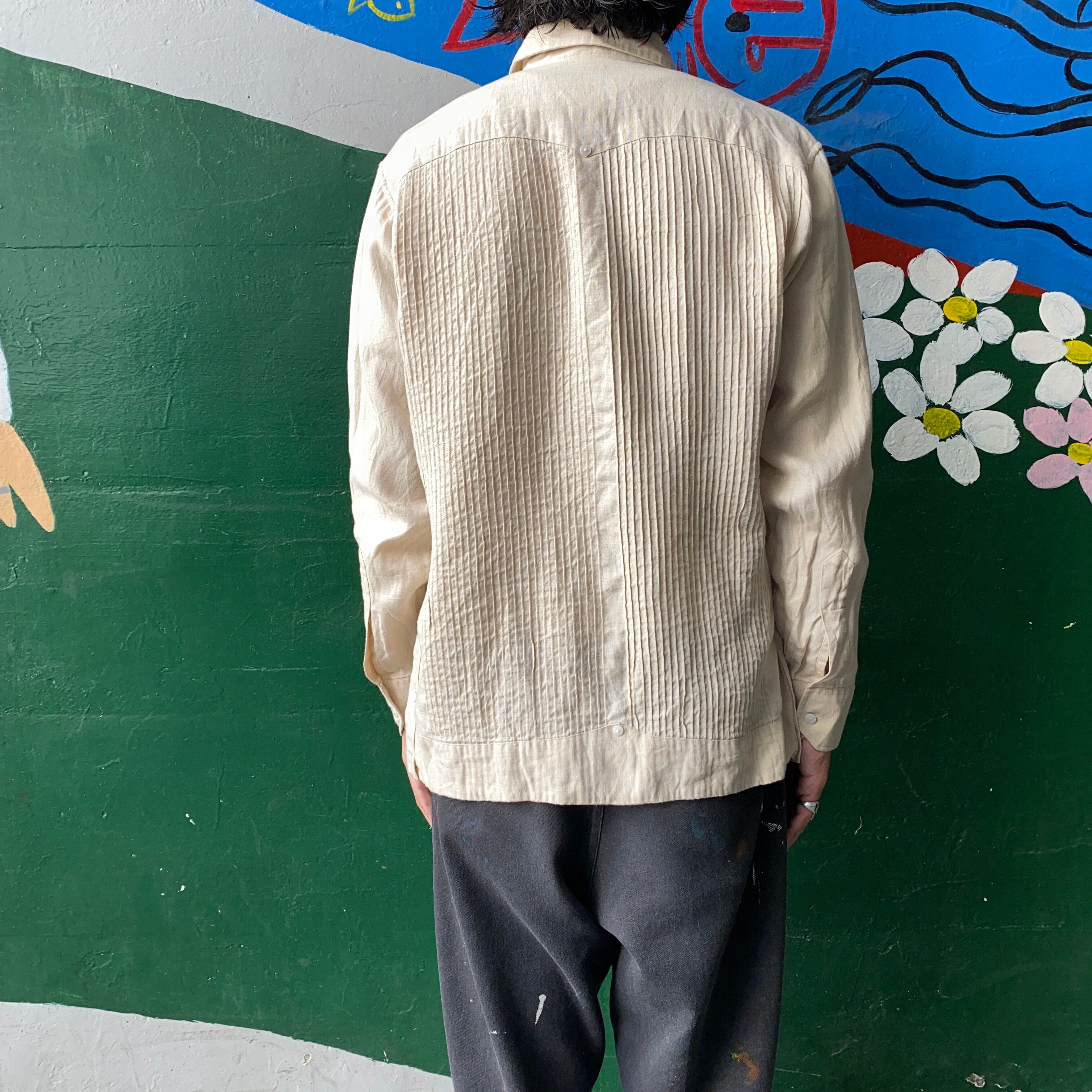 キューバシャツをベースにプリーツ仕上げにリネンを使ったドレスカジュアルな独特な仕上がり。随分と細かなディテールかつ、肉厚で良いリネン素材を使っているなぁと思い調べてみると、現在もメキシコに存在している高級なブティックの物でした。胸にはペン差しポケット、サイドのスリットは下の1つのみ外れる仕様、質の高いリネンシャツをお求めの方は是非。