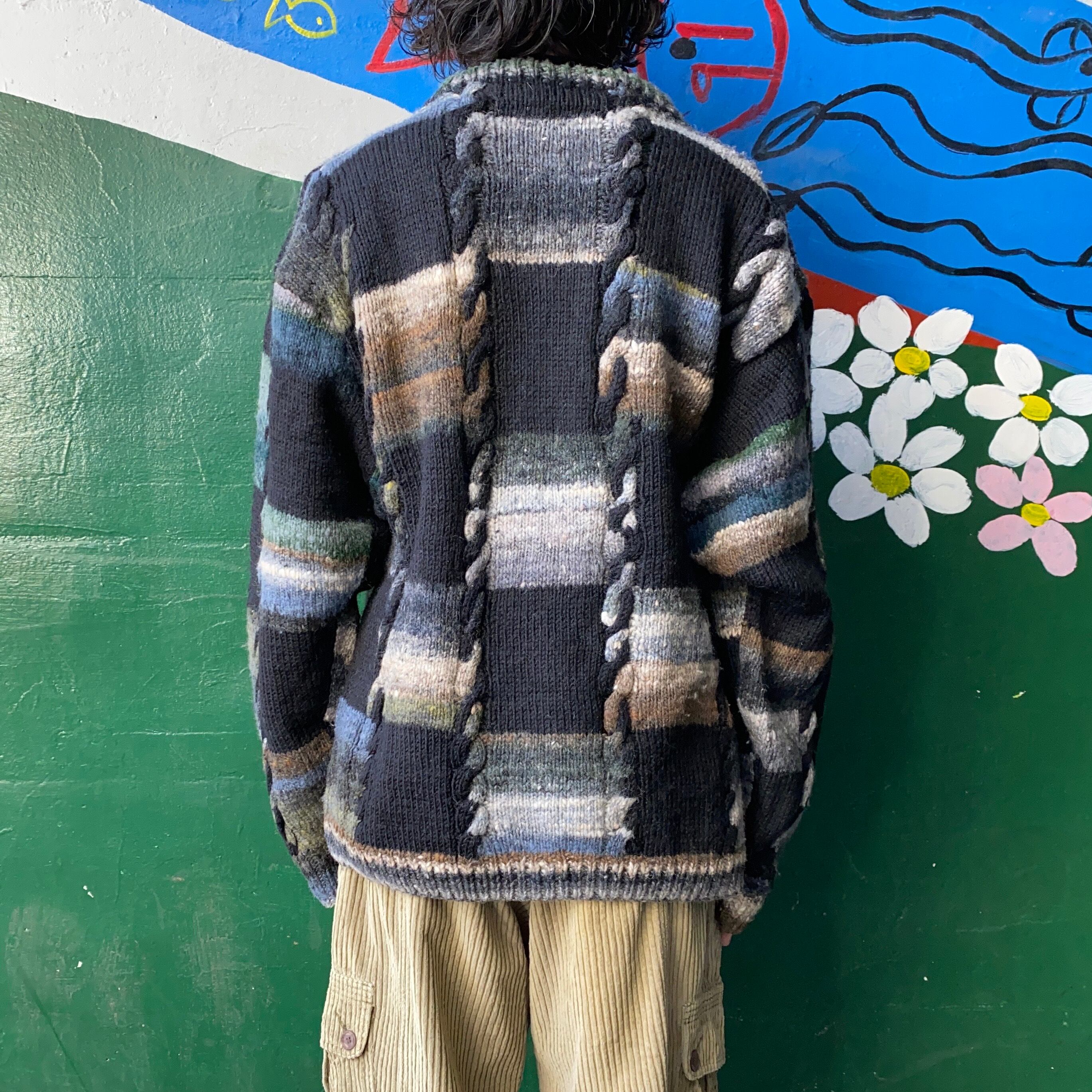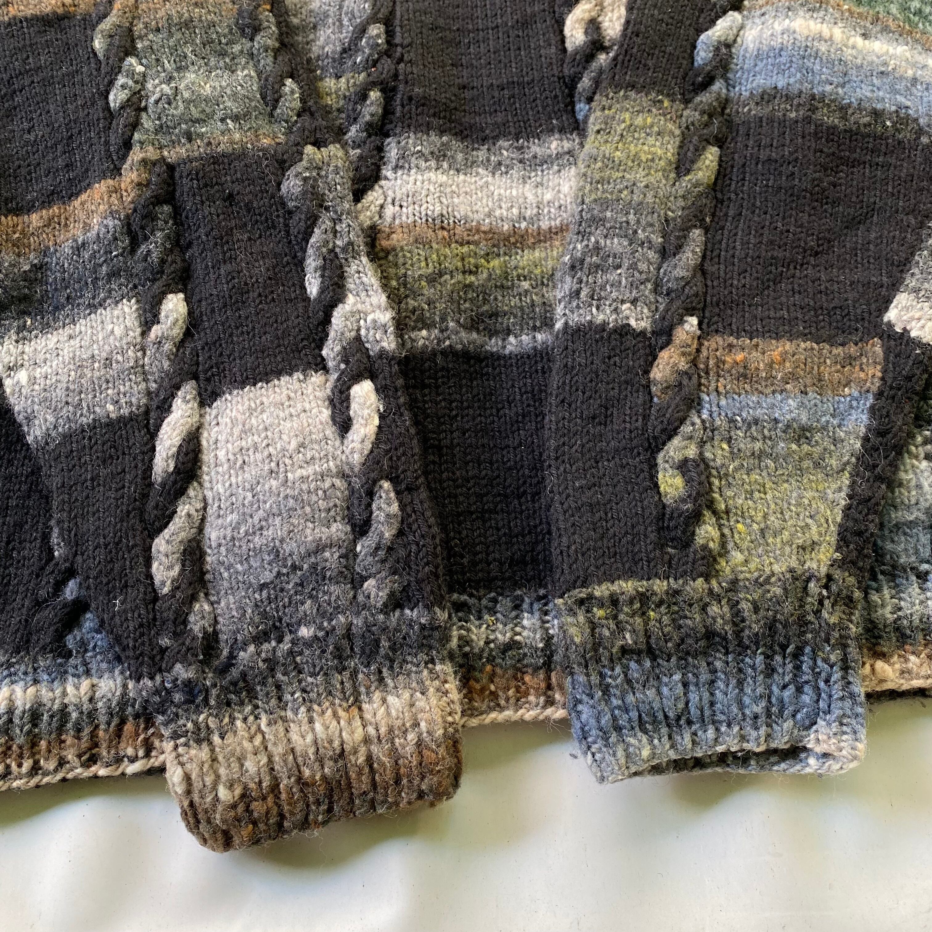 タグを見ても”Marilyn Davis”の為に作られた愛と労力、さらにデザイン性の高さを感じます。パネルでグラデーション、さらに立体感あるアラン織り、それをアシンメトリーなデザインでの仕上げ。コレは既製品では間違いなく出来ない、サンプリング資料としても取っておきたいスペシャルピースです。”昔のハンドメイド=荒削り”と言う概念を変える、洋服としてのクオリティーが圧倒的かつカッコ良くオシャレです。