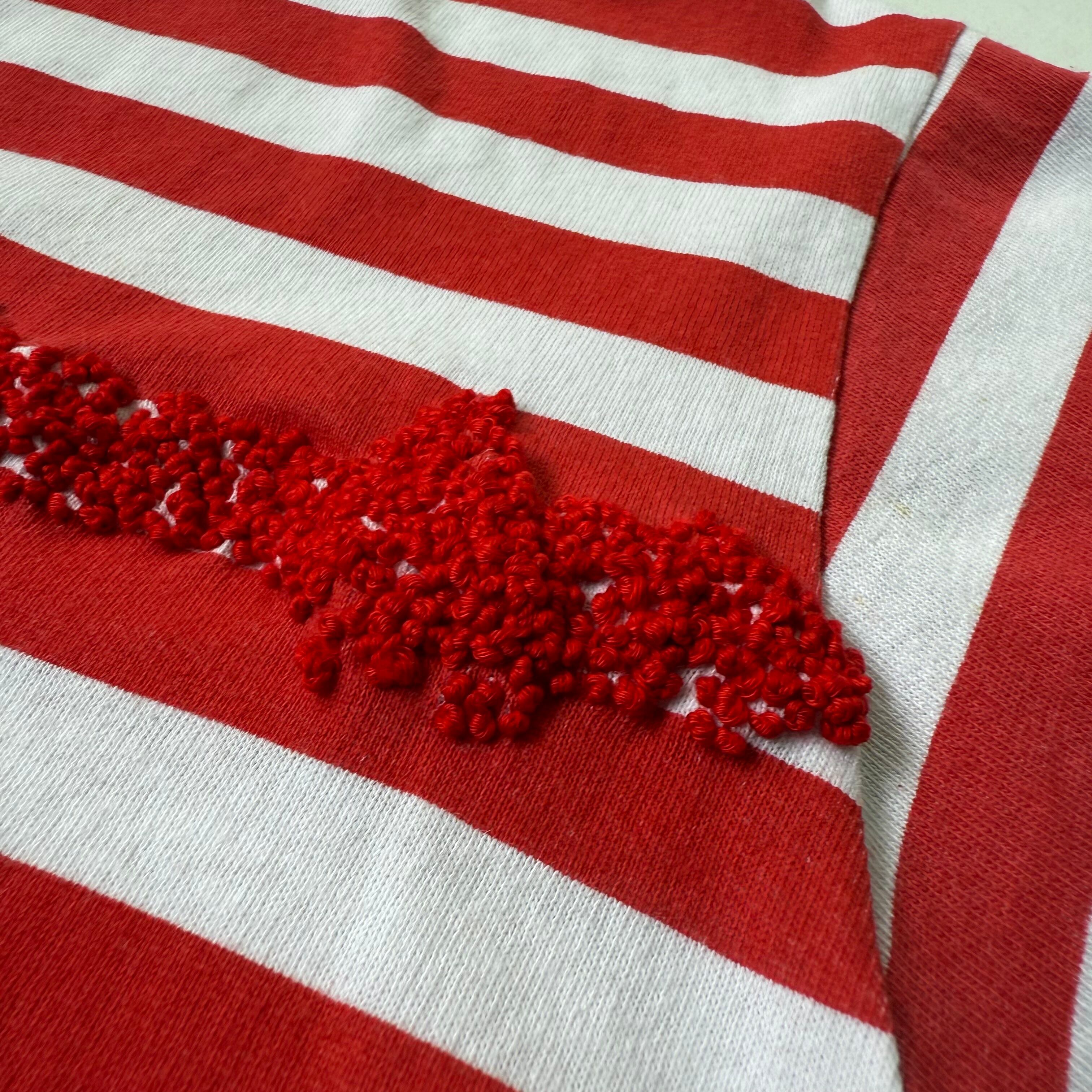 ちょっとした違和感と遊びを持たせた”ハンドメイドリメイク物”を作って貰いました。ボーダーTは、あくまでメッセージ性などなくサラッと着たい物なんで、やりすぎないよう何かが付いてるなぁくらいな感じで仕上げて貰っているのと、着た時に裏側(肌に)玉留めが来ないように着心地にも拘っています。