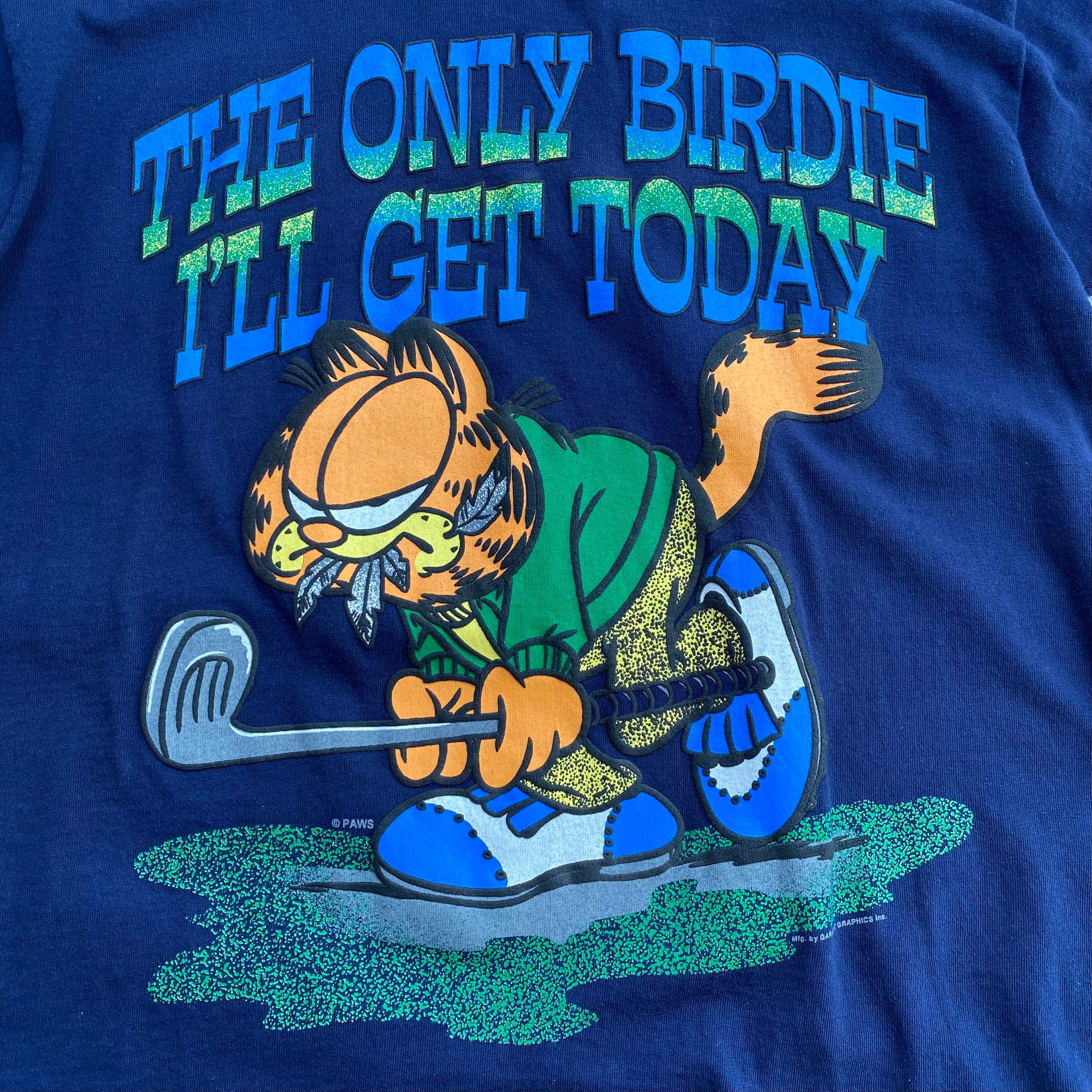 アメリカ古着ファンにも、人気の高いガーフィールド物ですが、コレは中でも一つ上をいくクオリティーかと思います。まず、このプリントを見るとブラックのアウトラインのみをプックリと膨らむプリント技法にして塗り絵のような立体感を表現している所、さらにかわいいシーンを切り取った物が多いガーフィールドの中では異例のゴルフクラブを叩き付け、目はキレてますね(笑)。