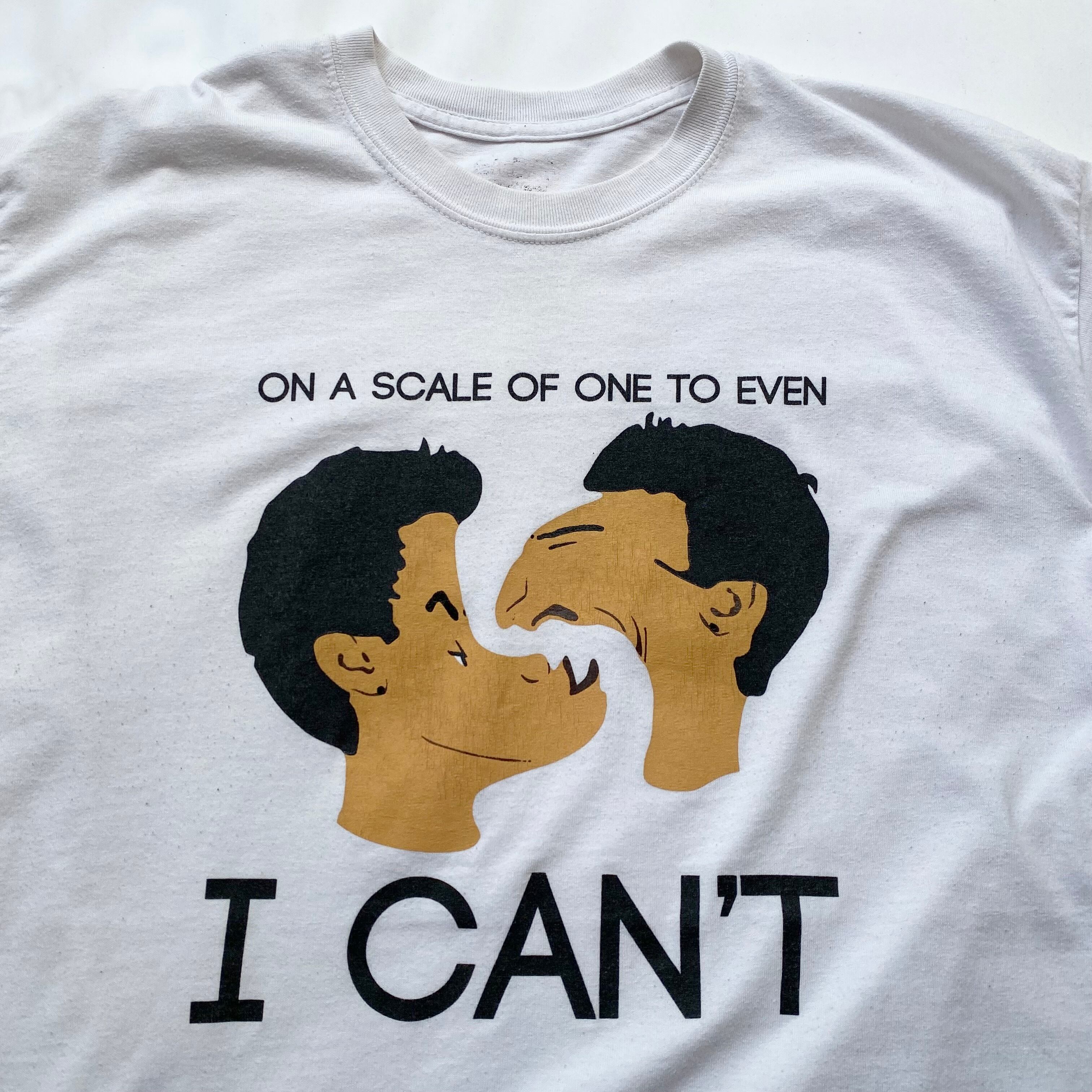 風刺が効いたデザインかつ、アメリカらしい面白いアプローチ。ボクは1VS1よりも、”4人以上”人がいる場が苦手です。苦手な人と1vs1になる場面、このTシャツを着ていたら中々ウィットなヤツだなって思われるかもしれませんね。