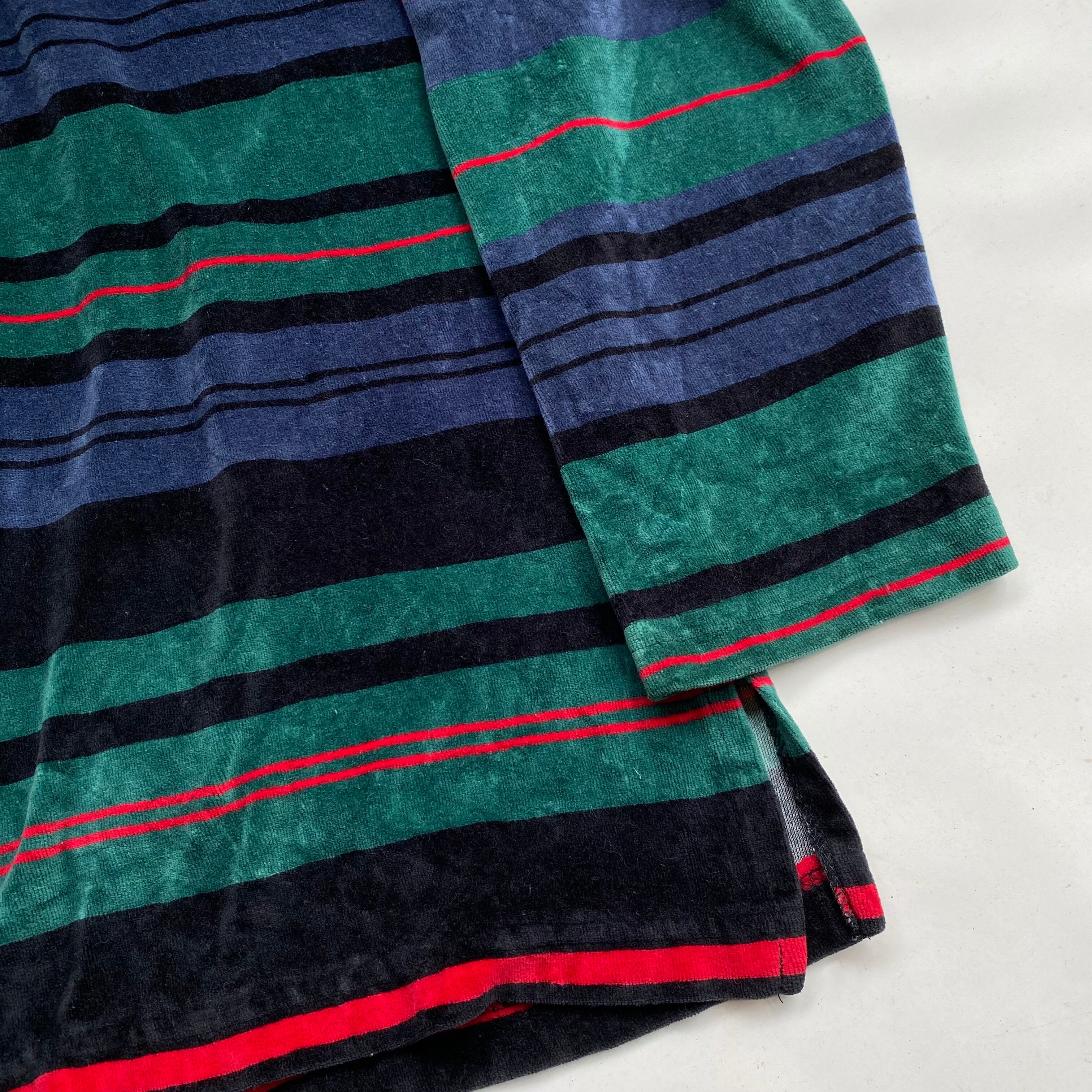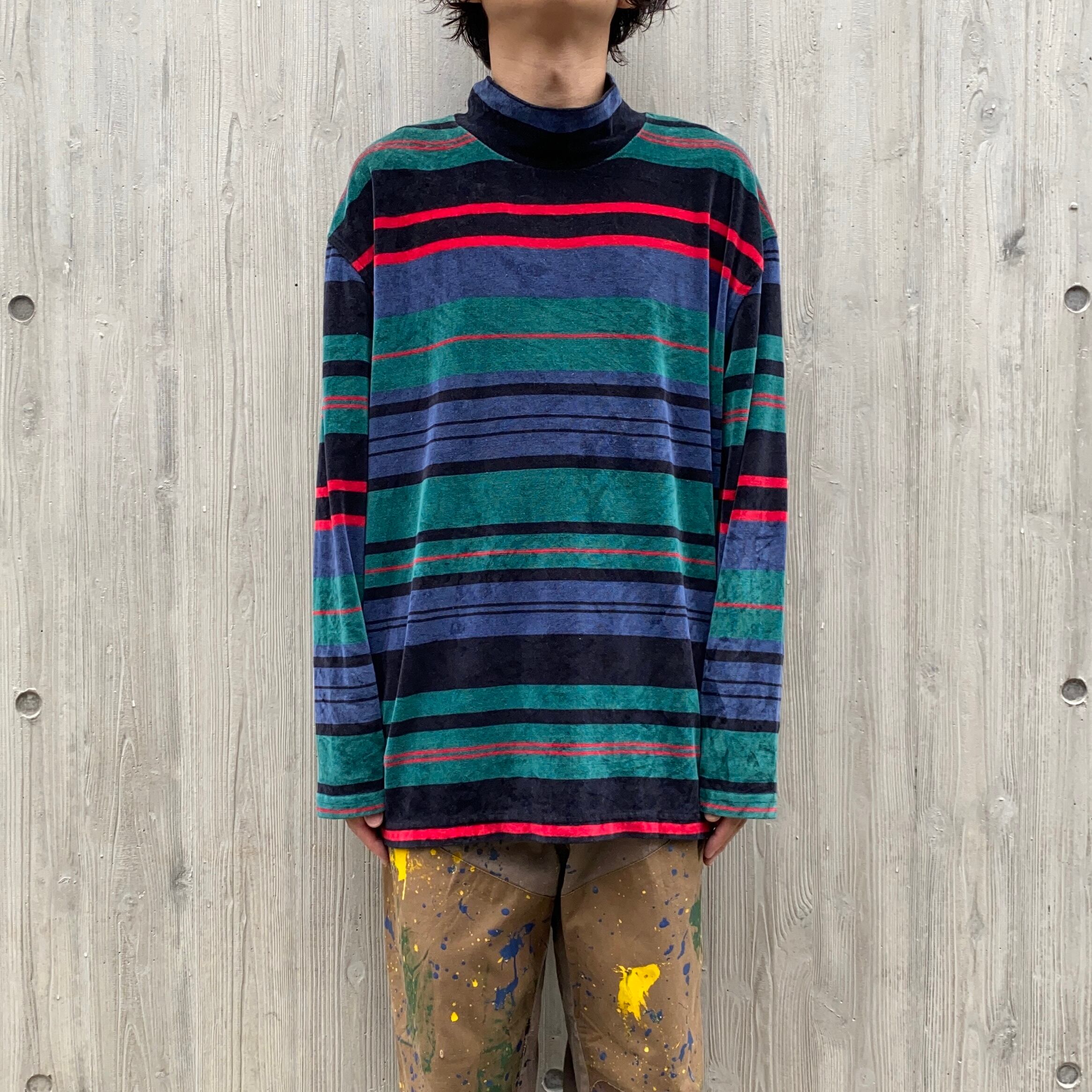 ベロアでボーダーでモックネック、さらにルーズサイジングで何だかとっても怪しげな所がいいです。決して爽やかでない怪しげな配色に変則的なピッチのボーダー、夜道を怪しげに歩けば職質です(笑)。こう言うノリだと大体サイズが小さいので、このサイジングは珍しいかと思います。