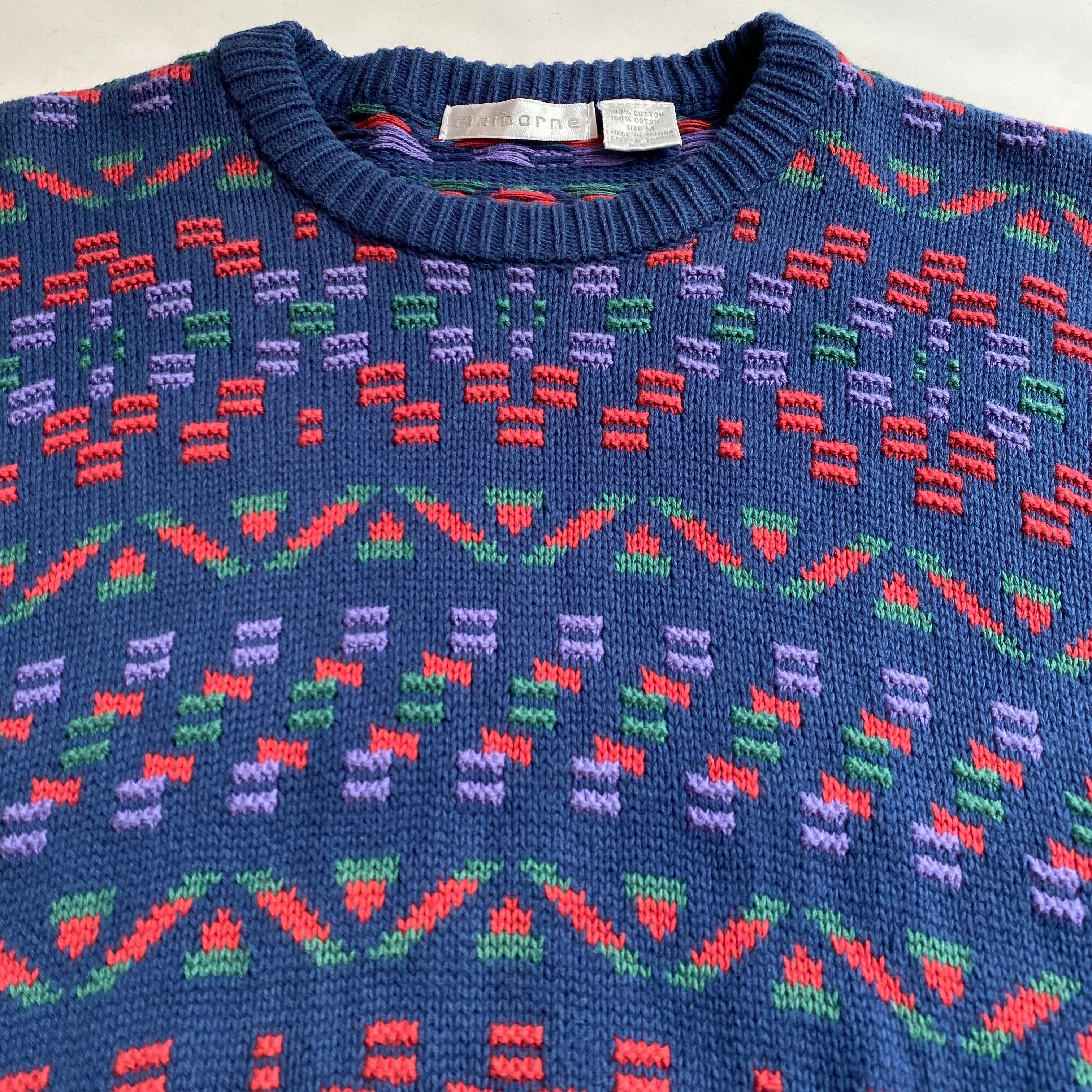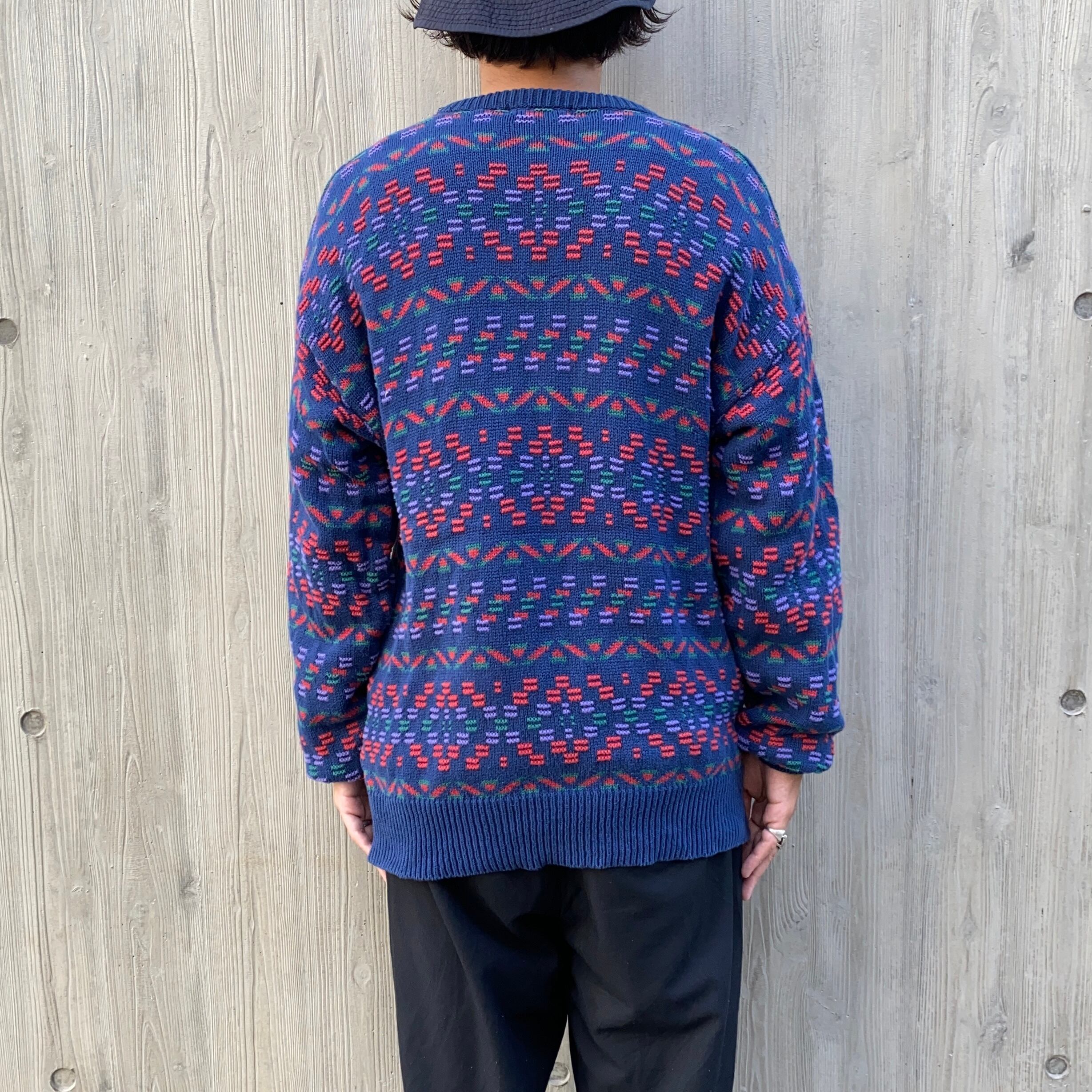 80’sらしい、かわいくてキャッチーな柄ですが、柄部分の編みを変えた事で立体感ある仕上がりになっています。何という柄かは分かりませんが、”バーズアイ”柄をキャッチーに遊びを入れたらこんな感じの仕上がりになるのかなぁと思いました。コットンなんで扱いやすいのも嬉しいですね。男女問わず、どうでしょうか?