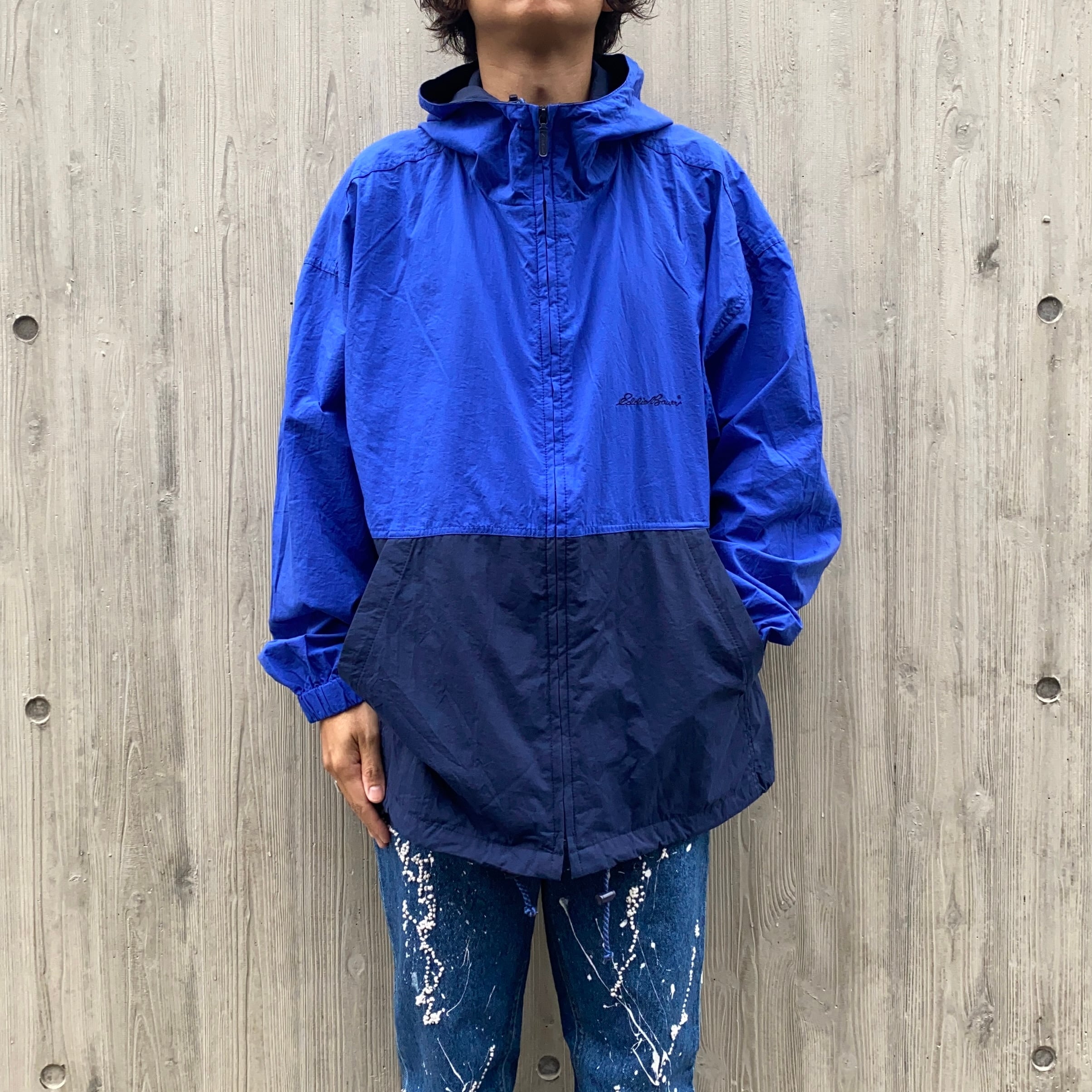 80’s頃の”Eddie Bauer”の2トーンナイロンジャケットです。少しバランスがおかしな胸ロゴ刺繍、口元まで隠れる立ち襟仕様でルーズなサイジング、ただジップを閉めてしっかり着るだけでも90’sブリットポップ感も出せるクールな1着かと思います。