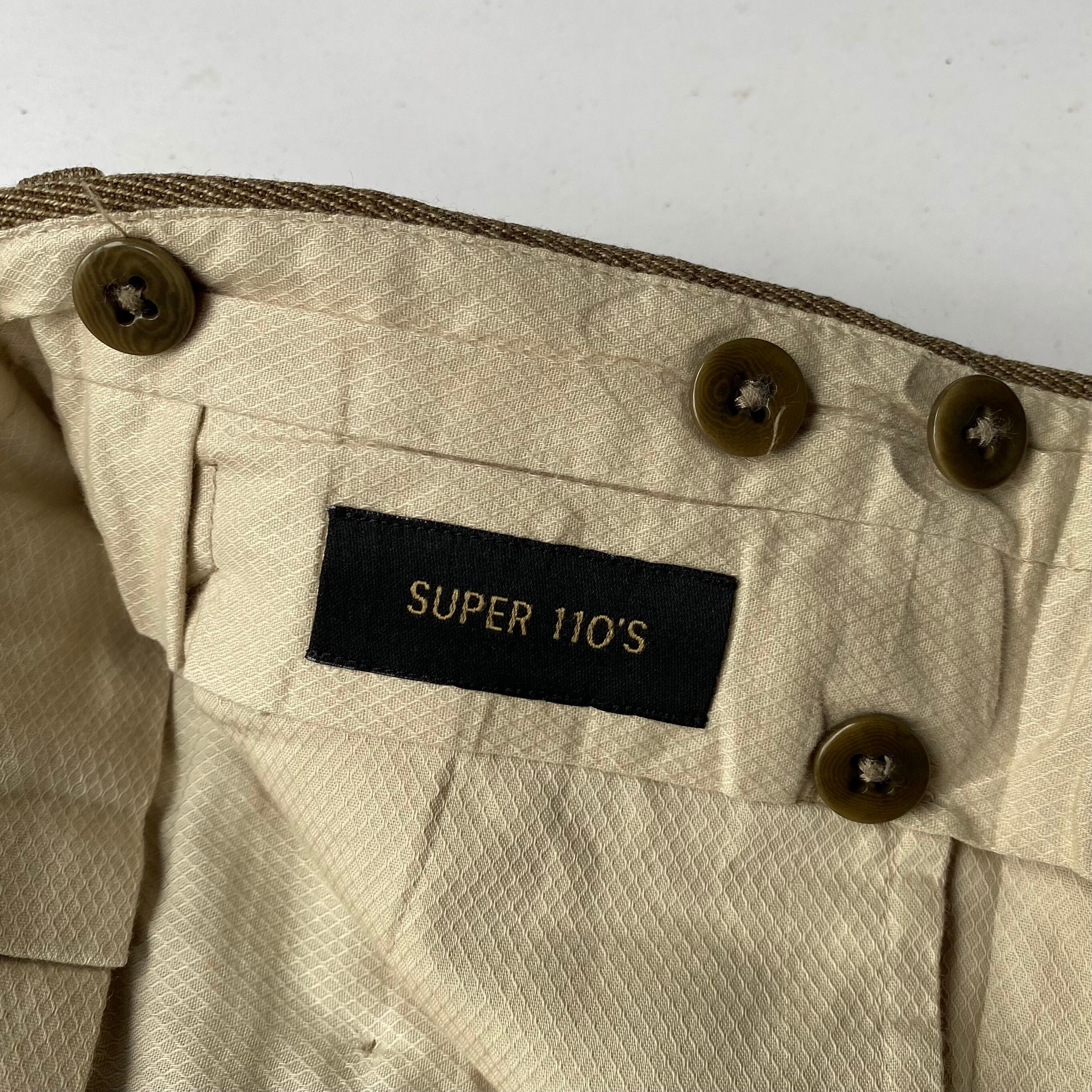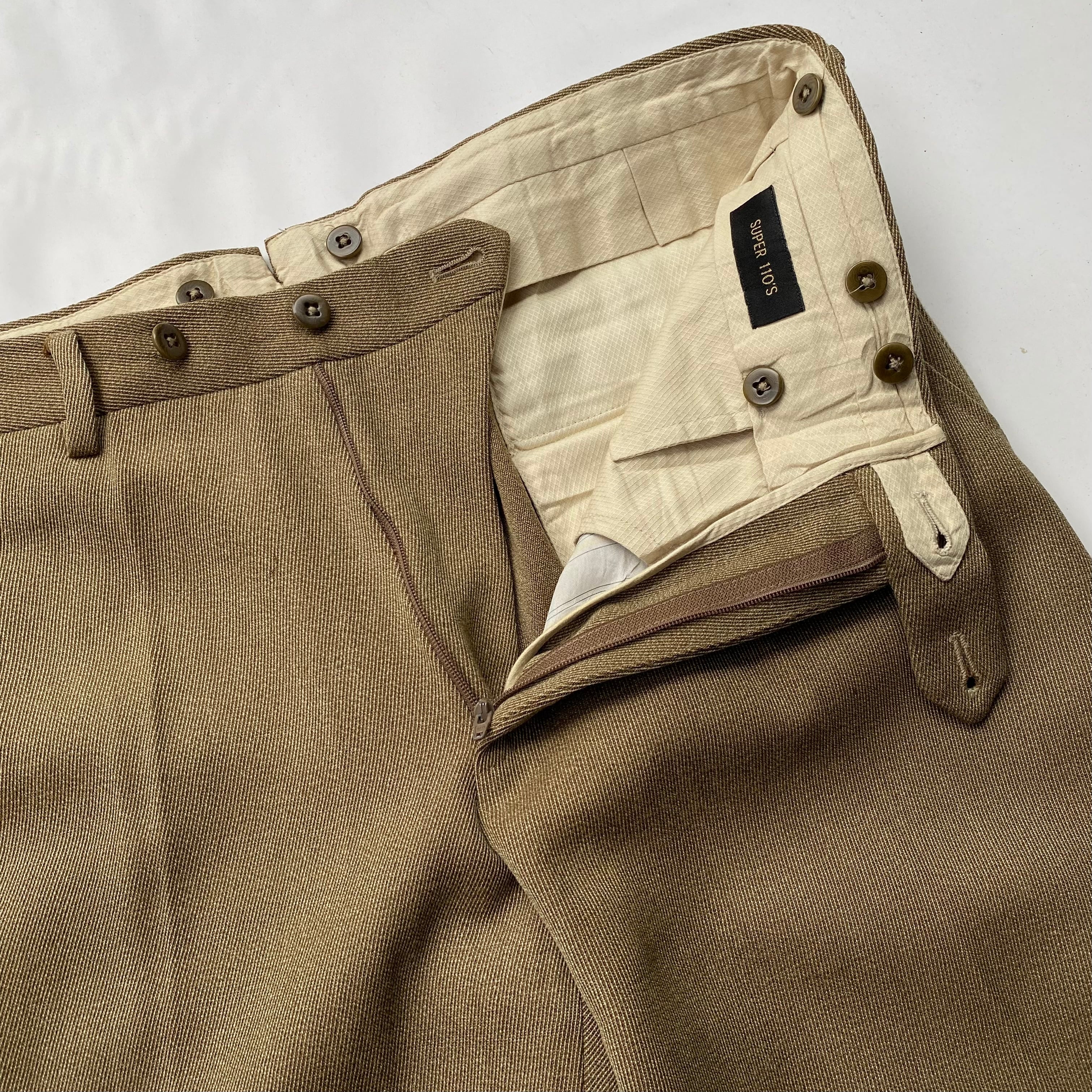 ブランドは、イタリアのメゾンブランドなどのテキスタイルも請け負っている”MODESTO BERTOTTO”だけあり、Super 110’s (ウールの世界標準規格を現す指標の数値) =高級衣類にも使われるマテリアルなのでとても高品質/高級なしっかりとした生地感です。また、内側にはサスペンダーボタン付きで、シルエットもスッキリとしていて、色味はミリタリー調なカーキなのに、上品さと品も兼ね備えた1着です。