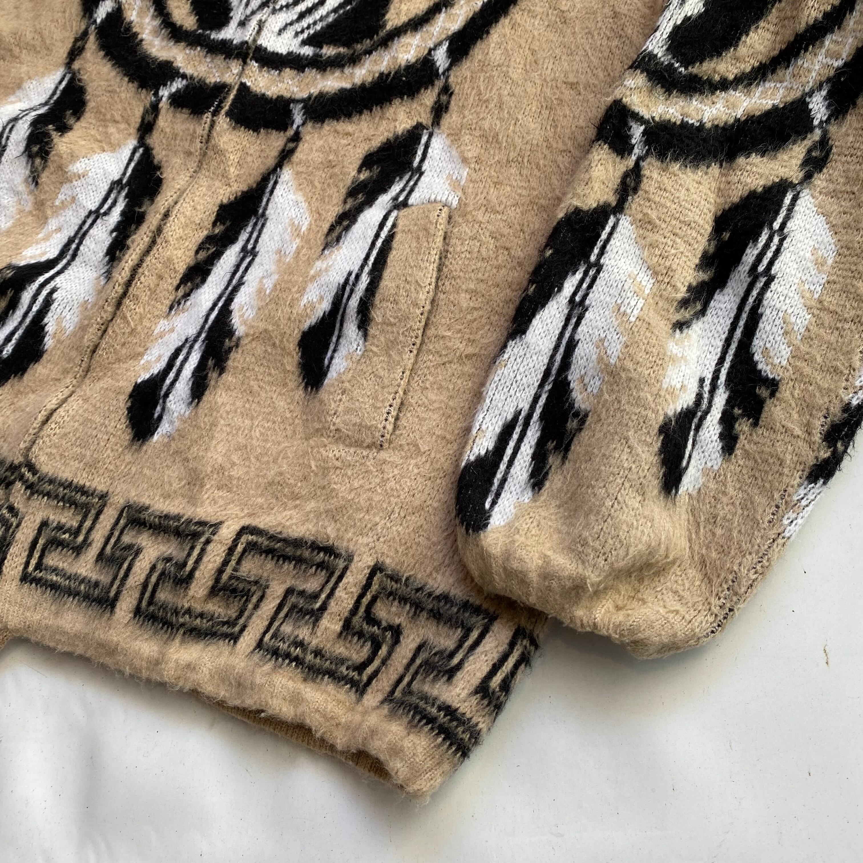 毛足の長いシャギーなモヘアライクなニットの質感に対して、狼のネイティブ柄と言うギャップが凄く良いです。
