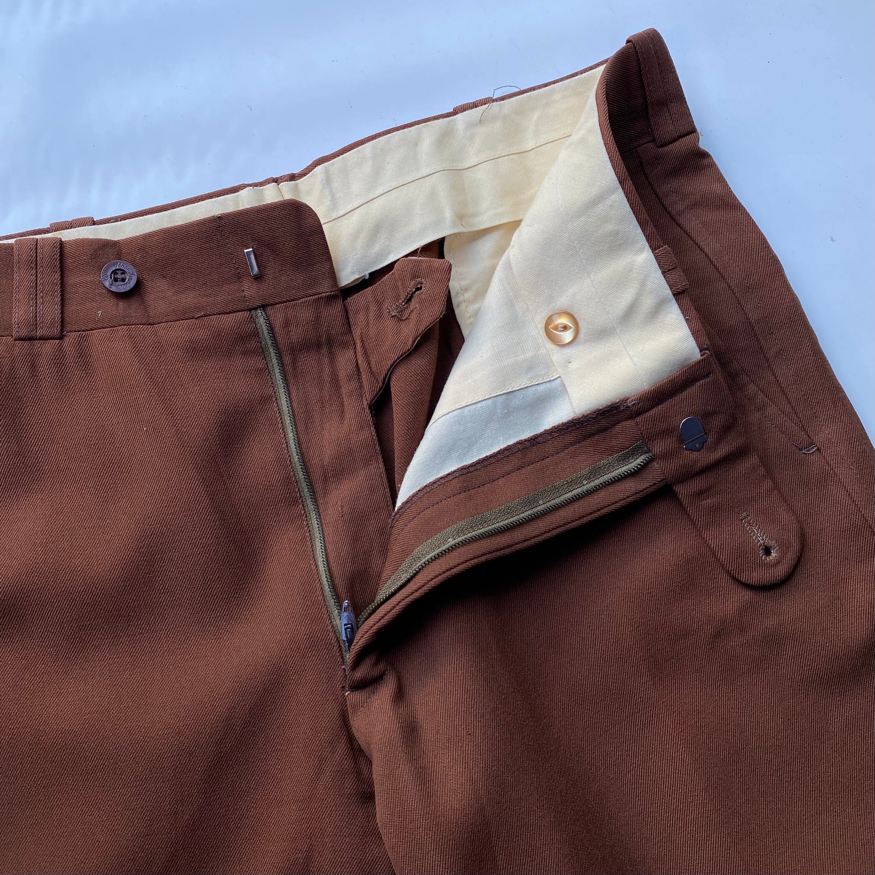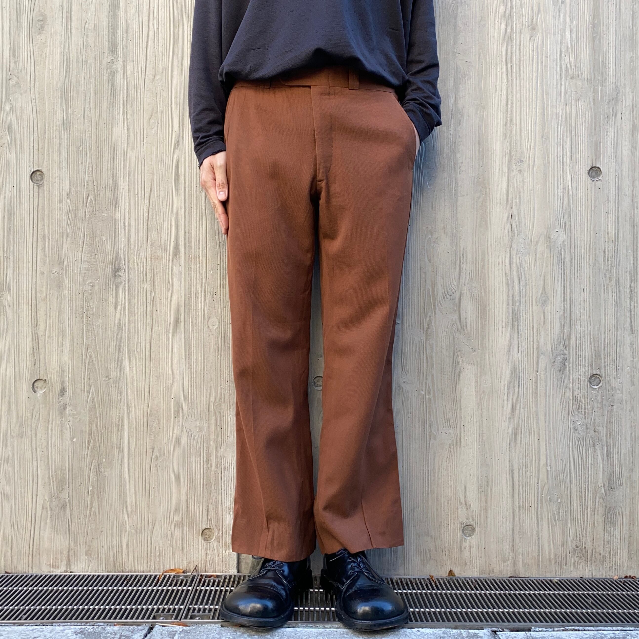こちらも放課後の思い出としては珍しいノータックスラックス。ミルクチョコレートのような色味に、まっすぐストレートなんですが、この年代のパターンにありがちな少しフレアに見えるシルエット。コレが苦手で仕入れていなかったのですが、数年タックスラックスをやり続けた反動からか、ちょっとダメな感じがかわいく思えてきました。